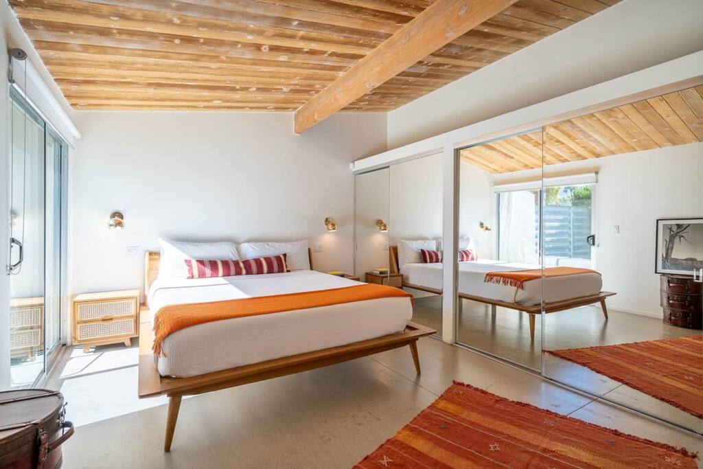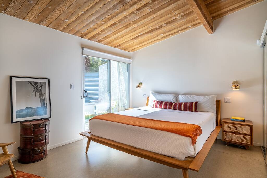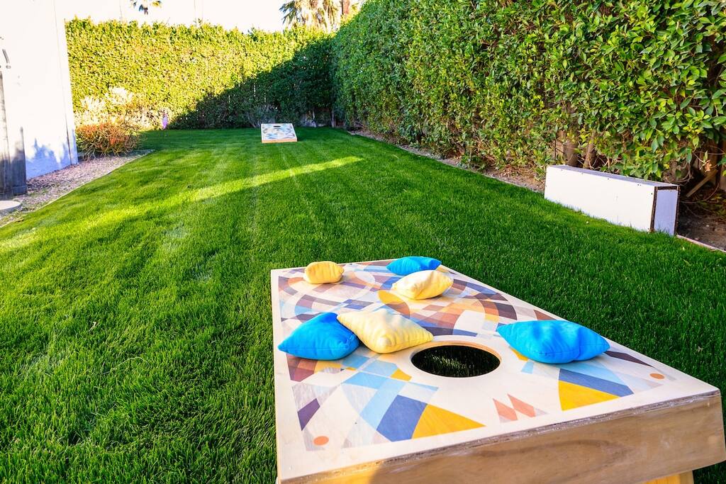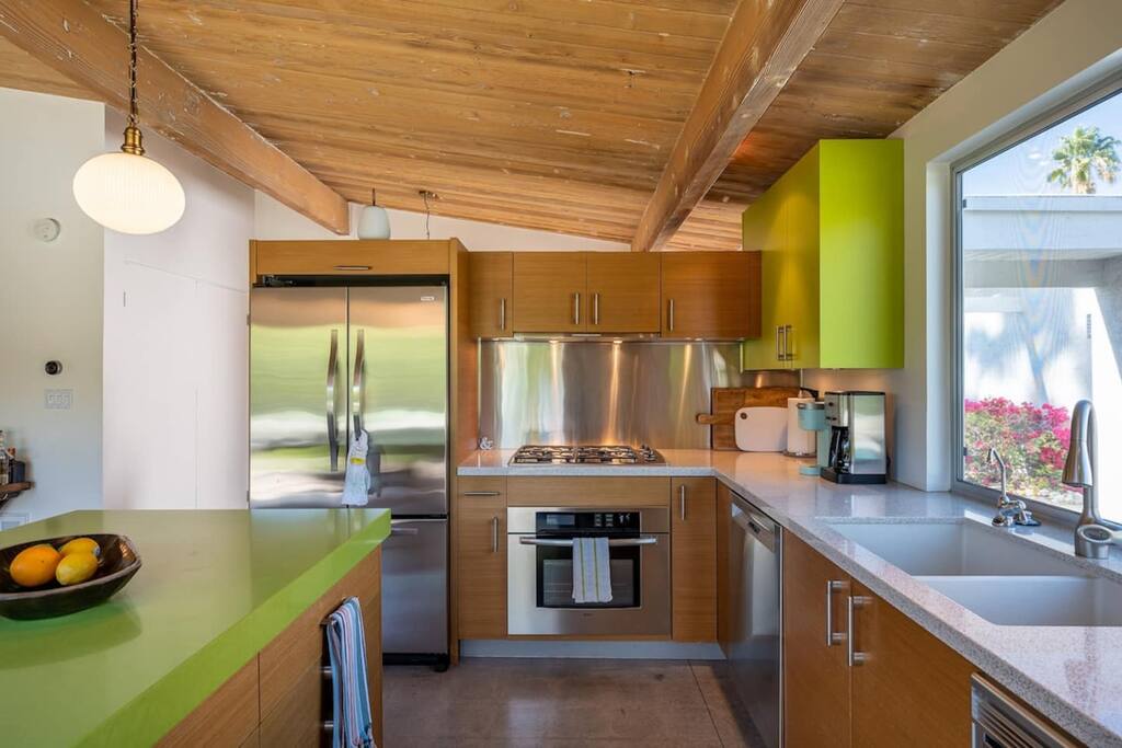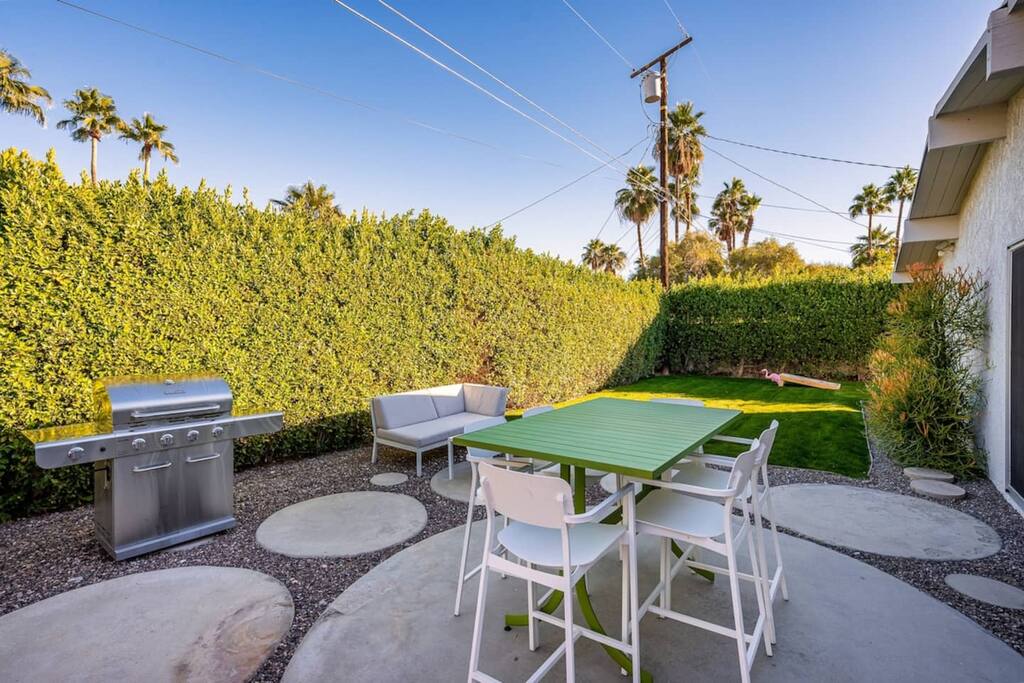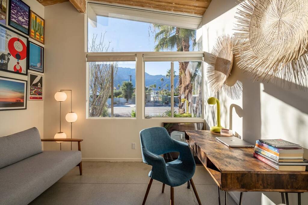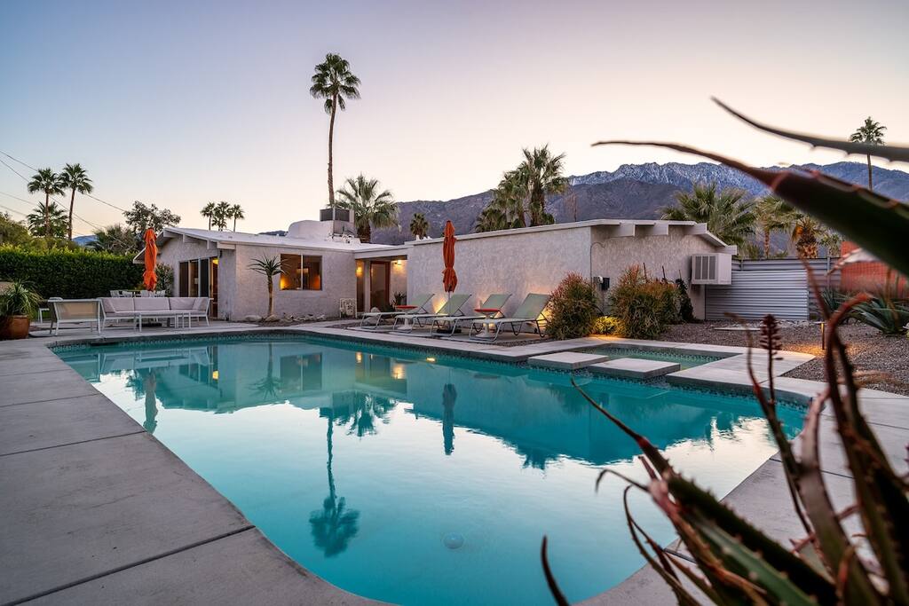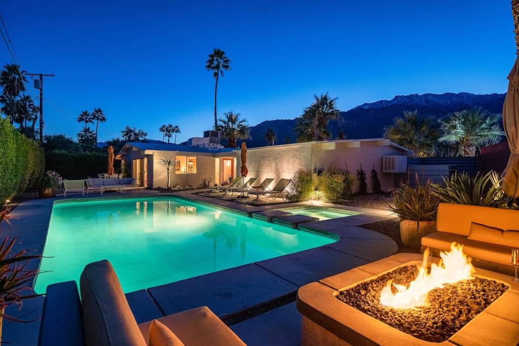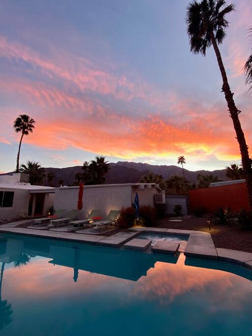 Mid-century open floor plan with Southwestern design flair delivers you an incredibly relaxing and inviting space, both inside & out. This house features 2 bedrooms with King-size beds, 2 full bathrooms, spacious living room, office/den, Sonos integrated sound system, record player, multiple outdoor seating & entertaining areas, pool, hot tub, fire pit and AC throughout. The open kitchen, dining and living rooms look out to the green yard & hedges as well as the sparkling blue pool. Feel at home in a fully stocked, modern kitchen with stainless steel appliances, dishwasher, microwave, coffee makers, outdoor BBQ pit and so much more. The kitchen island / bar countertop makes for a great focal point as you prep meals, serve apps or beverages with the adjacent dining area serving as a natural extension. The vintage appointed living room offers a variety of seating and relaxation spots, include large, deep sofa, classic mid-century lounge chair, and smart tv, all accented by newly installed clerestory windows. The primary bedroom features a California King bed, an ensuite bathroom with walk-in rain shower, large double closet and direct access to a private seating area. The second bedroom also features a California King bed and immaculate views of the San Jacinto mountains. This room includes a large closet, beautiful teak wood & cane armoire, and fantastic energy. The converted middle room now serves as an office / den area with incredible views & light through towering clerestory windows. If you need to work or read or relax while away from home, this is the perfect place to do it. As beloved as the interior home is, the outdoor space is the highlight of the property. Combining a resort style saltwater pool, hot tub, fire pit and striking mountain views, with a dining table for 6, multiple seating areas including poolside chaise lounges and 3 thoughtfully places umbrellas for those shade seekers. Brilliant green Ficus hedges provide sanctuary, with unobstructed mountain and sky views. The BBQ awaits the outdoor chefs who can take in the entirety of the yard and views while grilling. And if you need a little more outdoor activity, in addition to multiple pool floats and games, a bespoke cornhole game awaits you in the yard with revealing mountain views. There is a fee to heat the pool & hot tub depending on the time of year, message us for details. All so close to everything Palm Springs, Coachella Valley and Joshua Tree, while feeling so far away. We just know you’re gonna love it!