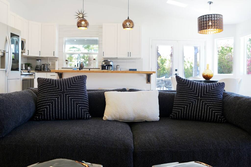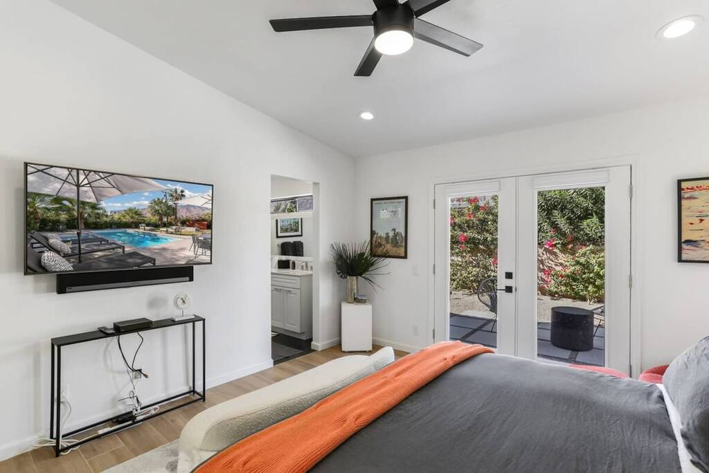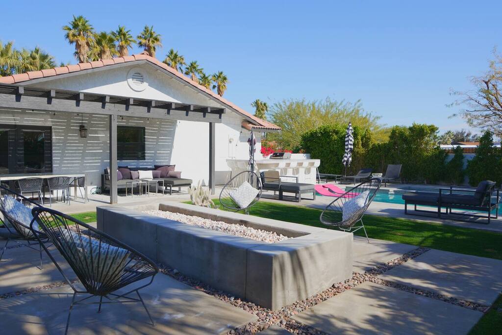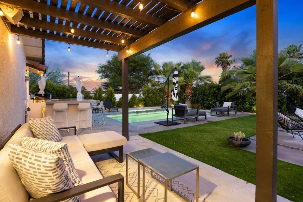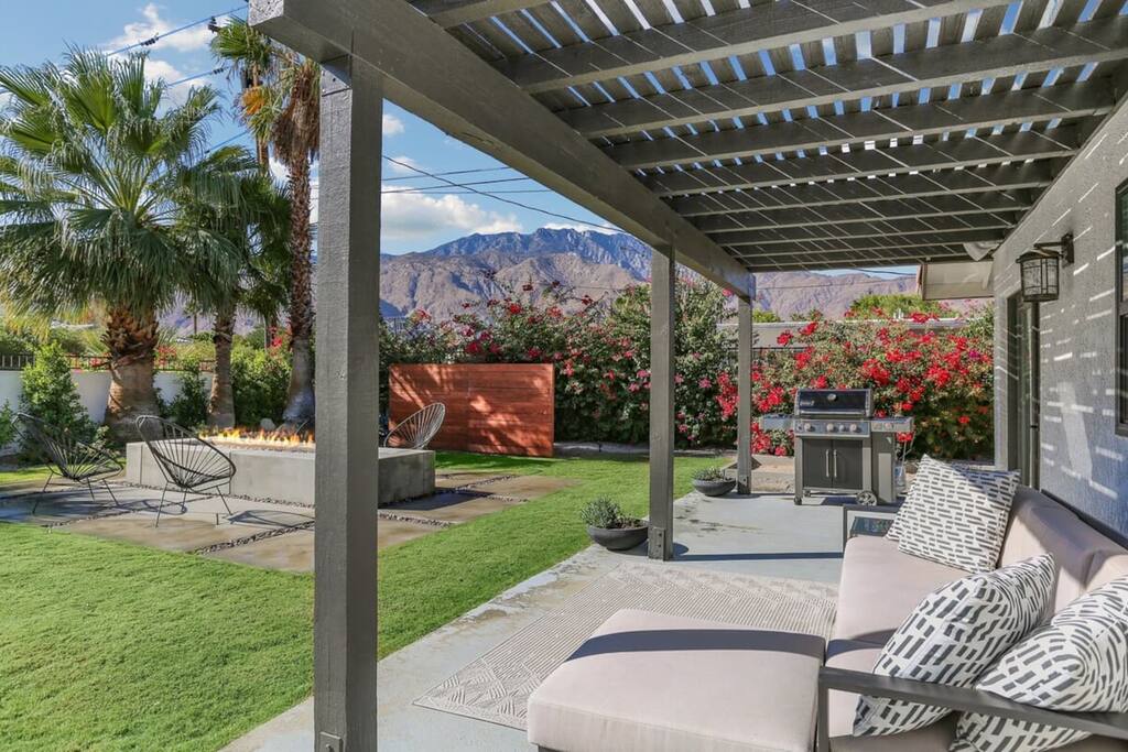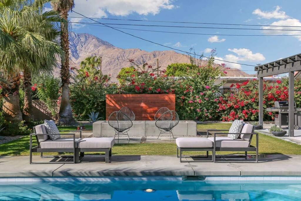 Welcome to The Deborah House, a bright 3BR/2BA Palm Springs retreat designed for comfort, style, and the perfect desert escape. Step inside the open floor plan where a fully equipped kitchen makes dining easy—whether you’re preparing gourmet meals or casual bites. The living room features a Smart TV, indoor fireplace, and cozy seating, ideal for family movie nights or relaxing with a book and glass of wine. The primary suite offers a king bed, en-suite bath, west-facing views, and Smart TV. The second bedroom includes a queen bed, while the third bedroom has two twin beds—perfect for kids or friends. A washer/dryer and 3-car garage add convenience for longer stays. Outside is where the magic happens. Lounge by the private pool and spa, take in breathtaking San Jacinto Mountain views, or gather around the fire pit under desert stars. A brand-new outdoor bar & BBQ area with seating is perfect for al fresco dining, while the private bocce ball court adds fun for families and groups. Whether you’re sunbathing, working remotely poolside, or planning a family vacation, couples’ getaway, or girls’ weekend, The Deborah House delivers the ultimate Palm Springs experience. Pool & spa heating available October–May for $75/day, arranged in advance. Palm Springs City ID #004578