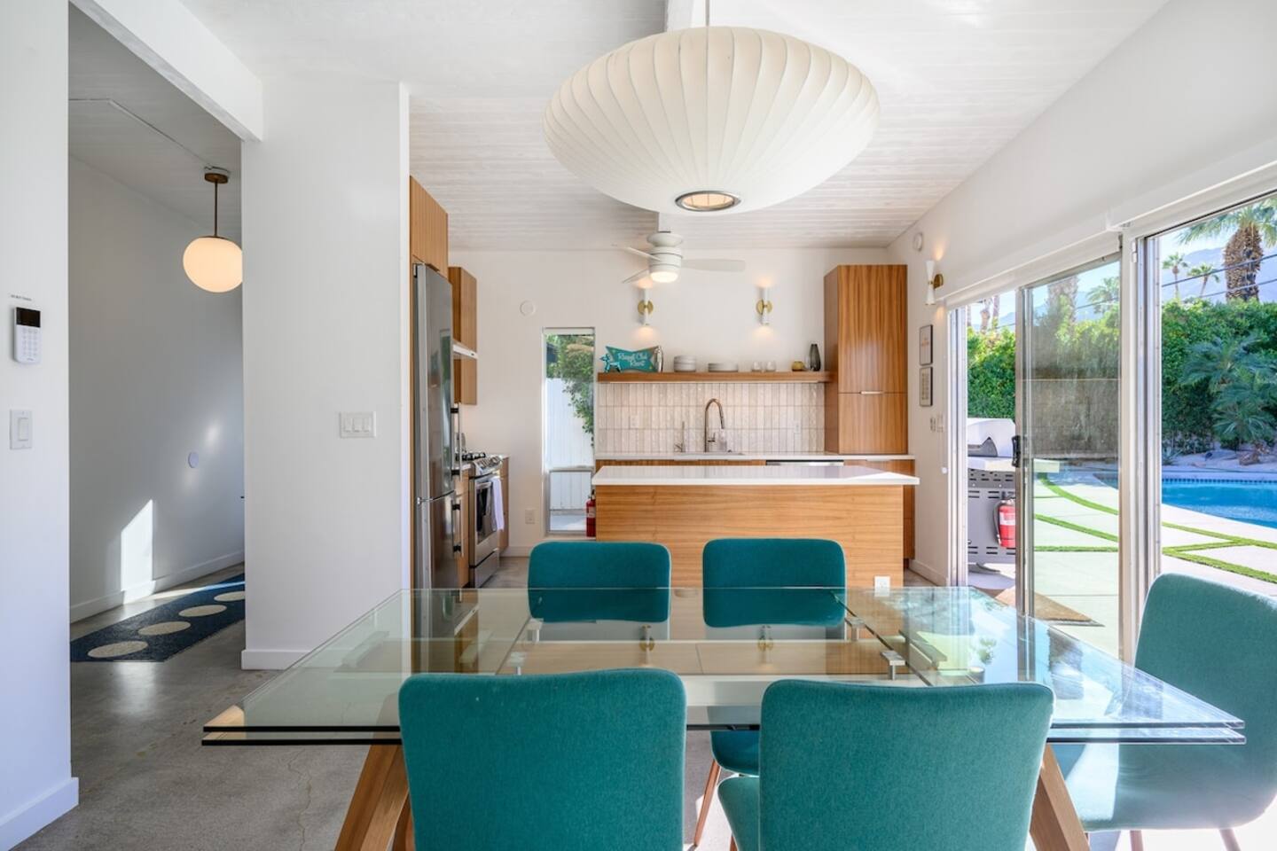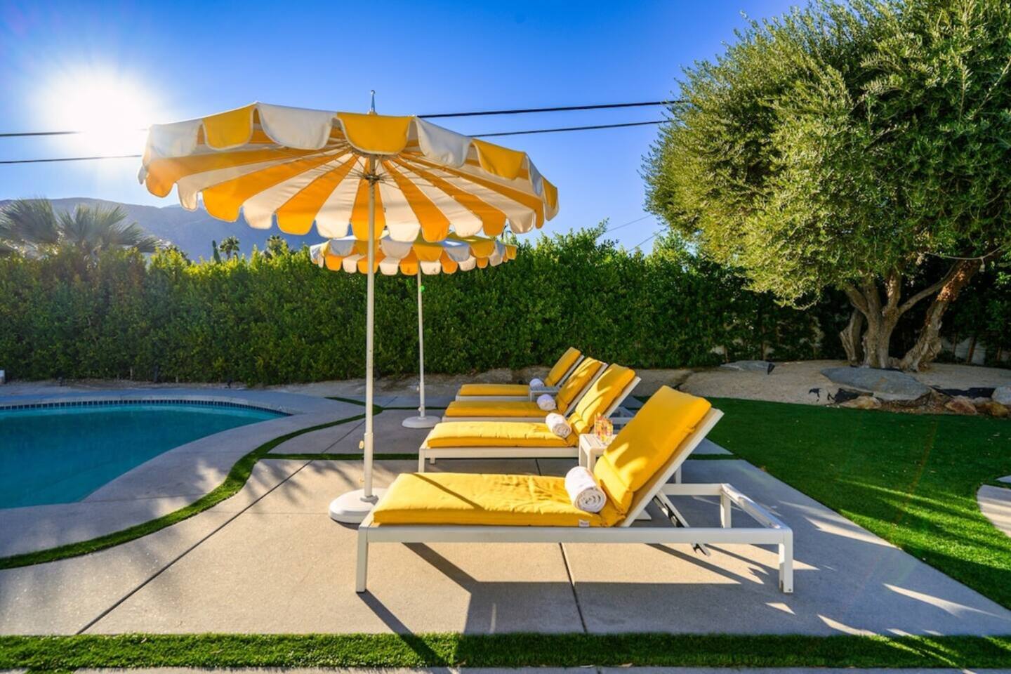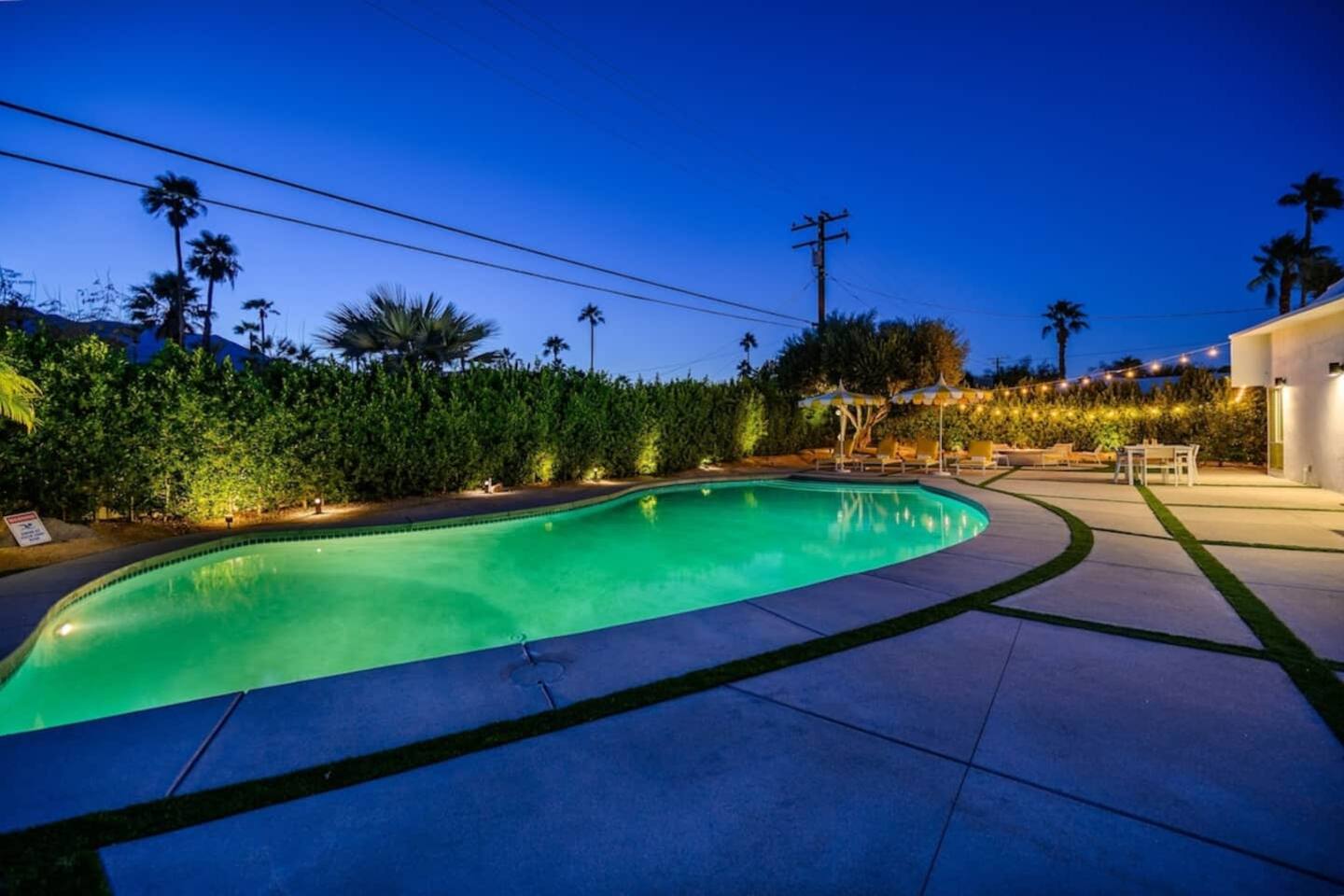 With an open floor plan and stylish mid-century design, this home offers 3 bedrooms, 2 bathrooms, a fully equipped kitchen, spacious living room, dining area, and inviting outdoor spaces with a private pool, hot tub, and mountain views. Prepare meals in the modern kitchen featuring stainless steel appliances, dishwasher, microwave, coffee maker, and all the essentials for cooking at home. The adjacent dining area seats six comfortably, while the living room offers a chic sectional, lounge chair with ottoman, and Smart TV. The primary bedroom includes a king bed, ensuite bathroom with rain shower/tub, dedicated workspace, and direct access to the hot tub. The second bedroom features a queen bed and Smart TV, while the third bedroom is ideal for groups or families with two double beds, Smart TV, and generous closet space. These two bedrooms share a modern hall bathroom with tub and shower. The outdoor area is the highlight of the home, offering a resort-style pool, above-ground hot tub, fire pit with seating, outdoor shower, chaise lounges, and a dining table for six—all framed by striking mountain views. Pool heating is available for an additional fee depending on the season; message for details. Perfect for family vacations, couples’ retreats, girls’ getaways, or a remote work escape with sunshine and mid-century style. Please note: Guests do not have access to the security alarm. Any fees incurred from false alarms will be billed to the guest.