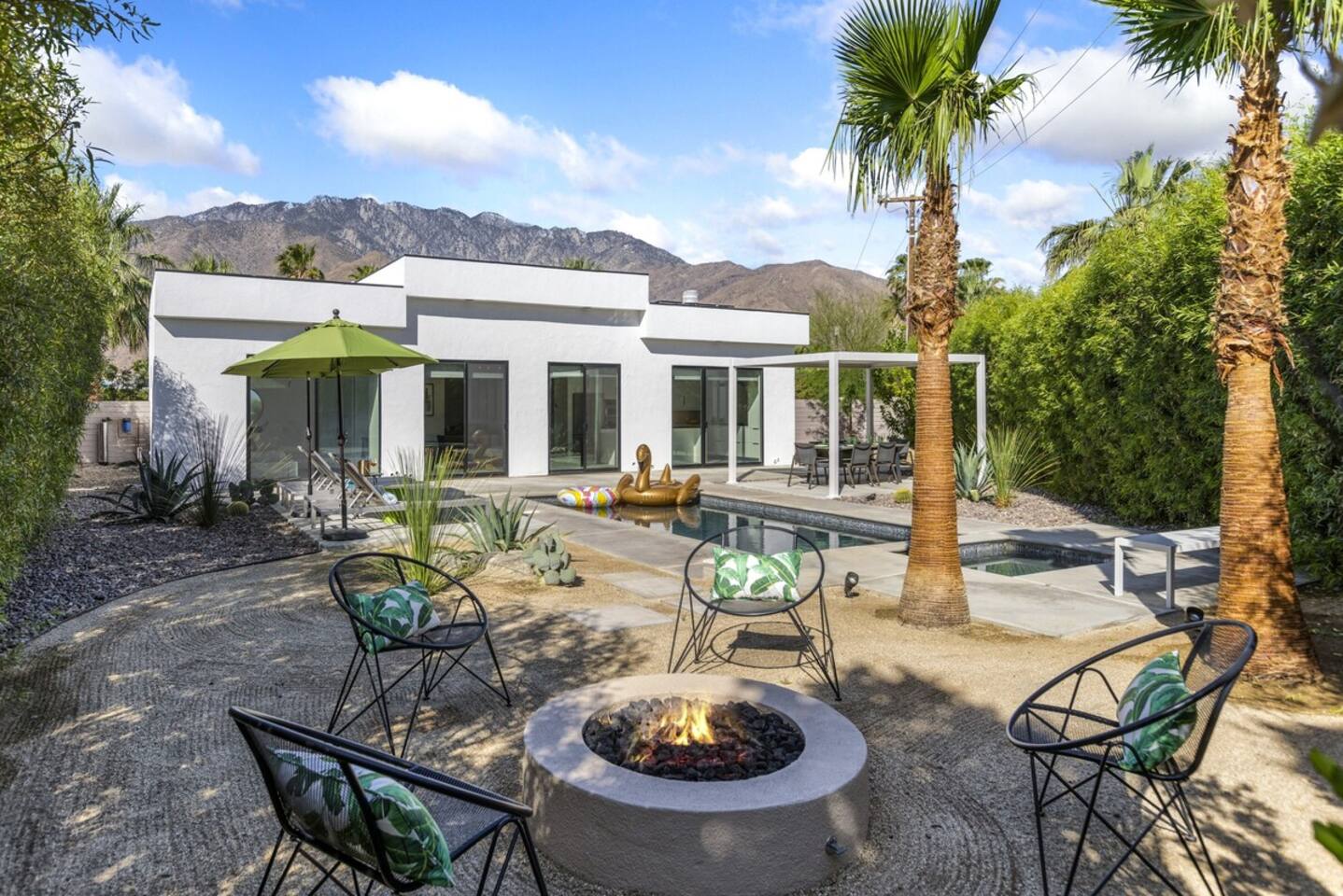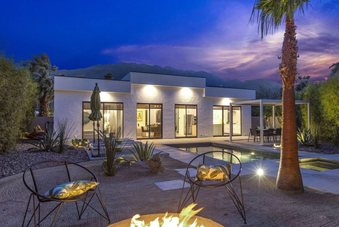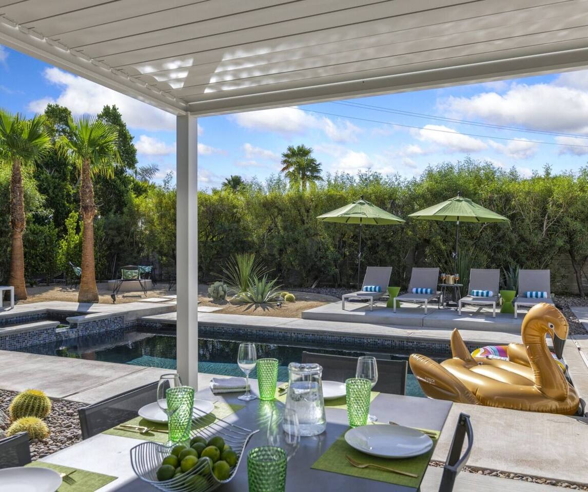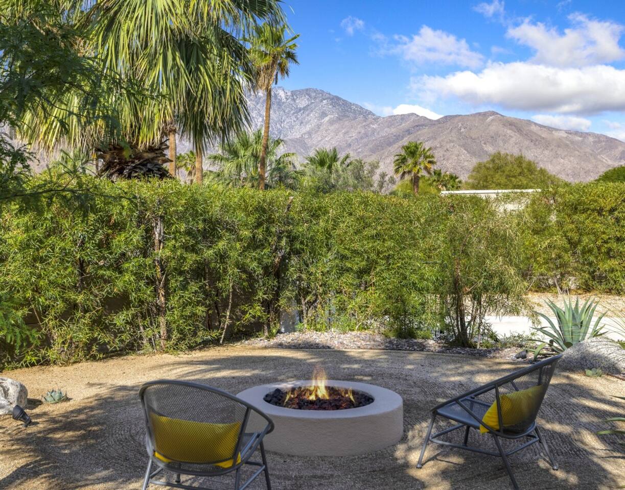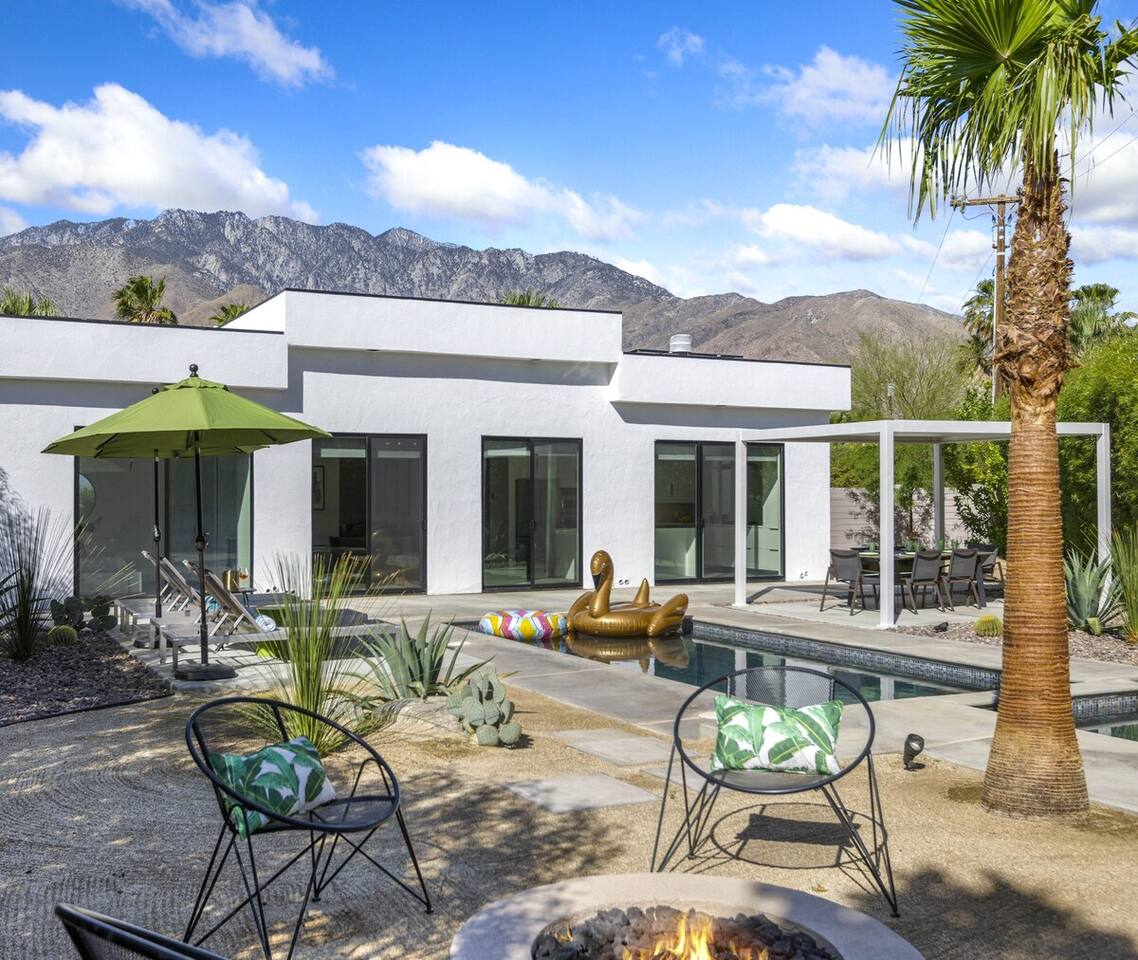 Completely remodeled in 2021, Desert Modern Retreat blends sleek modern design with high-end comfort. Soaring ceilings, brand-new finishes, and curated furnishings set the tone for a luxury stay. Relax in the spacious living room with stunning mountain views, or step into your private backyard oasis with a sparkling pool, spa, firepits, and outdoor dining under the palms. Centrally located in a quiet, well-kept neighborhood just two blocks from Victoria Park, the home is only 5 minutes from downtown Palm Springs’ top dining, shopping, and nightlife. Perfect for couples, friends, or families, with premium amenities and thoughtful touches throughout. Highlights: 2 spacious bedrooms with premium mattresses (Tuft & Needle + Casper), Smart TVs 2 spa-inspired bathrooms with walk-in showers + solid stone soaking tub Chef’s kitchen with new appliances, fully stocked for cooking & entertaining Resort-style backyard: pool, spa (complimentary spa heat, pool heat available), firepits, chaise loungers, covered dining, BBQ grill Fiber internet (1 Gig) + mesh WiFi, desk & chair for remote work Smart TVs in living room + primary bedroom with streaming Attached 2-car garage, washer/dryer, central HVAC Your Palm Springs escape awaits. Licensed Vacation Rental | City of Palm Springs ID#4984