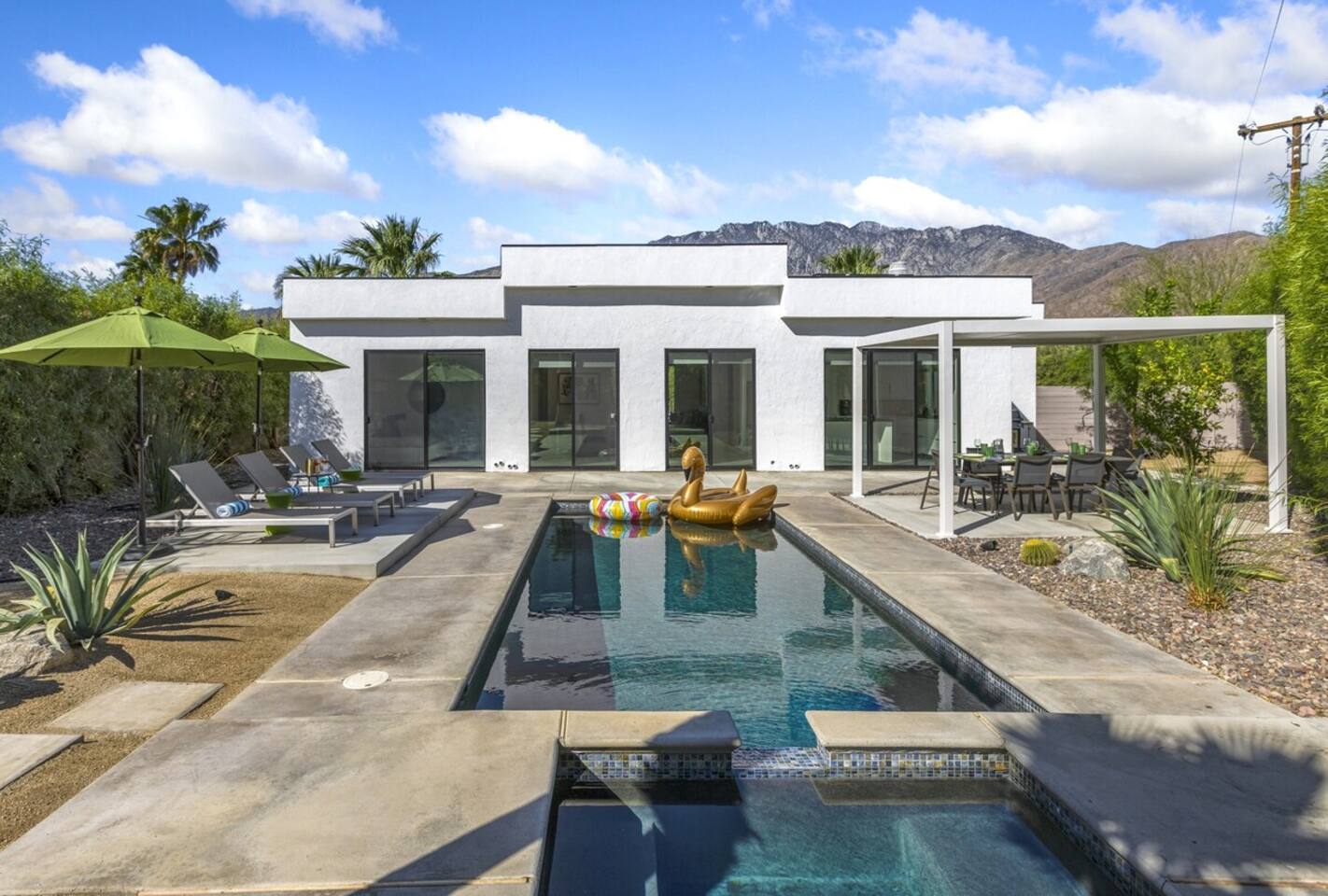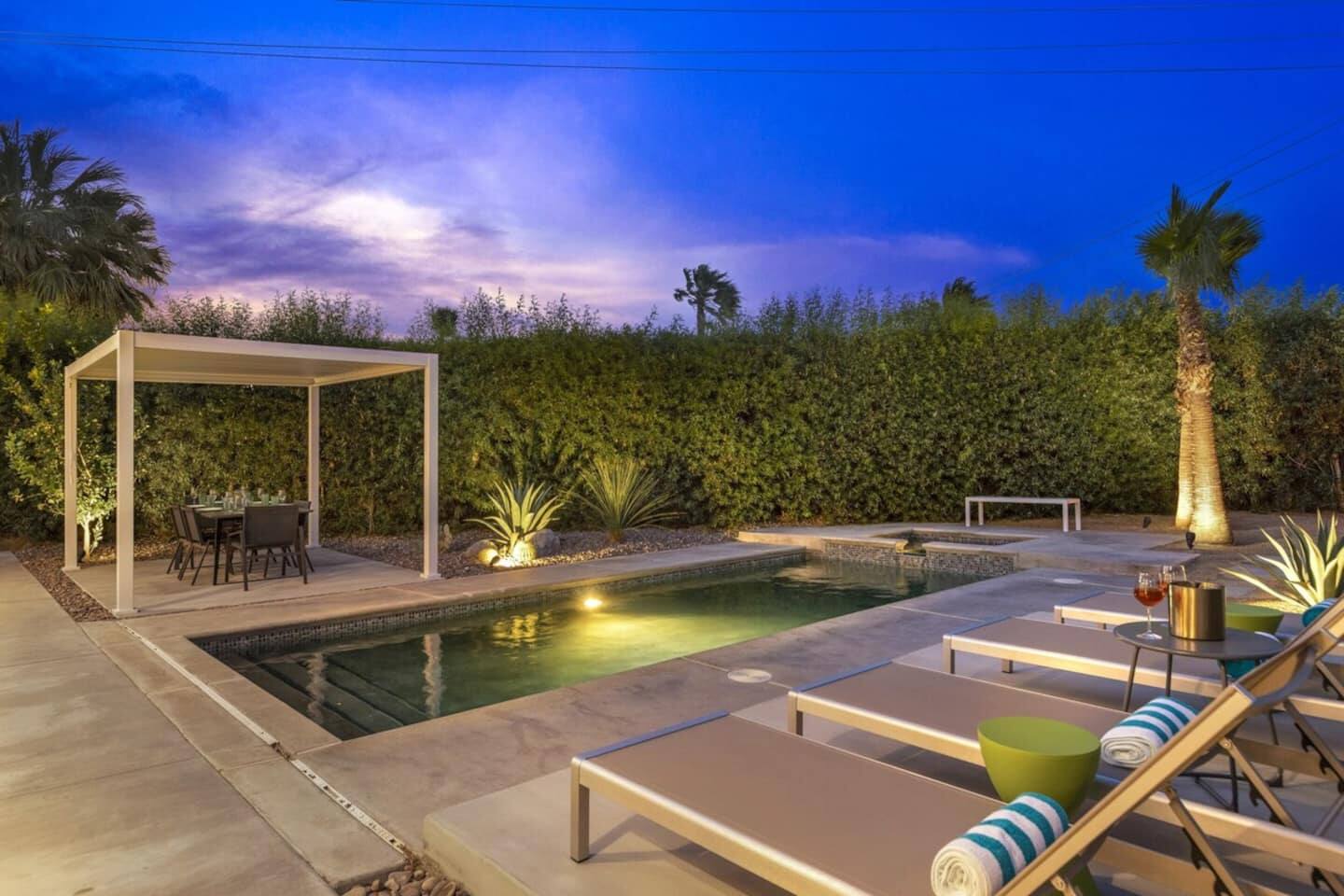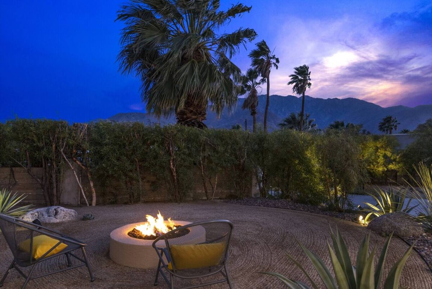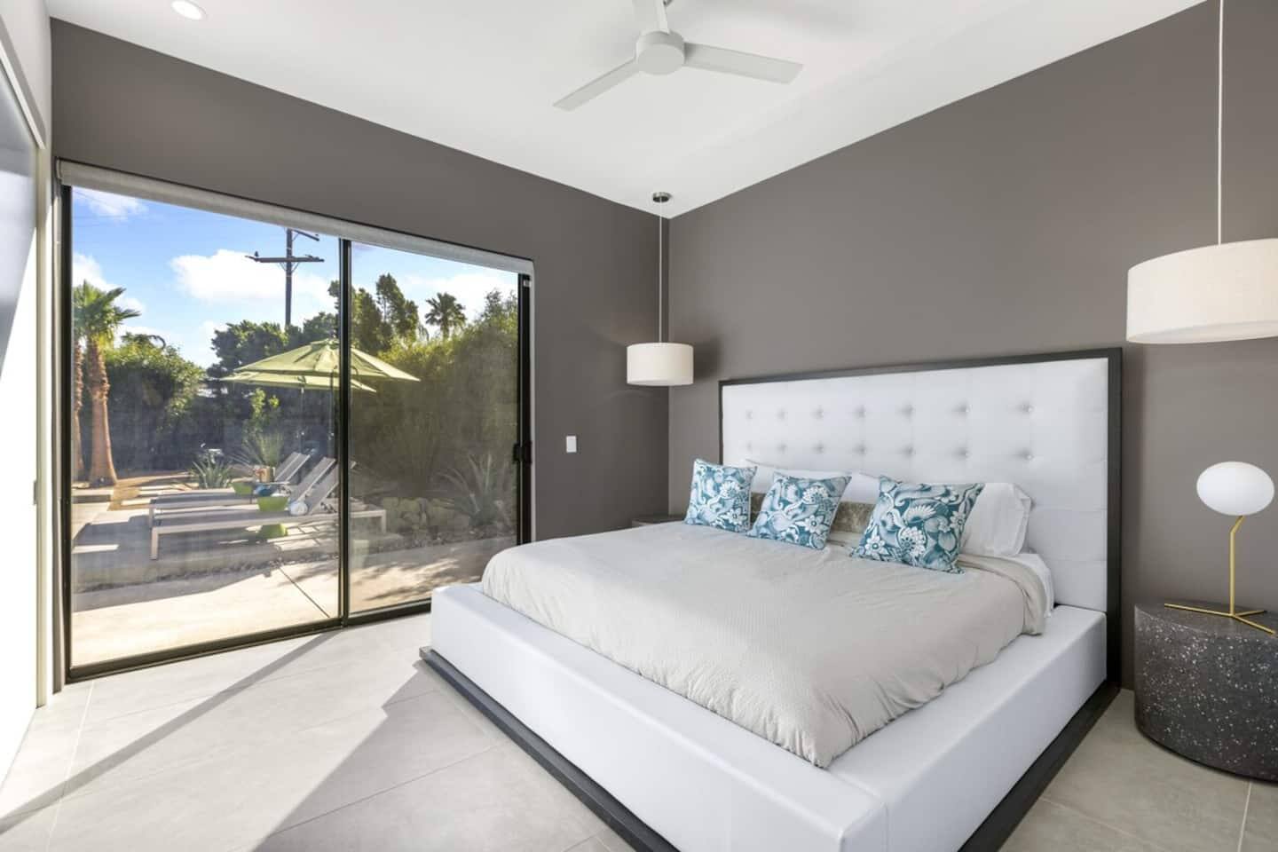 Completely remodeled in 2021, Desert Modern Retreat blends sleek modern design with high-end comfort. Soaring ceilings, brand-new finishes, and curated furnishings set the tone for a luxury stay. Relax in the spacious living room with stunning mountain views, or step into your private backyard oasis with a sparkling pool, spa, firepits, and outdoor dining under the palms. Centrally located in a quiet, well-kept neighborhood just two blocks from Victoria Park, the home is only 5 minutes from downtown Palm Springs’ top dining, shopping, and nightlife. Perfect for couples, friends, or families, with premium amenities and thoughtful touches throughout. Highlights: 2 spacious bedrooms with premium mattresses (Tuft & Needle + Casper), Smart TVs 2 spa-inspired bathrooms with walk-in showers + solid stone soaking tub Chef’s kitchen with new appliances, fully stocked for cooking & entertaining Resort-style backyard: pool, spa (complimentary spa heat, pool heat available), firepits, chaise loungers, covered dining, BBQ grill Fiber internet (1 Gig) + mesh WiFi, desk & chair for remote work Smart TVs in living room + primary bedroom with streaming Attached 2-car garage, washer/dryer, central HVAC Your Palm Springs escape awaits. Licensed Vacation Rental | City of Palm Springs ID#4984