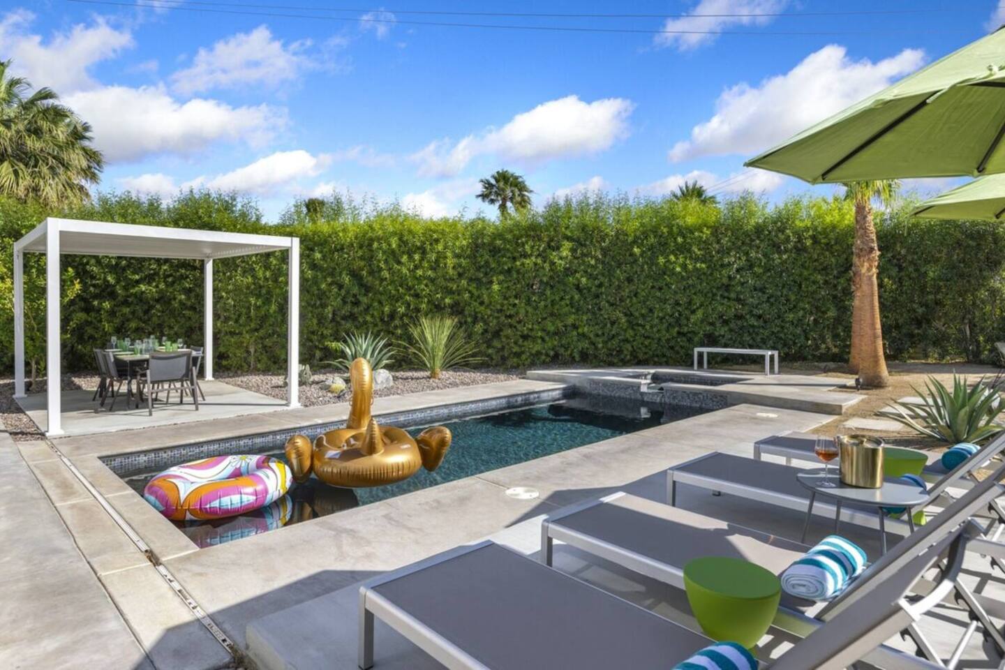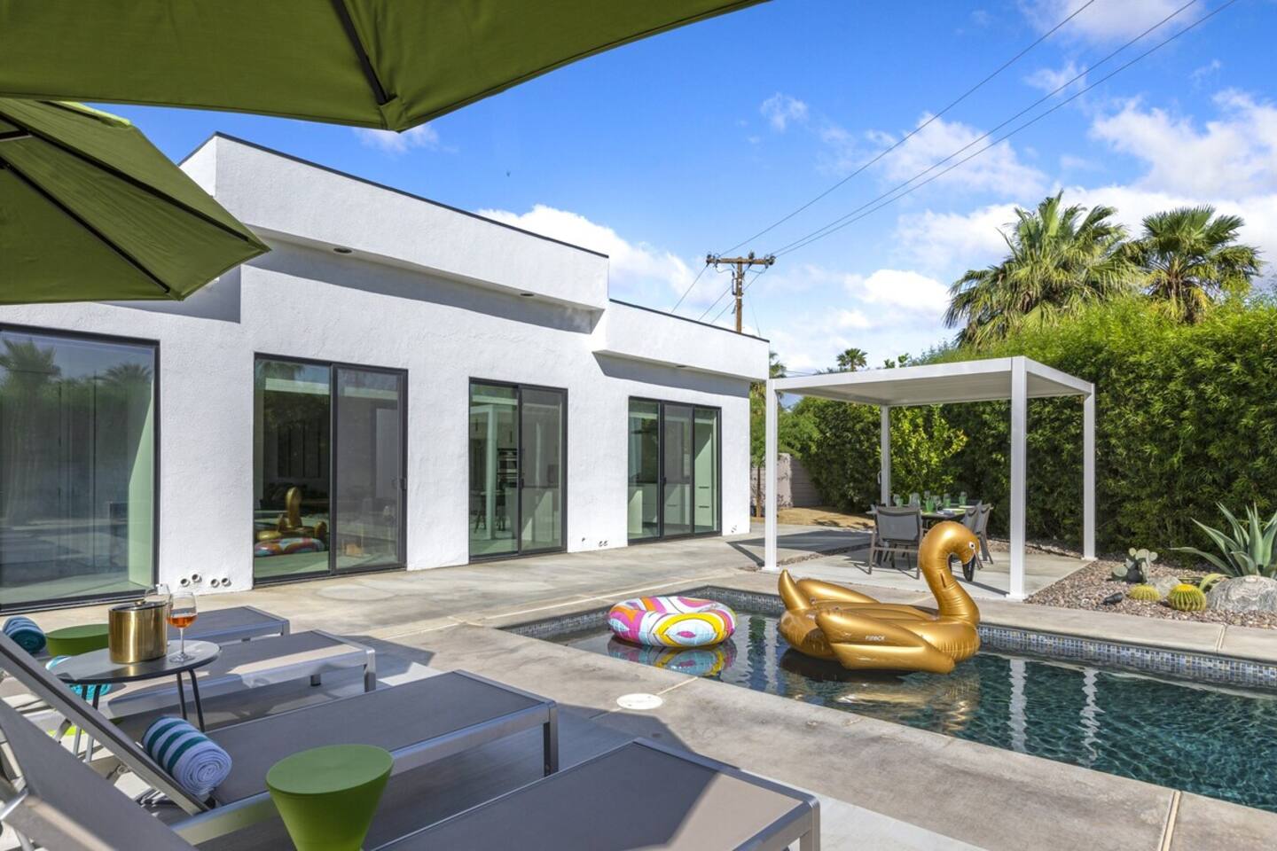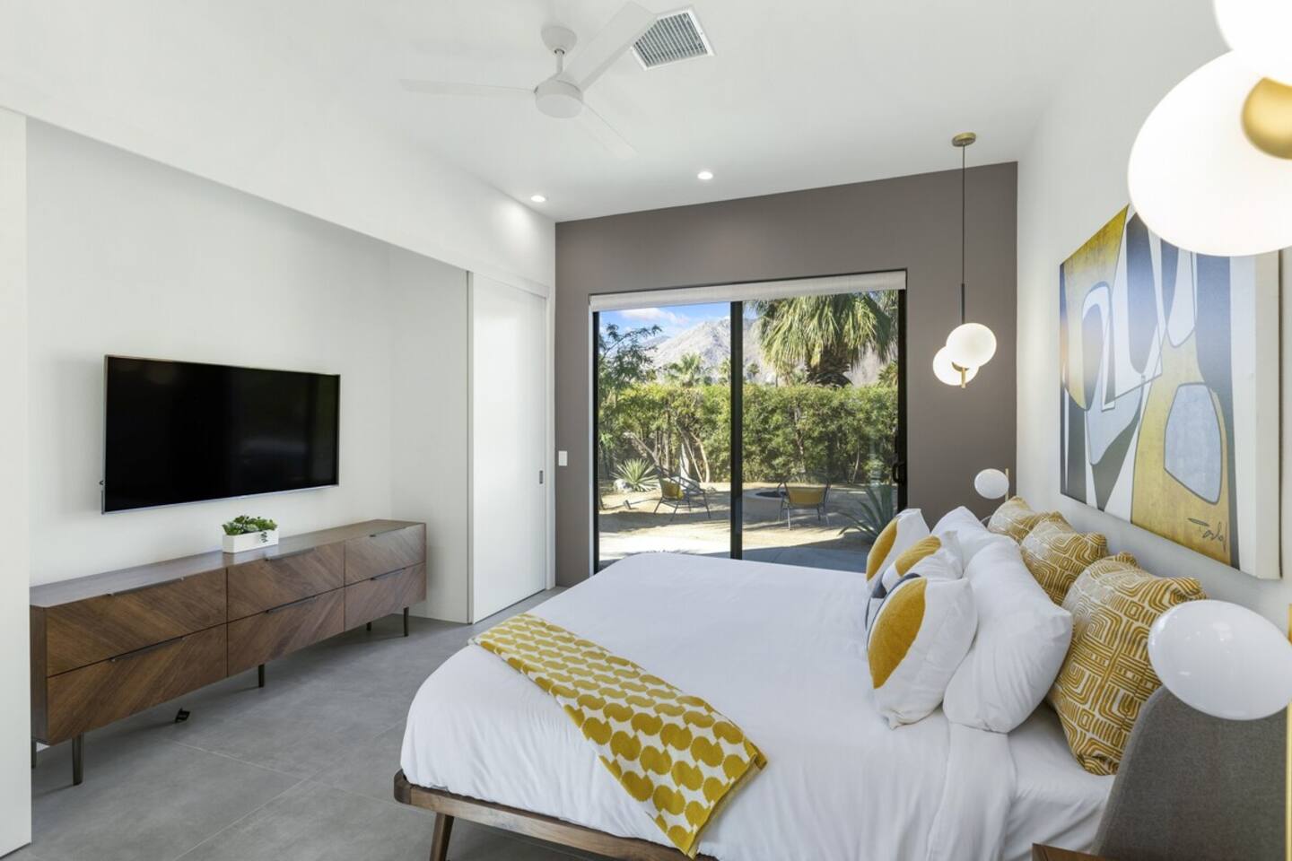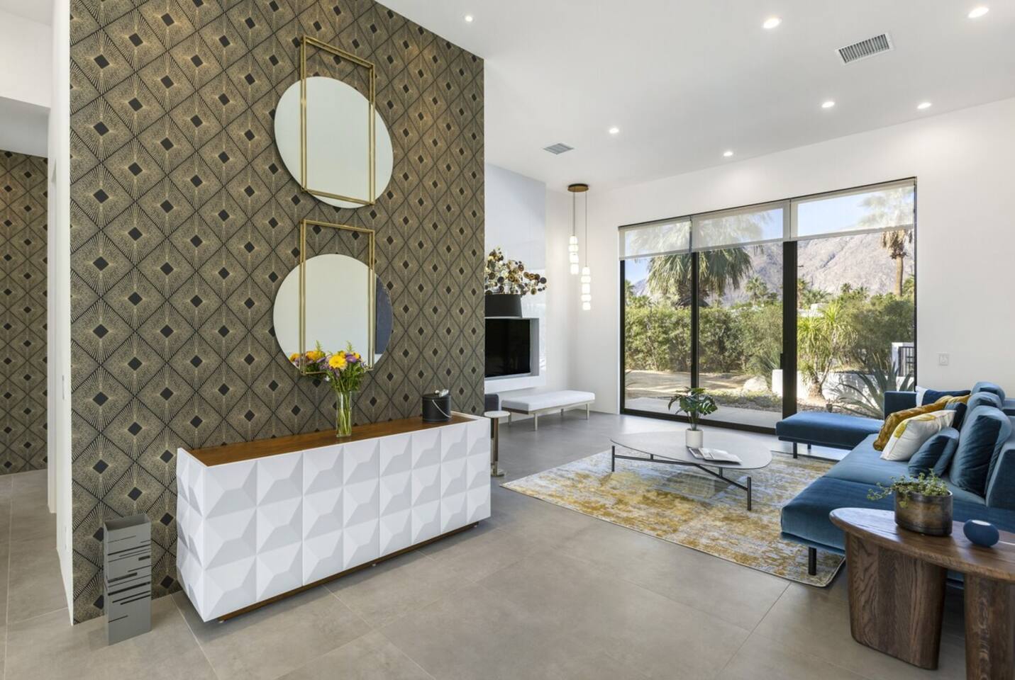 Completely remodeled in 2021, Desert Modern Retreat blends sleek modern design with high-end comfort. Soaring ceilings, brand-new finishes, and curated furnishings set the tone for a luxury stay. Relax in the spacious living room with stunning mountain views, or step into your private backyard oasis with a sparkling pool, spa, firepits, and outdoor dining under the palms. Centrally located in a quiet, well-kept neighborhood just two blocks from Victoria Park, the home is only 5 minutes from downtown Palm Springs’ top dining, shopping, and nightlife. Perfect for couples, friends, or families, with premium amenities and thoughtful touches throughout. Highlights: 2 spacious bedrooms with premium mattresses (Tuft & Needle + Casper), Smart TVs 2 spa-inspired bathrooms with walk-in showers + solid stone soaking tub Chef’s kitchen with new appliances, fully stocked for cooking & entertaining Resort-style backyard: pool, spa (complimentary spa heat, pool heat available), firepits, chaise loungers, covered dining, BBQ grill Fiber internet (1 Gig) + mesh WiFi, desk & chair for remote work Smart TVs in living room + primary bedroom with streaming Attached 2-car garage, washer/dryer, central HVAC Your Palm Springs escape awaits. Licensed Vacation Rental | City of Palm Springs ID#4984