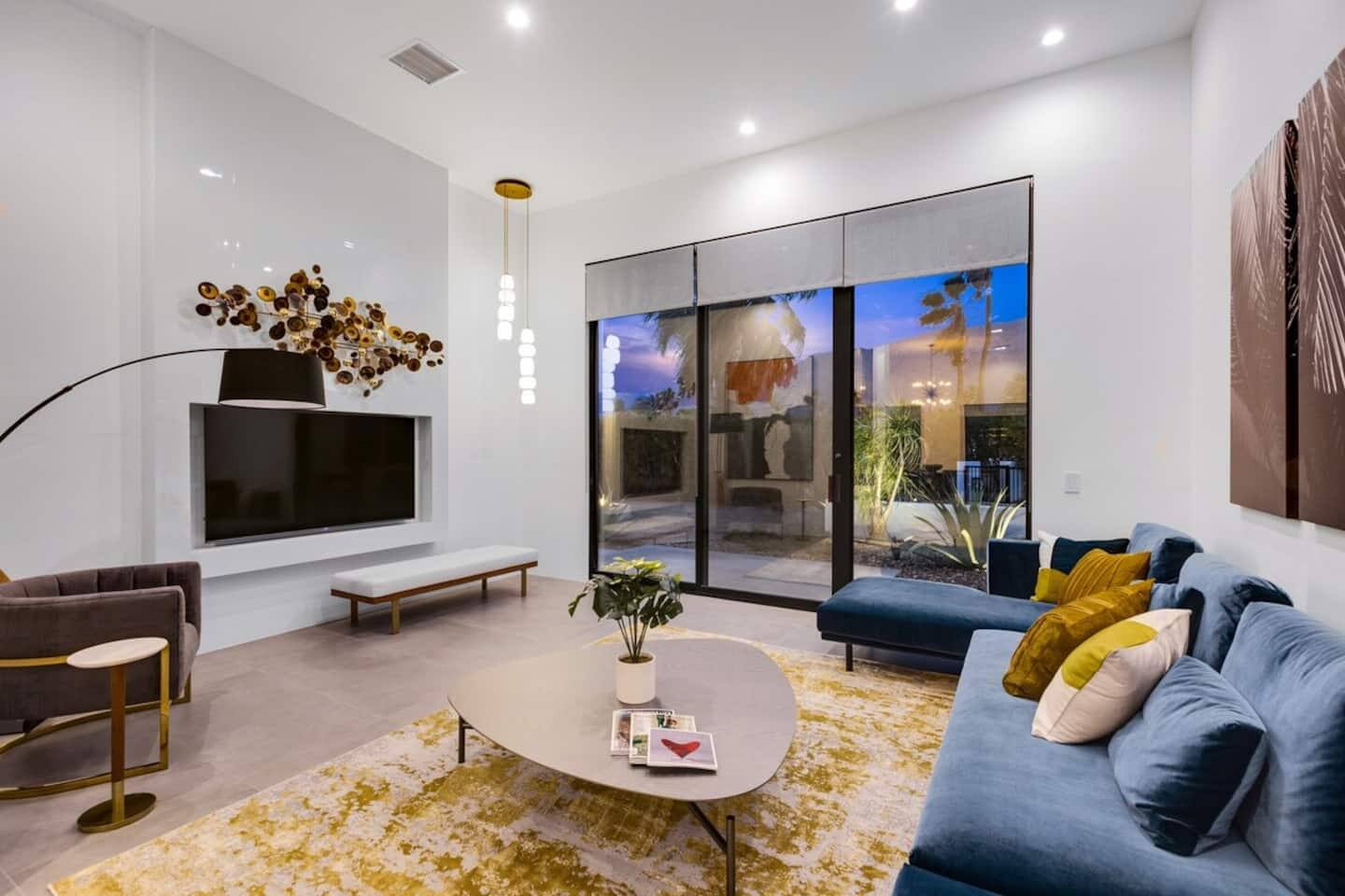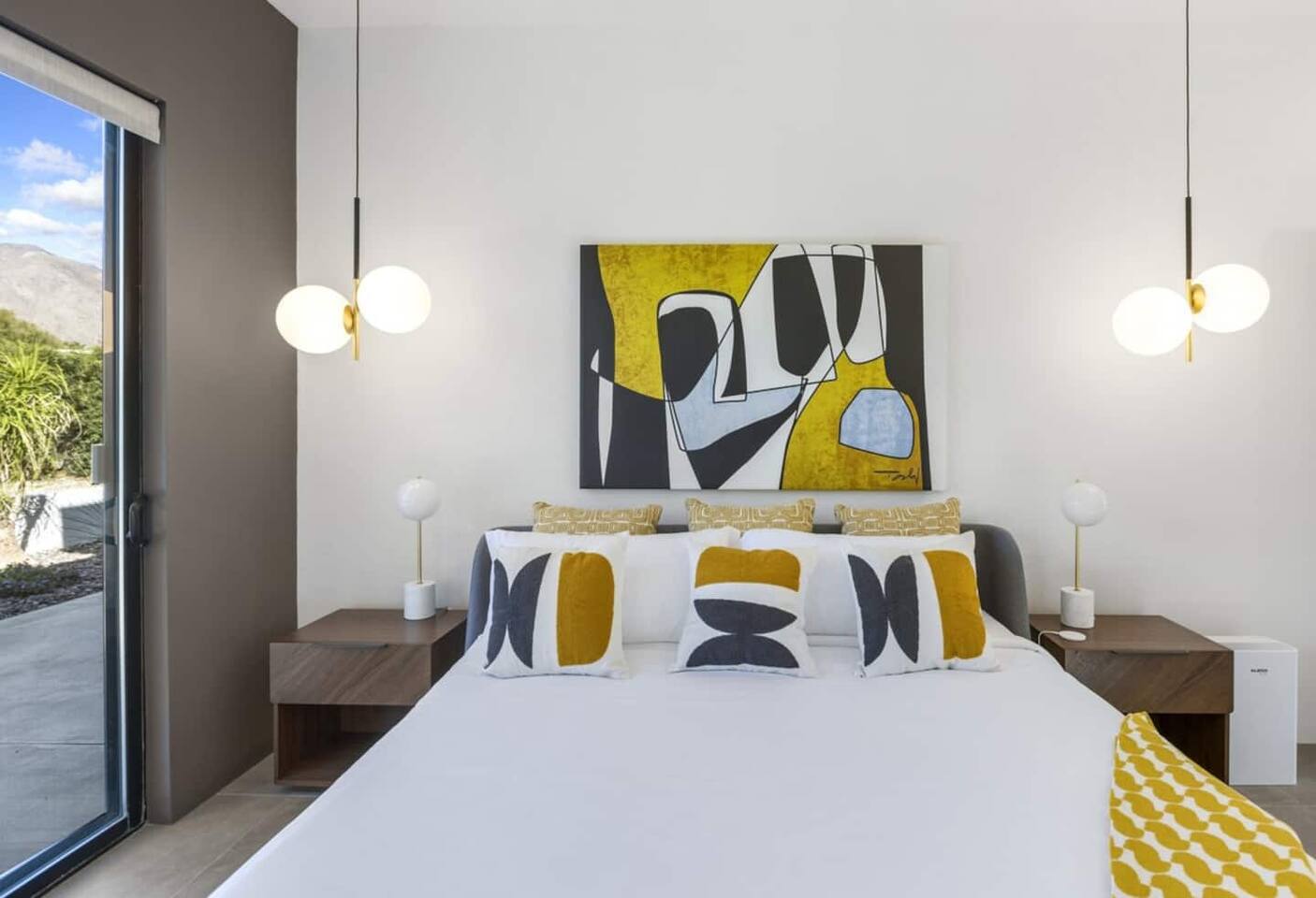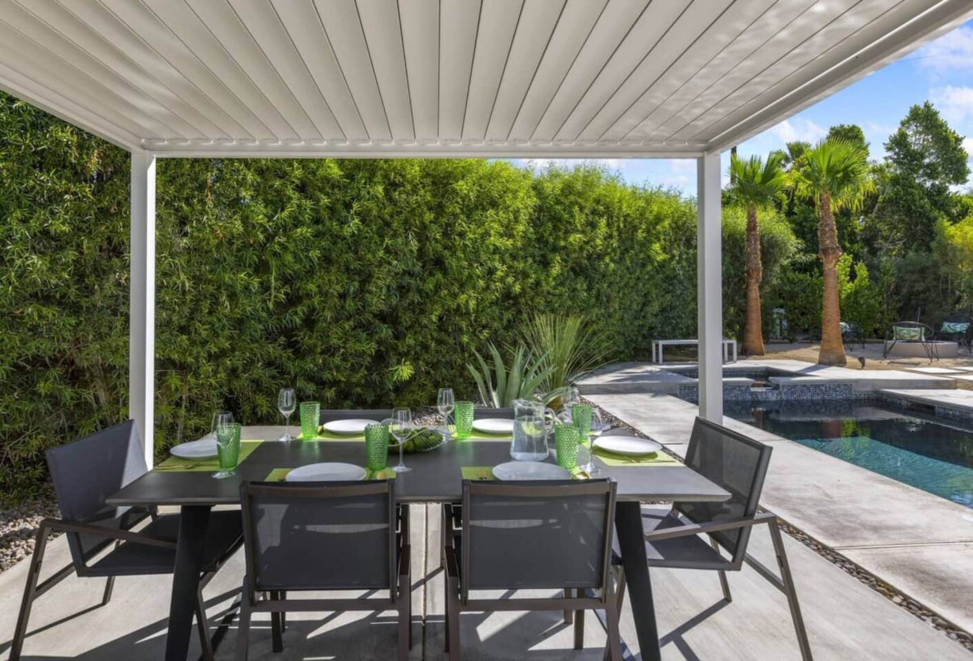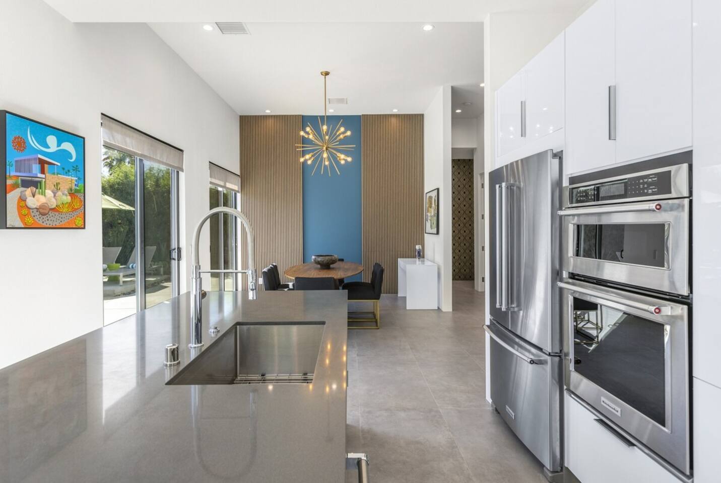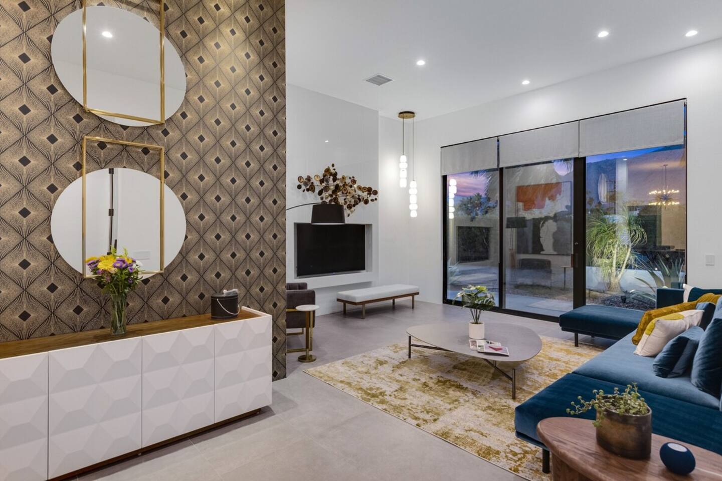 Completely remodeled in 2021, Desert Modern Retreat blends sleek modern design with high-end comfort. Soaring ceilings, brand-new finishes, and curated furnishings set the tone for a luxury stay. Relax in the spacious living room with stunning mountain views, or step into your private backyard oasis with a sparkling pool, spa, firepits, and outdoor dining under the palms. Centrally located in a quiet, well-kept neighborhood just two blocks from Victoria Park, the home is only 5 minutes from downtown Palm Springs’ top dining, shopping, and nightlife. Perfect for couples, friends, or families, with premium amenities and thoughtful touches throughout. Highlights: 2 spacious bedrooms with premium mattresses (Tuft & Needle + Casper), Smart TVs 2 spa-inspired bathrooms with walk-in showers + solid stone soaking tub Chef’s kitchen with new appliances, fully stocked for cooking & entertaining Resort-style backyard: pool, spa (complimentary spa heat, pool heat available), firepits, chaise loungers, covered dining, BBQ grill Fiber internet (1 Gig) + mesh WiFi, desk & chair for remote work Smart TVs in living room + primary bedroom with streaming Attached 2-car garage, washer/dryer, central HVAC Your Palm Springs escape awaits. Licensed Vacation Rental | City of Palm Springs ID#4984