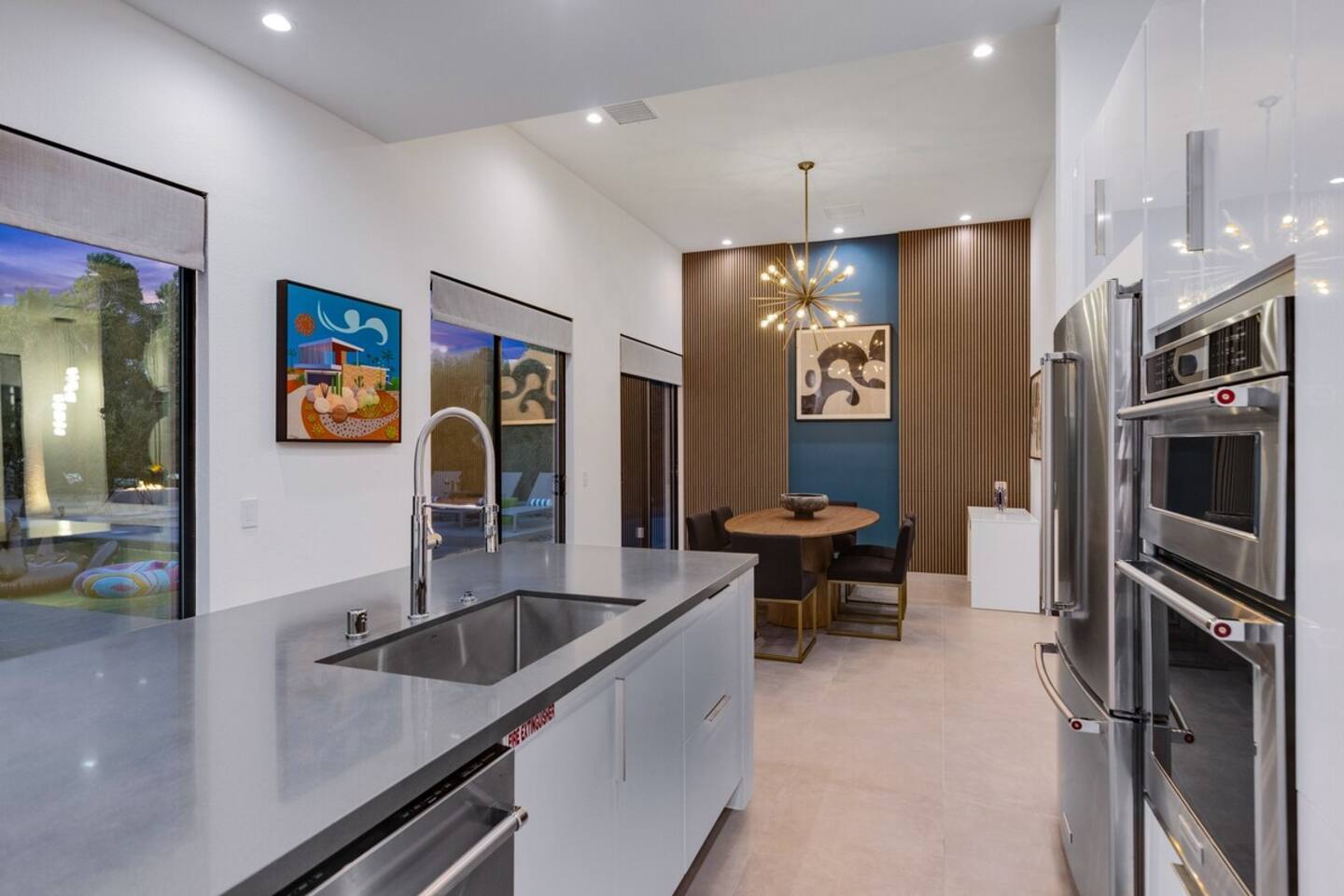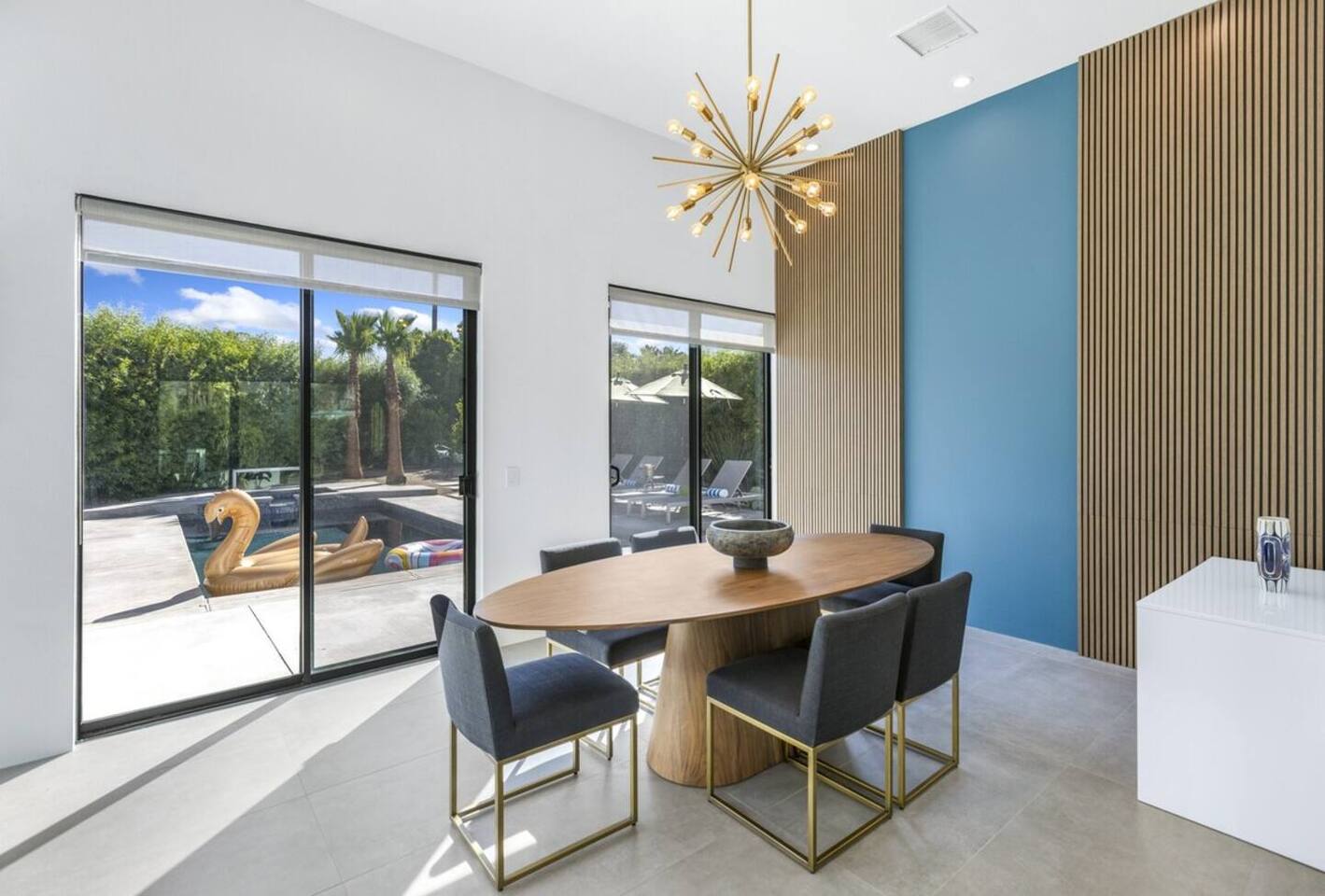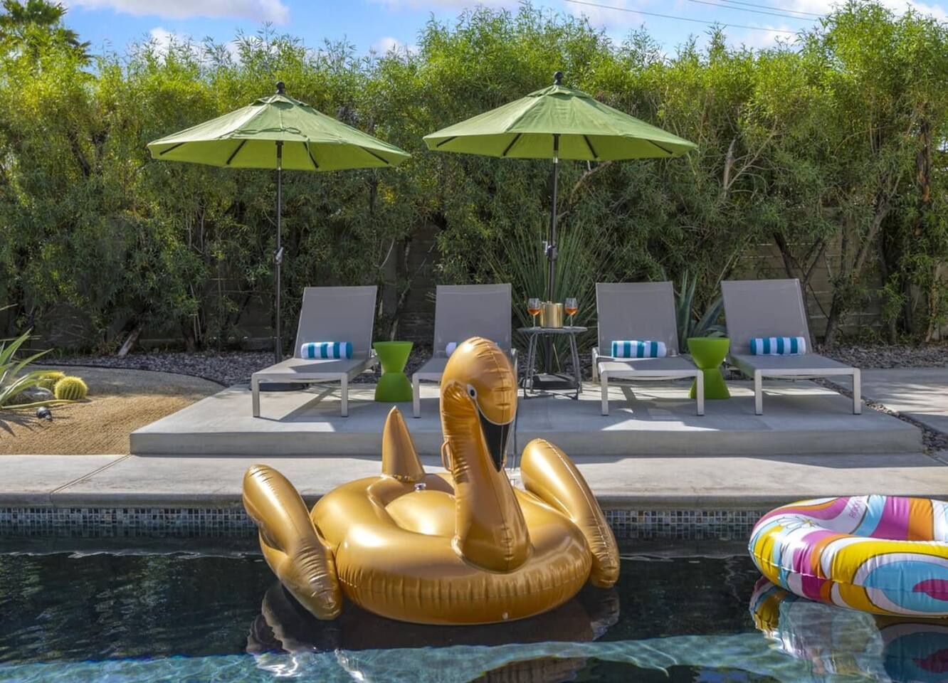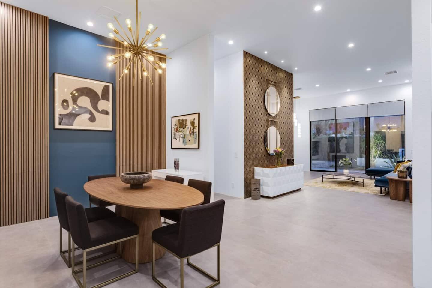 Completely remodeled in 2021, Desert Modern Retreat blends sleek modern design with high-end comfort. Soaring ceilings, brand-new finishes, and curated furnishings set the tone for a luxury stay. Relax in the spacious living room with stunning mountain views, or step into your private backyard oasis with a sparkling pool, spa, firepits, and outdoor dining under the palms. Centrally located in a quiet, well-kept neighborhood just two blocks from Victoria Park, the home is only 5 minutes from downtown Palm Springs’ top dining, shopping, and nightlife. Perfect for couples, friends, or families, with premium amenities and thoughtful touches throughout. Highlights: 2 spacious bedrooms with premium mattresses (Tuft & Needle + Casper), Smart TVs 2 spa-inspired bathrooms with walk-in showers + solid stone soaking tub Chef’s kitchen with new appliances, fully stocked for cooking & entertaining Resort-style backyard: pool, spa (complimentary spa heat, pool heat available), firepits, chaise loungers, covered dining, BBQ grill Fiber internet (1 Gig) + mesh WiFi, desk & chair for remote work Smart TVs in living room + primary bedroom with streaming Attached 2-car garage, washer/dryer, central HVAC Your Palm Springs escape awaits. Licensed Vacation Rental | City of Palm Springs ID#4984