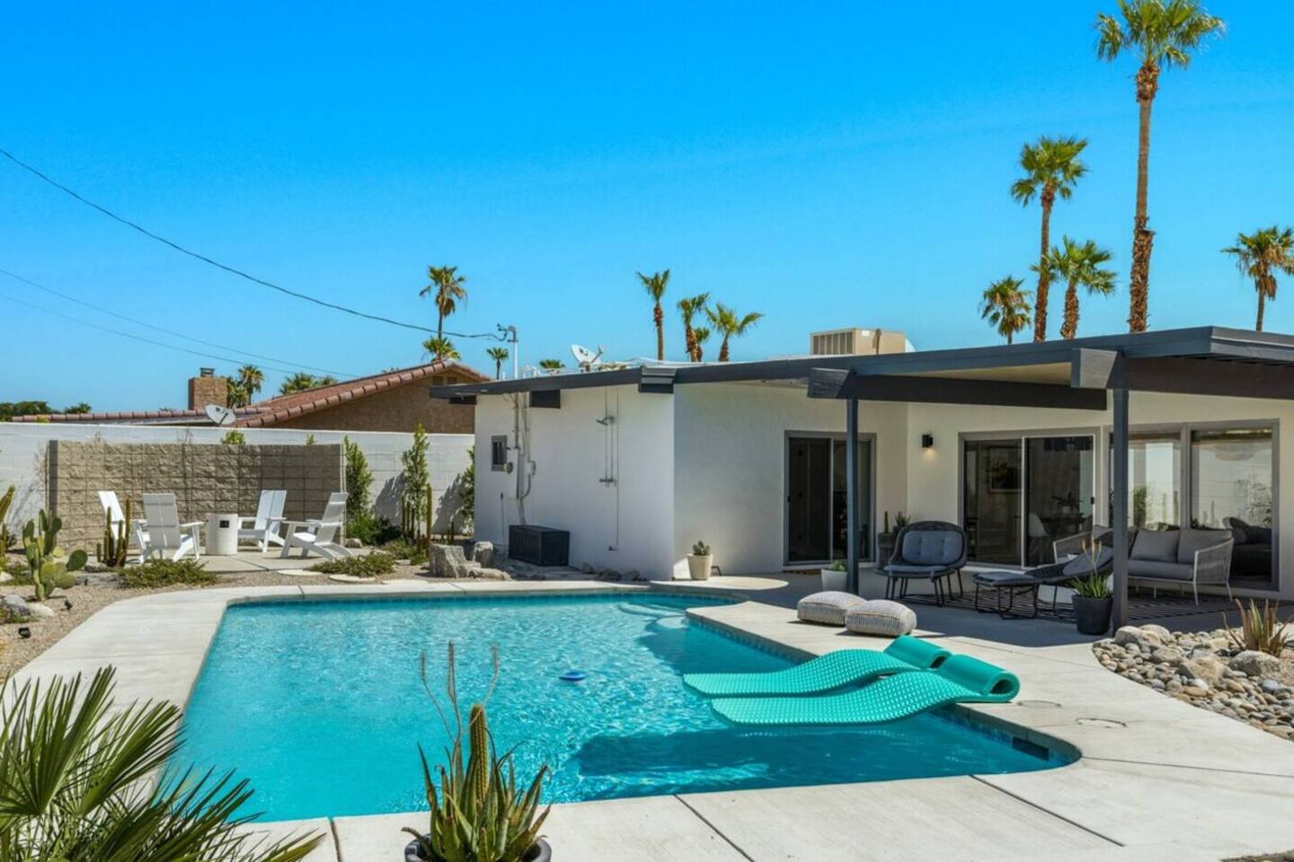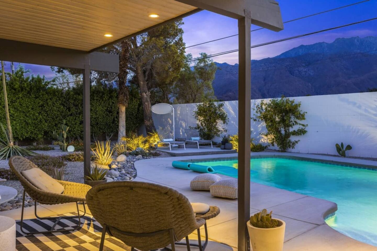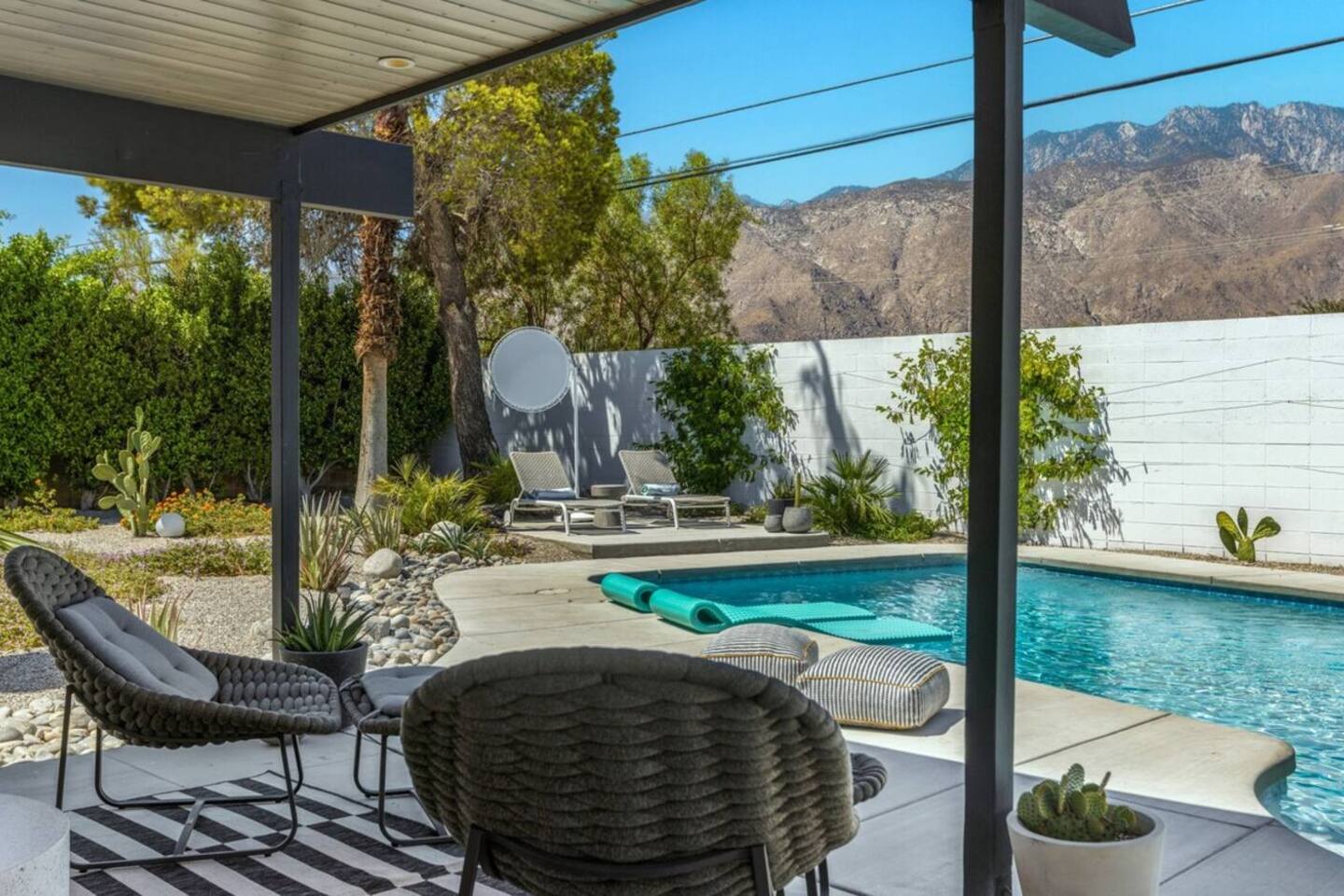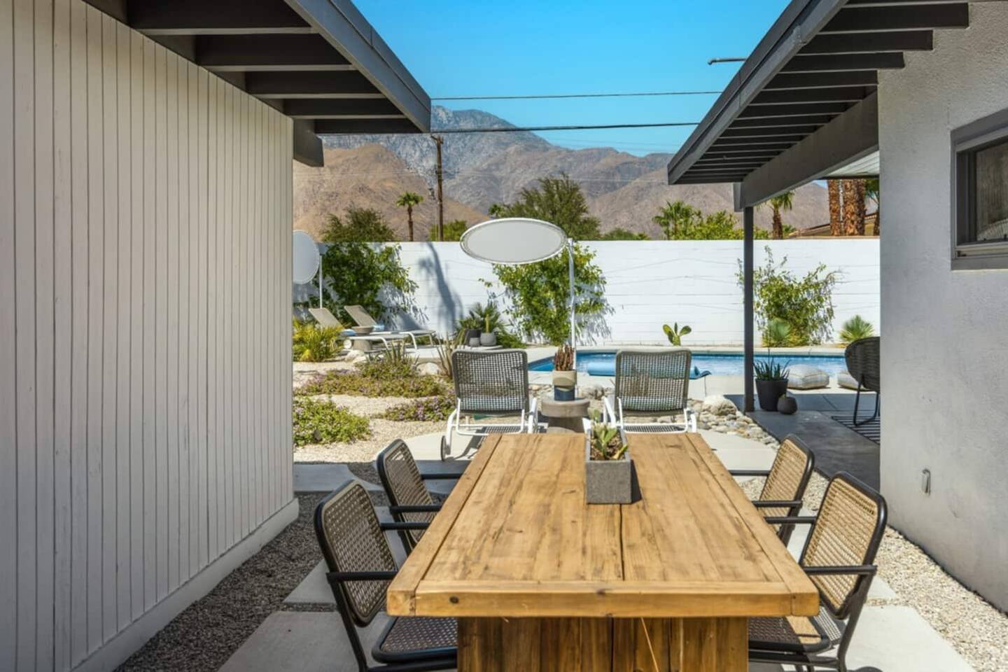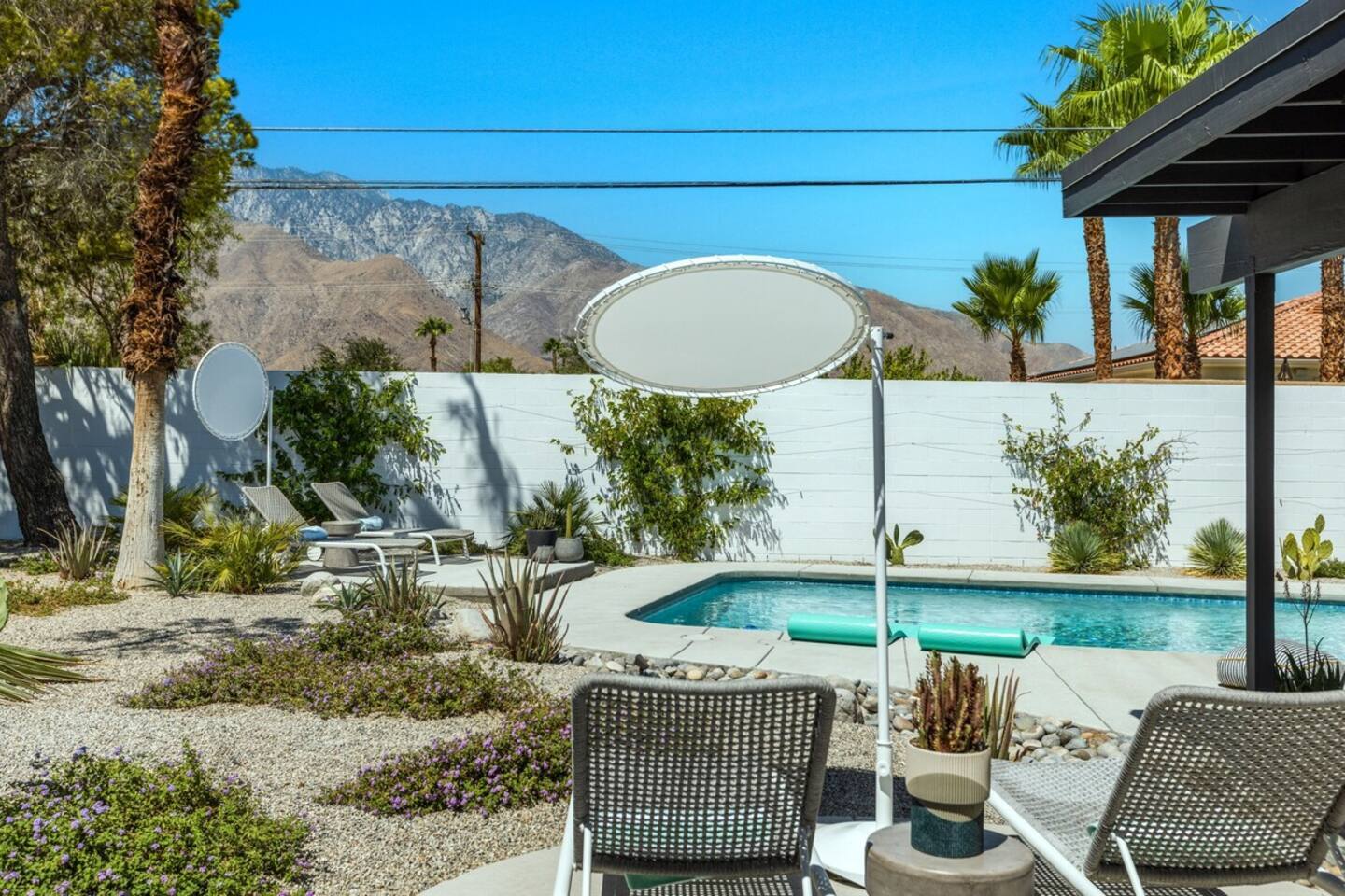 City ID 1858, TOT 9182 About our home- 3 bedroom, 2 bathroom home in a quiet neighborhood Thoughtfully designed and fully remodeled, this home exudes the Modern West lifestyle of Palm Springs Stylish and unique amenities including a resort-style backyard surrounded by privacy - Gorgeous views of the San Jacinto Mountains Walking distance from Starbucks, restaurants and grocery store - Convenient location just minutes away from the best dining & entertainment in Palm Springs Minutes from downtown Palm Springs the neighborhood is clean, quiet, and conveniently located just two blocks from Victoria Park (great for the kids!) and less than five minutes drive from Downtown Palm Springs and Agua Caliente Casino. BEDROOMS & BATHROOMS - 3 large bedrooms with new Casper mattresses and West Elm linens; 1 king, 2 queens - 2 bathrooms with large vanities, modern fixtures and spacious walk-in showers - Lots of closet space, new high speed fans and KITCHEN & DINING AREAS - Fully-equipped kitchen with full-sized cooking appliances -Indoor and outdoor dining options -French press, Espresso and Keurig coffee options Built for entertainers, the kitchen and dining spaces are open and easy for the desert lifestyle. For indoor dining, the new Italian porcelain countertops and Bertoia bar stools at the counter are perfect for coffee and apps. The Room and Board dining table & Eames dinning chairs are perfect for a more formal meal. For brunch or sunset happy hour check out the outdoor long dining table with views of the San Jacinto mountains or enjoy the loungy couch and chairs. LIVING ROOM - Smart TV with digital surround sound and Apple TV - Family games, puzzles, and other activities While you may not be spending a whole lot of time indoors during your stay in Palm Springs, when you do need a break from the sun, the cozy living room is the perfect place to relax and unwind. It features a large sectional couch, shades to cool you off and plenty of fun activities including puzzles, books and games. BACKYARD & OUTDOOR SPACE - Beautiful heated pool with floats included (pool heat is available for daily fee based on season) Outdoor shower Gas firepit and Adirondack chairs Luxurious modern outdoor furniture throughout the backyard Natural gas BBQ grill Outdoor dining area with the best views during dinner The spacious and secluded backyard area is where you’ll want to spend most of your time. Start your day with a book under the palm tree or a morning swim and end it under the gorgeous sky lounging near the fire pit. Pool heat is available for a fee per day. Please ask us if interested. A Note from the owners: A personal note from Monika and Jay, the owners of the home. We have been drawn to Palm Springs for as long as we can remember and were finally able to find a property we loved to own. We are fascinated by the classic Mid Century modern design feel with hints of old Hollywood all throughout Palm Springs. We wanted to maintain the architectural integrity of the renowned Hugh Kaptur design but bring in some simple modern elements that allow us to relax and decompress into the desert landscape. We hope you enjoy the home as much as we do with those you love! The pool and yard are our favorite place in the home. Watching the sunset with friends on the outdoor couch with a fresh cocktail is one of our favorite places to be, and hope you do the same!