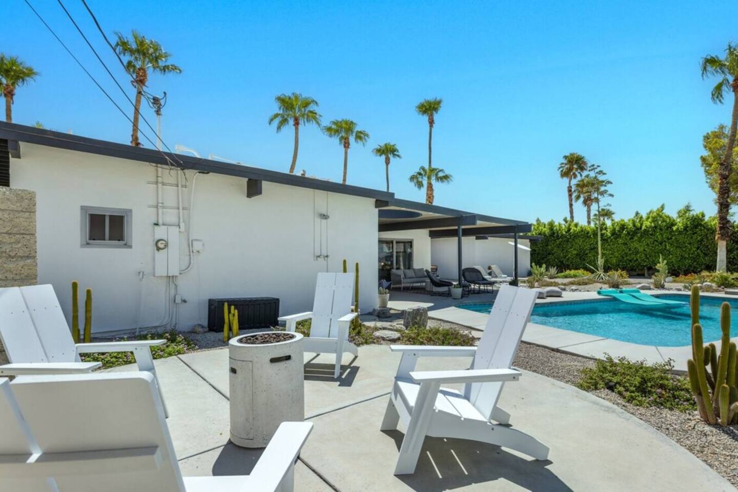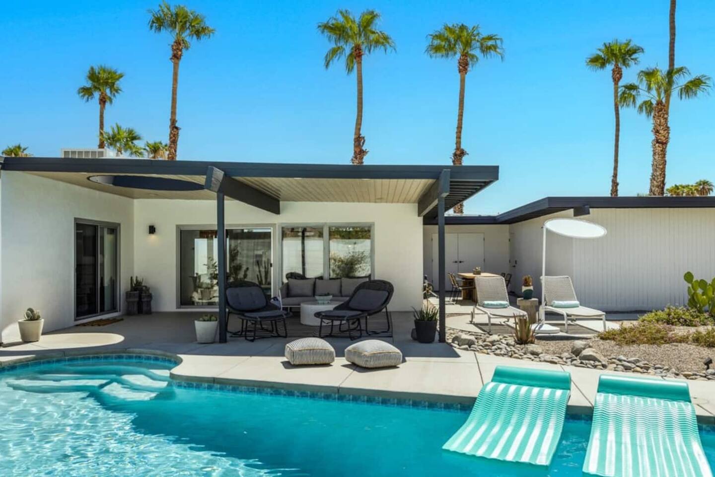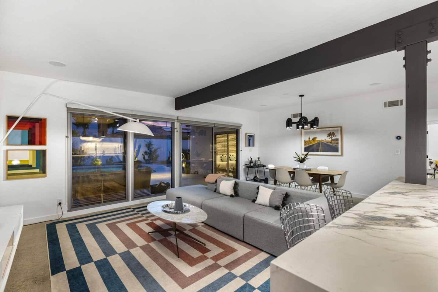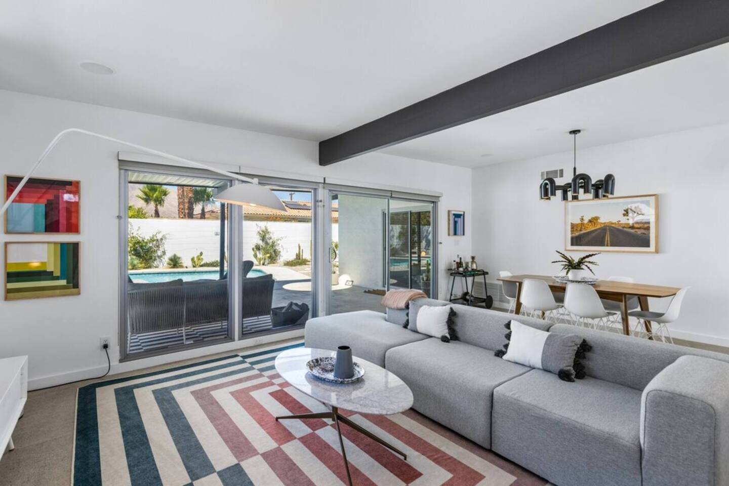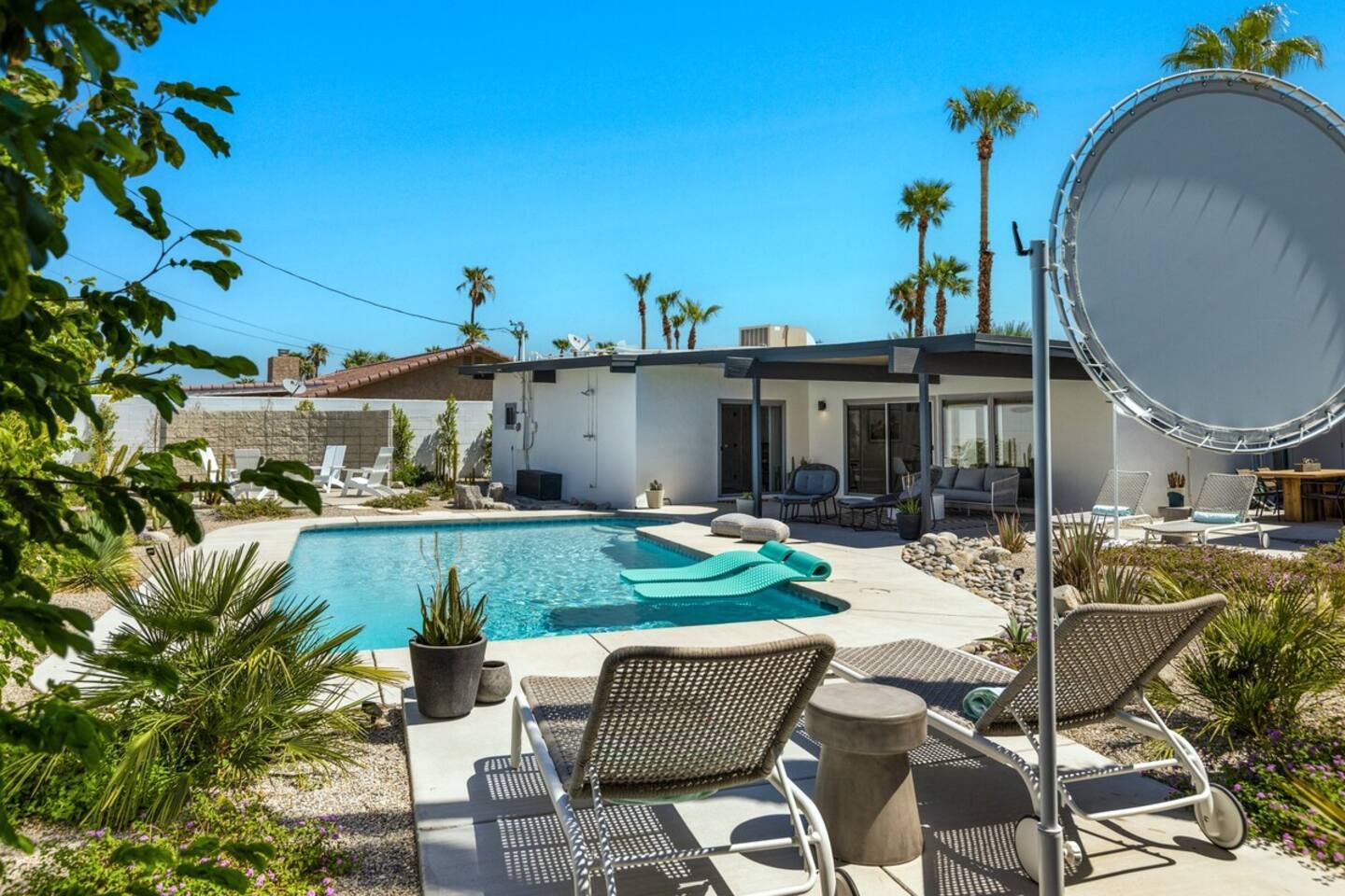 City ID 1858, TOT 9182 About our home- 3 bedroom, 2 bathroom home in a quiet neighborhood Thoughtfully designed and fully remodeled, this home exudes the Modern West lifestyle of Palm Springs Stylish and unique amenities including a resort-style backyard surrounded by privacy - Gorgeous views of the San Jacinto Mountains Walking distance from Starbucks, restaurants and grocery store - Convenient location just minutes away from the best dining & entertainment in Palm Springs Minutes from downtown Palm Springs the neighborhood is clean, quiet, and conveniently located just two blocks from Victoria Park (great for the kids!) and less than five minutes drive from Downtown Palm Springs and Agua Caliente Casino. BEDROOMS & BATHROOMS - 3 large bedrooms with new Casper mattresses and West Elm linens; 1 king, 2 queens - 2 bathrooms with large vanities, modern fixtures and spacious walk-in showers - Lots of closet space, new high speed fans and KITCHEN & DINING AREAS - Fully-equipped kitchen with full-sized cooking appliances -Indoor and outdoor dining options -French press, Espresso and Keurig coffee options Built for entertainers, the kitchen and dining spaces are open and easy for the desert lifestyle. For indoor dining, the new Italian porcelain countertops and Bertoia bar stools at the counter are perfect for coffee and apps. The Room and Board dining table & Eames dinning chairs are perfect for a more formal meal. For brunch or sunset happy hour check out the outdoor long dining table with views of the San Jacinto mountains or enjoy the loungy couch and chairs. LIVING ROOM - Smart TV with digital surround sound and Apple TV - Family games, puzzles, and other activities While you may not be spending a whole lot of time indoors during your stay in Palm Springs, when you do need a break from the sun, the cozy living room is the perfect place to relax and unwind. It features a large sectional couch, shades to cool you off and plenty of fun activities including puzzles, books and games. BACKYARD & OUTDOOR SPACE - Beautiful heated pool with floats included (pool heat is available for daily fee based on season) Outdoor shower Gas firepit and Adirondack chairs Luxurious modern outdoor furniture throughout the backyard Natural gas BBQ grill Outdoor dining area with the best views during dinner The spacious and secluded backyard area is where you’ll want to spend most of your time. Start your day with a book under the palm tree or a morning swim and end it under the gorgeous sky lounging near the fire pit. Pool heat is available for a fee per day. Please ask us if interested. A Note from the owners: A personal note from Monika and Jay, the owners of the home. We have been drawn to Palm Springs for as long as we can remember and were finally able to find a property we loved to own. We are fascinated by the classic Mid Century modern design feel with hints of old Hollywood all throughout Palm Springs. We wanted to maintain the architectural integrity of the renowned Hugh Kaptur design but bring in some simple modern elements that allow us to relax and decompress into the desert landscape. We hope you enjoy the home as much as we do with those you love! The pool and yard are our favorite place in the home. Watching the sunset with friends on the outdoor couch with a fresh cocktail is one of our favorite places to be, and hope you do the same!