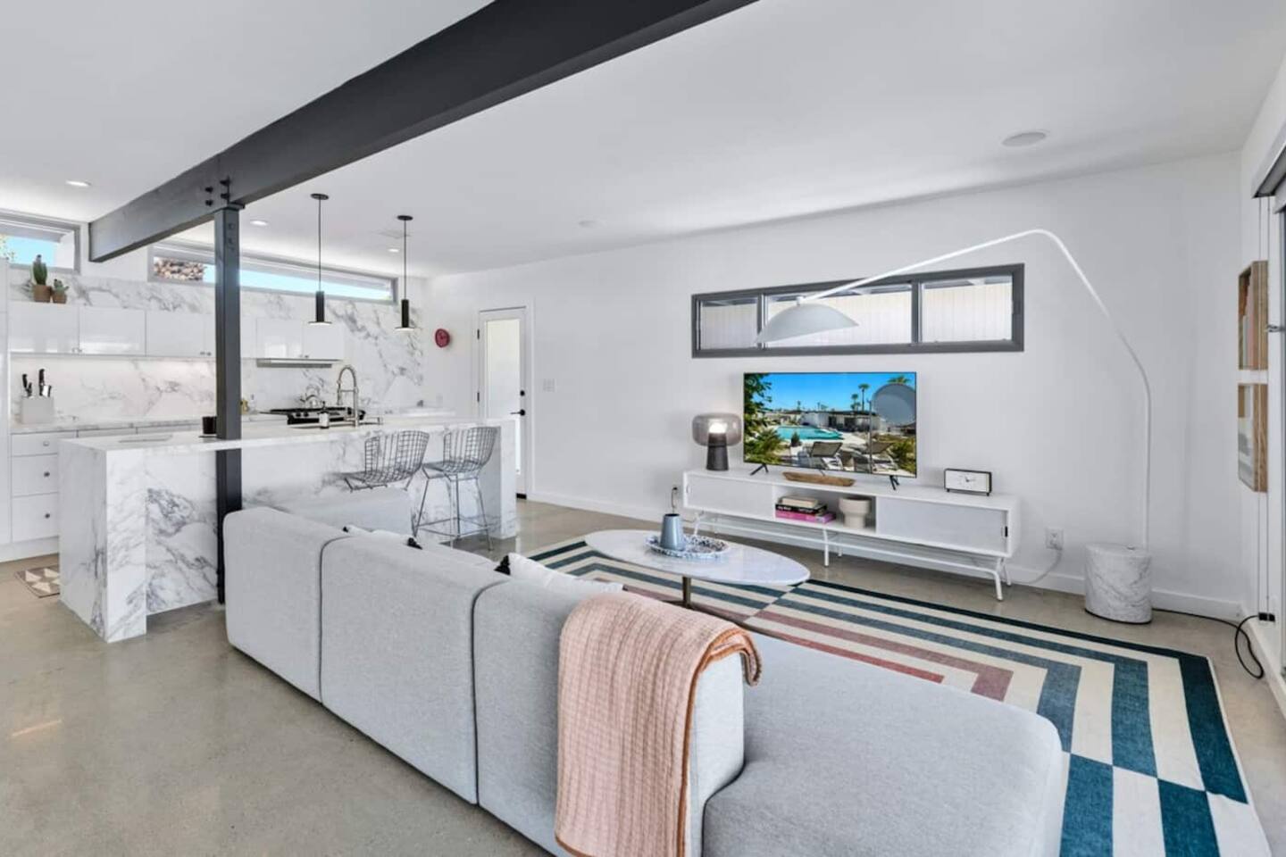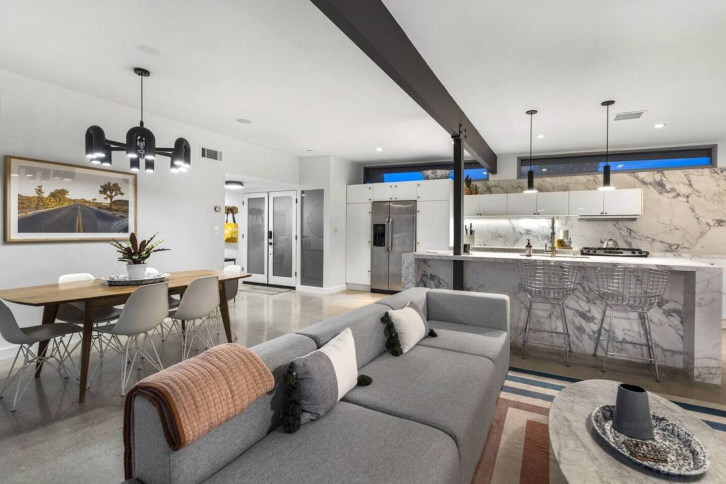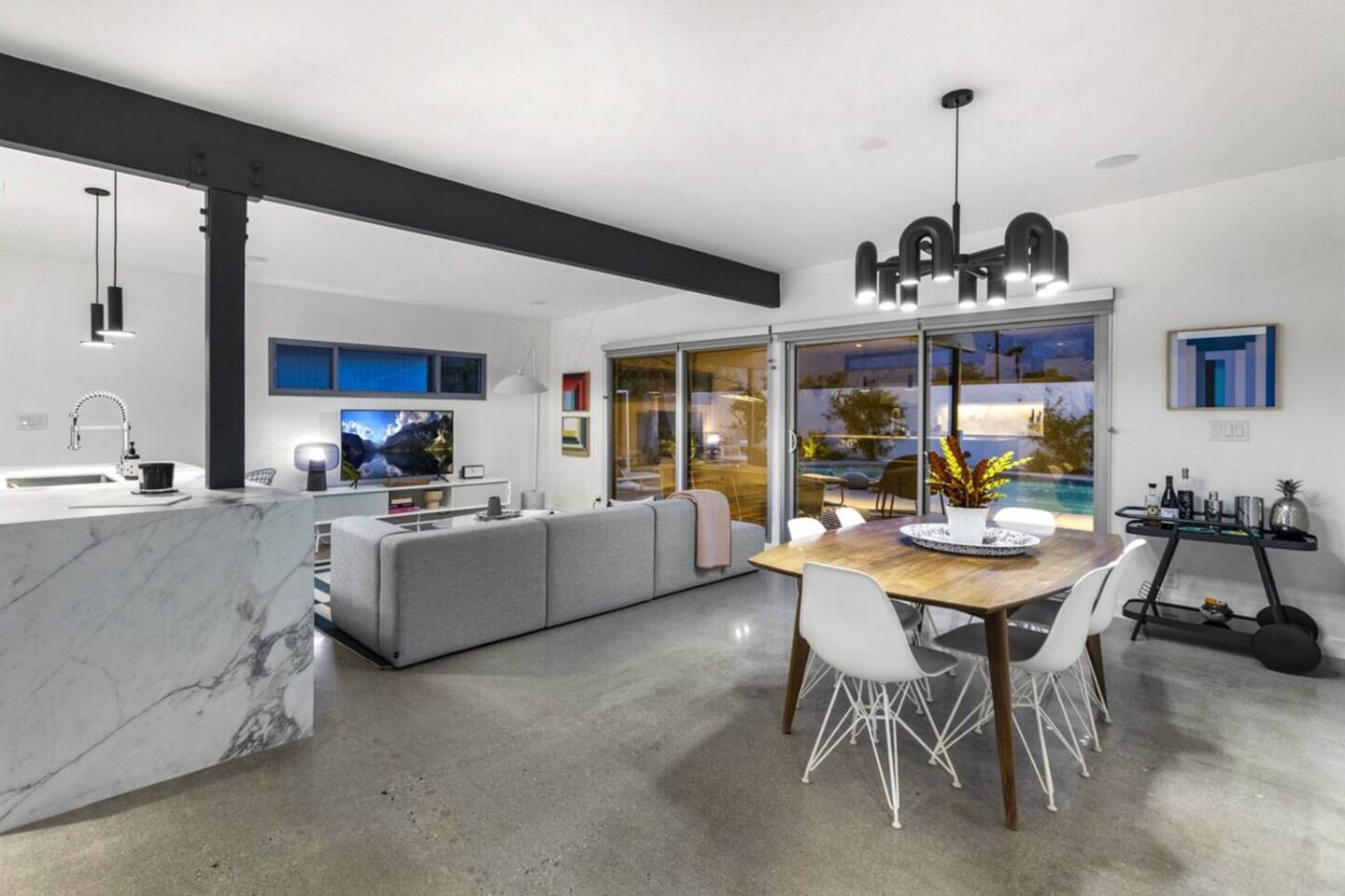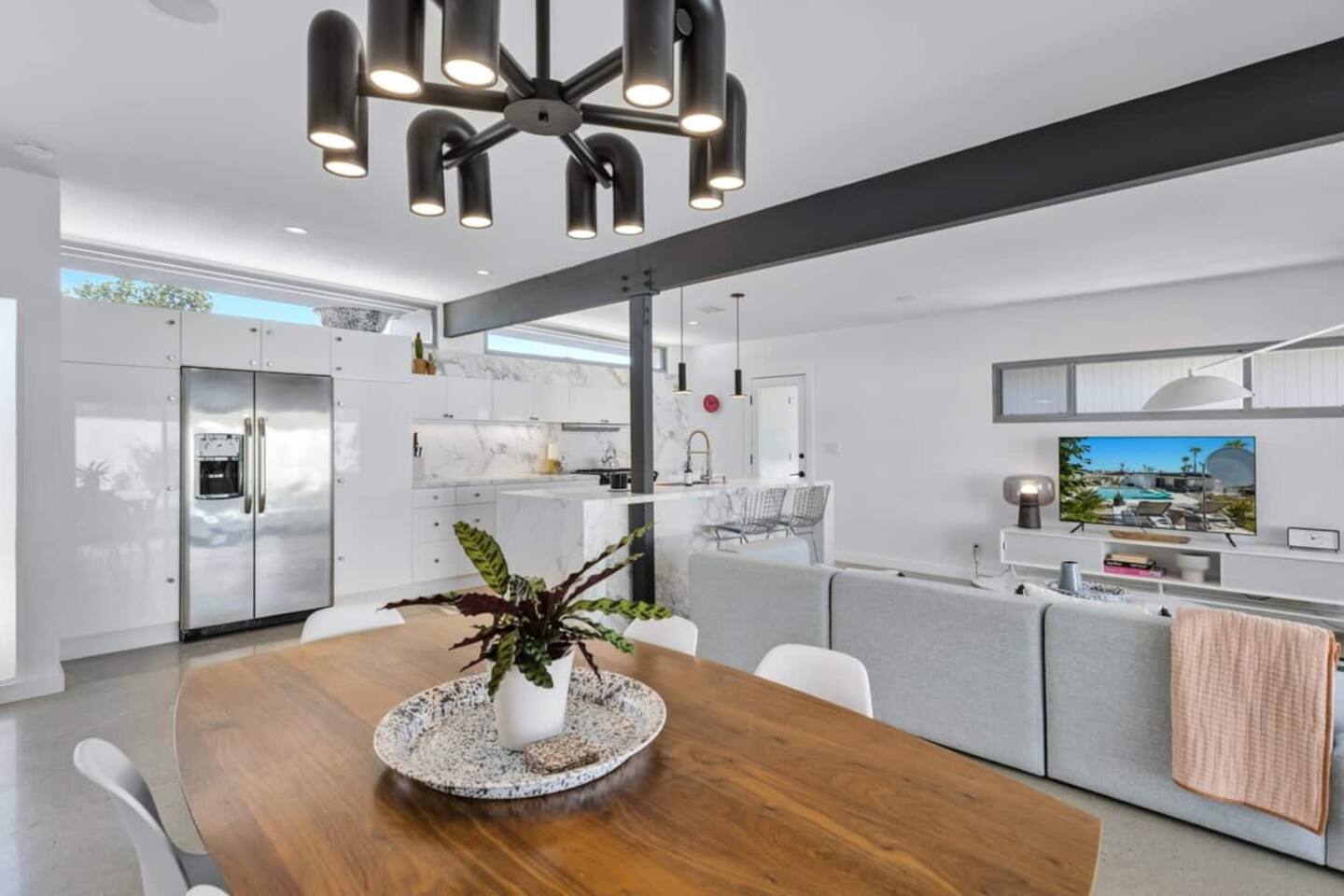 City ID 1858, TOT 9182 About our home- 3 bedroom, 2 bathroom home in a quiet neighborhood Thoughtfully designed and fully remodeled, this home exudes the Modern West lifestyle of Palm Springs Stylish and unique amenities including a resort-style backyard surrounded by privacy - Gorgeous views of the San Jacinto Mountains Walking distance from Starbucks, restaurants and grocery store - Convenient location just minutes away from the best dining & entertainment in Palm Springs Minutes from downtown Palm Springs the neighborhood is clean, quiet, and conveniently located just two blocks from Victoria Park (great for the kids!) and less than five minutes drive from Downtown Palm Springs and Agua Caliente Casino. BEDROOMS & BATHROOMS - 3 large bedrooms with new Casper mattresses and West Elm linens; 1 king, 2 queens - 2 bathrooms with large vanities, modern fixtures and spacious walk-in showers - Lots of closet space, new high speed fans and KITCHEN & DINING AREAS - Fully-equipped kitchen with full-sized cooking appliances -Indoor and outdoor dining options -French press, Espresso and Keurig coffee options Built for entertainers, the kitchen and dining spaces are open and easy for the desert lifestyle. For indoor dining, the new Italian porcelain countertops and Bertoia bar stools at the counter are perfect for coffee and apps. The Room and Board dining table & Eames dinning chairs are perfect for a more formal meal. For brunch or sunset happy hour check out the outdoor long dining table with views of the San Jacinto mountains or enjoy the loungy couch and chairs. LIVING ROOM - Smart TV with digital surround sound and Apple TV - Family games, puzzles, and other activities While you may not be spending a whole lot of time indoors during your stay in Palm Springs, when you do need a break from the sun, the cozy living room is the perfect place to relax and unwind. It features a large sectional couch, shades to cool you off and plenty of fun activities including puzzles, books and games. BACKYARD & OUTDOOR SPACE - Beautiful heated pool with floats included (pool heat is available for daily fee based on season) Outdoor shower Gas firepit and Adirondack chairs Luxurious modern outdoor furniture throughout the backyard Natural gas BBQ grill Outdoor dining area with the best views during dinner The spacious and secluded backyard area is where you’ll want to spend most of your time. Start your day with a book under the palm tree or a morning swim and end it under the gorgeous sky lounging near the fire pit. Pool heat is available for a fee per day. Please ask us if interested. A Note from the owners: A personal note from Monika and Jay, the owners of the home. We have been drawn to Palm Springs for as long as we can remember and were finally able to find a property we loved to own. We are fascinated by the classic Mid Century modern design feel with hints of old Hollywood all throughout Palm Springs. We wanted to maintain the architectural integrity of the renowned Hugh Kaptur design but bring in some simple modern elements that allow us to relax and decompress into the desert landscape. We hope you enjoy the home as much as we do with those you love! The pool and yard are our favorite place in the home. Watching the sunset with friends on the outdoor couch with a fresh cocktail is one of our favorite places to be, and hope you do the same!