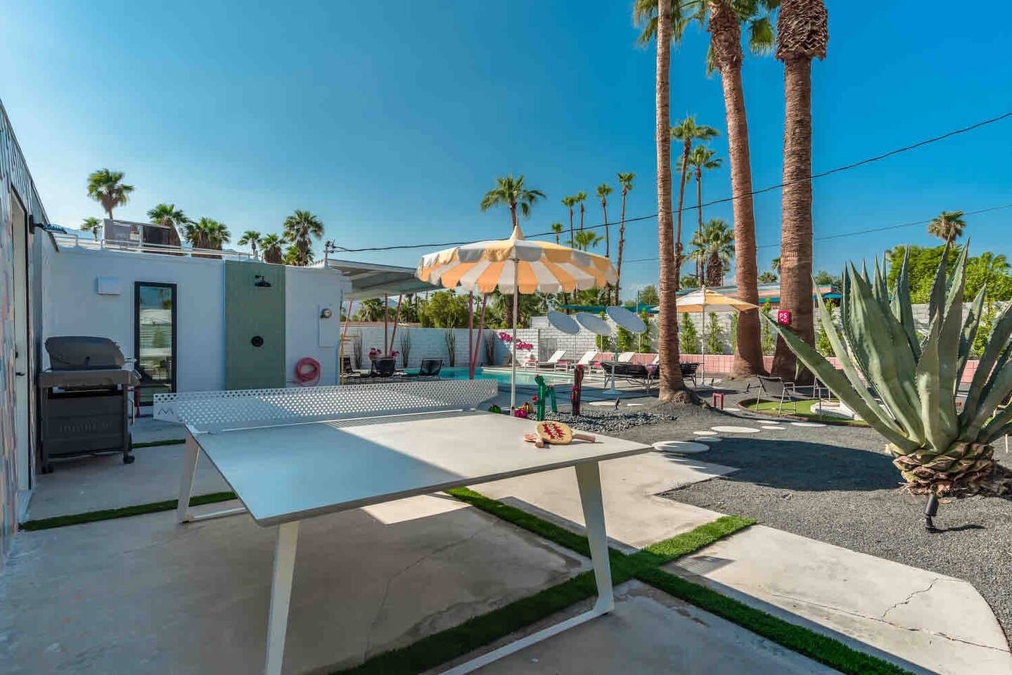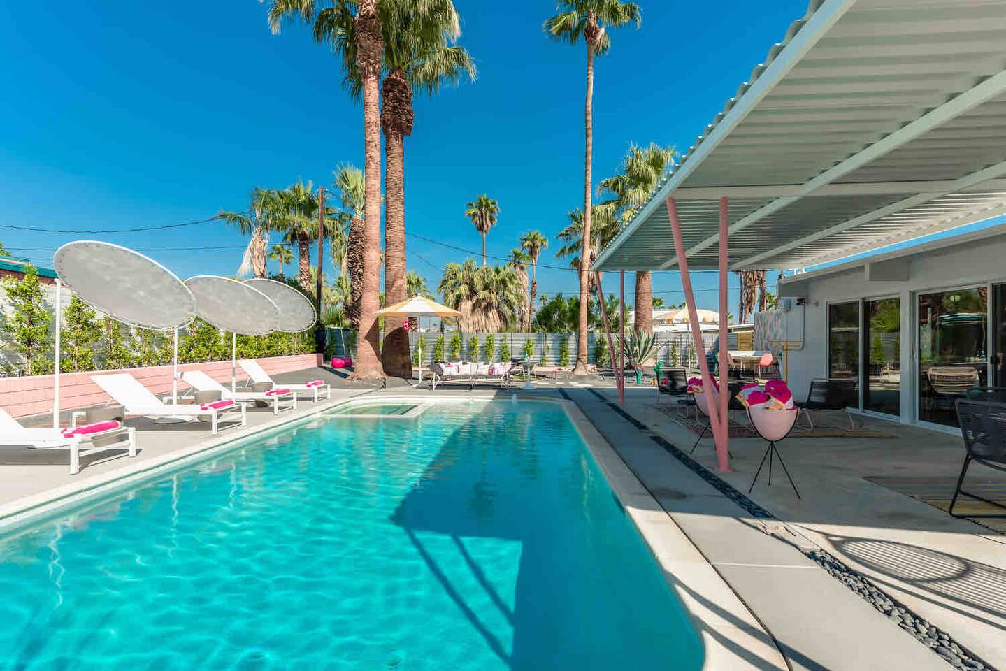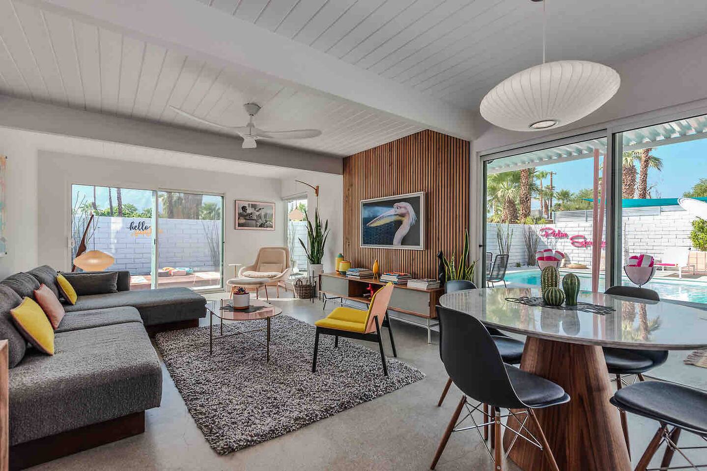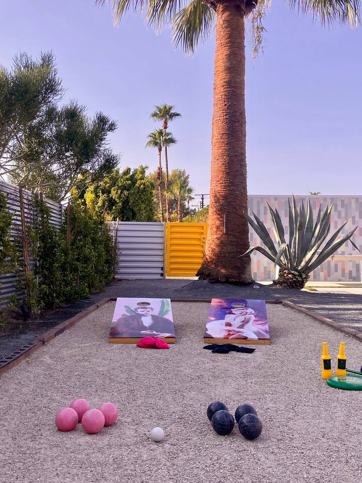 Designed by architects William Krisel and Dan Palmer and built by the Alexander Company in 1959, the home is set in the historic Racquet Club Estates neighborhood, surrounded by other vintage Alexander homes, in a quiet and clean residential area. Victoria Park, perfect for children, is two blocks away. Downtown Palm Springs and the Agua Caliente Casino are less than a five-minute drive away. Highlights include vintage/designer furniture throughout the interior and exterior, terrific views of the mountains and the tram from the house and backyard, resort-style yard, washer/dryer and a garage. Brand-new AC unit that blows cold and strong. Master bedroom has a king bed and it’s own private courtyard and private bathroom with step-in shower. Second bedroom has a king bed with access to shared courtyard. Third bedroom has a queen bed with access to shared courtyard. All bedrooms come with linen/cotton robes, yoga mats and extra towels inside their closet. We use premium Brooklinen cotton percale bedding and feature Casper mattresses and pillows in each bedroom Main guest bathroom has double vanity sinks and a large shower. Ceiling fans, night lights and phone chargers in every room. Smart TVs in every room so you can access your own streaming services in a flash. We have Disney Plus for you! A gourmet retro kitchen with everything you need to enjoy dining in or dining al fresco. There are five dining options around the house. Inside, enjoy a lovely meal around a round, marble-top table with authentic Charles and Ray Eames dining chairs by Henry Miller, or opt out for casual dining around the original kitchen island that was built in 1959. In the yard, enjoy a bistro-style meal under the covered awning or go all out for a big meal on our spacious concrete dining table that can seat 10 -12 guests. There is another bistro-style table in the front courtyard. A Roy Lichtenstein inspired wet bar with high-capacity ice maker, beverage/wine cooler and vintage 1960’s smoke grey glasses. We love good coffee and hope you do too. We are proud owners of a Jura automatic espresso/coffee maker that freshly grinds beans for every delicious cup. We also have various tea options and decaf coffee on hand. There is also an electric kettle and French press. There is a high-end turntable with external speakers to listen to a collection of our vinyls to add background music to your ambiance. Speakers are Bluetooth ready, so you can easily connect your own device. Because of the city’s strict rules on loud music played in vacation homes, we do not have built-in speakers outside in the yard. We have a credenza filled with games (poker, backgammon), activities and puzzles. The unique concrete table doubles as a ping-pong/outdoor dining table combo for those bbq dinners or sporting challenges. We also have a newly built Bocce ball court with scorekeeper. You can also play other lawn games such as Bottle Bash and Cornhole on the court as well. For BBQing, we offer a WEBER natural gas grill as well as a small charcoal grill that is primarily used for kebabs and other skewered bbq. Enjoy our fully-renovated 8' deep saltwater swimming pool complete with built-in jacuzzi spa, tanning ledge, and bubblers with LED light show. We have fun pool floats, noodles and an electric air pump. Pool heating is $75 a day (must heat every day of your stay and we need at least one days notice). We do not heat pool May-September. Spa heating and fire pit usage are included in the cost of the rental. We have a brand-new patio awning spanning the length of the house to provide shade and protection from the elements. We also have sun loungers and a daybed for soaking up the desert sun and a hot/cold outdoor shower to rinse off before and after pool time. We have a yoga/meditation exercise deck for those of you that need your sun salutations in the desert. Enjoy walking through the front breezeway of the house where you can admire various cacti and desert plants in our breezeway garden. Just don’t get too close…cacti have prickly personalities. There’s no reason to leave once you arrive. However, we have lots of suggestions for you in our house manual for dining out, going shopping and enjoying excursions throughout the Coachella valley. This is our home away from home. We are very selective with who we think will be a good fit for renting our property; this is why we don’t allow instant booking. For starters, the home is surrounded by full-time neighbors who love and care for our neighborhood. So this is not a party house. Our neighborhood is quiet and serene. We love guests who will care for our home and belongings the same way you care for your home. We have painstakingly poured our hearts and resources into every square inch of this house. We want you to unwind, let go and fully enjoy your vacation here. We just expect our guests to be thoughtful and mindful about caring for the space, whether you’re staying for a couple of nights or for several weeks. Please note that the City of Palm Springs has very strict vacation rental guidelines. These guidelines are set to help balance the needs of the local community as well as the needs of the vibrant tourist culture that our city thrives on. Some guidelines are no loud music that can be heard outside the property line; limited car parking on streets and cars limited to how many bedrooms a vacation home has; neighborhood quiet hours start at 10pm; only two persons per bedroom can stay overnight. Neighbors have a hotline they can call to report vacation rental disturbances to a city compliance officer. We want to avoid this so you don’t get cited with a hefty fine and we don’t get dinged as a problematic vacation rental. Palm Springs city tax of 12.5% is included in the rate sheet. The city also requires an additional written contract which will be sent to you before your arrival. It is a straightforward good-neighbor agreement. We look forward to hearing from you. The City of 