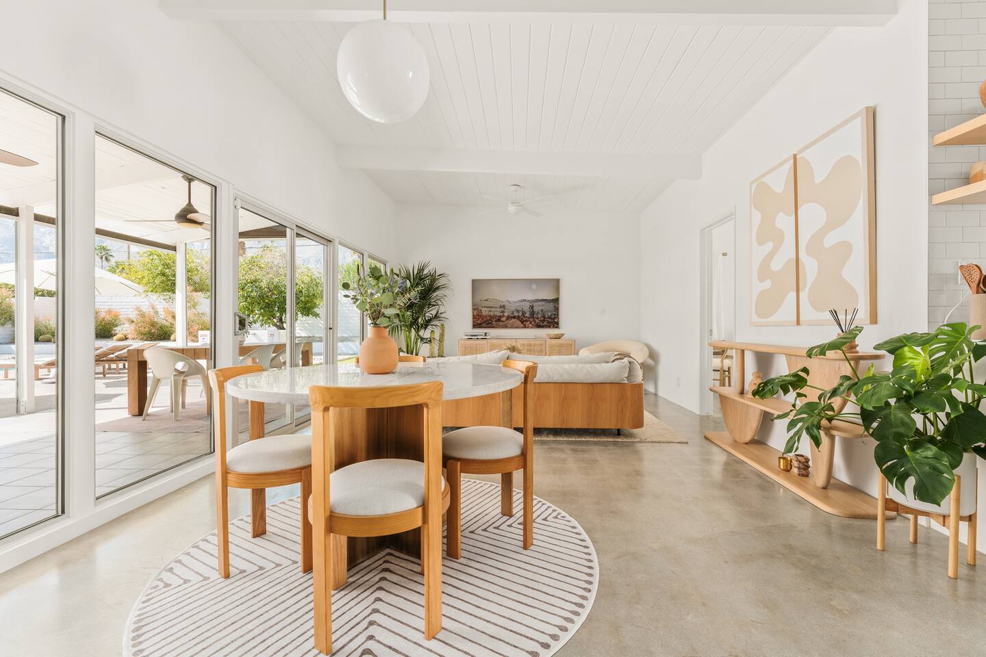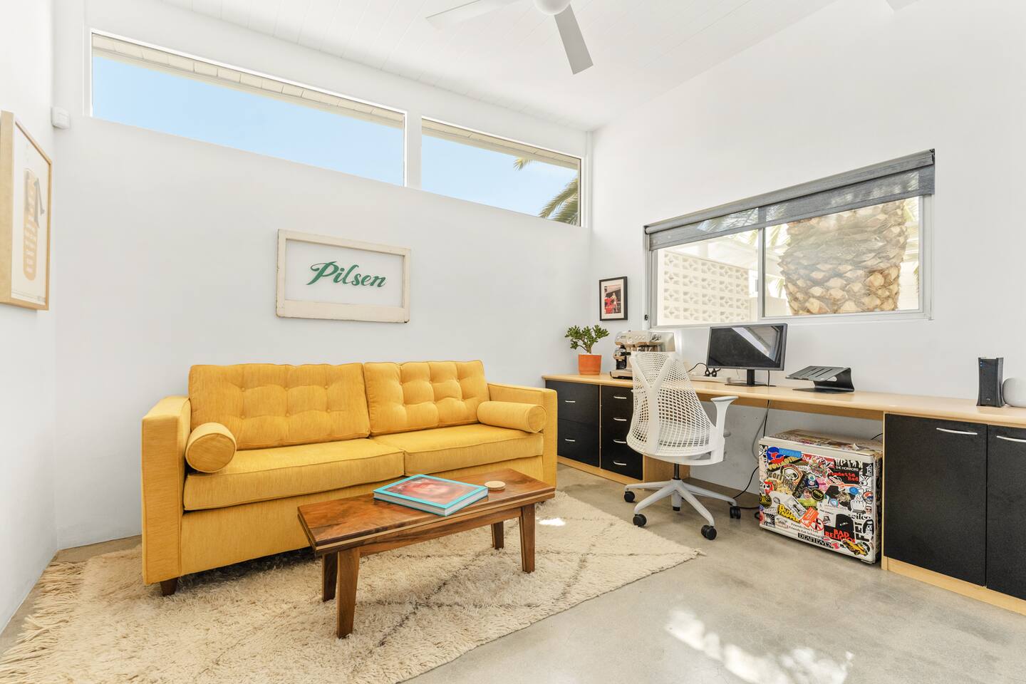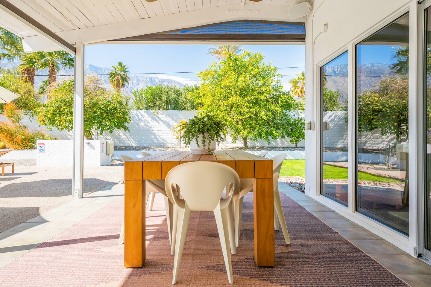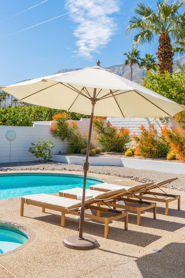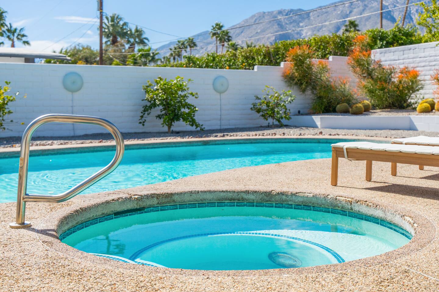 This mid-century Meiselman is on a huge lot (over 10,000 sqft) with incredible views and an expansive backyard. The home features a large, grassy yard, a kidney bean-shaped pool, and a hot tub. The yard is full of citrus trees so please help yourself to some oranges or grapefruits for your morning juice. Enjoy spectacular views of the San Jacinto Mountains from our lounge chairs or outdoor dining table. The interior is open-concept and includes a formal dining area. The kitchen is well equipped and includes up-to-date appliances (dishwasher, fridge, oven as well as all standard smaller appliances including a coffee maker, toaster, blender, etc.) We are also well stocked with pots and pans, utensils, etc. The primary bedroom has a king-size bed, ensuite bathroom, walk-in closet, vanity/desk, and flatscreen TV. The second bedroom has a queen-size bed, flat screen TV, and a spacious closet with built-in drawers. Located next door to the second bathroom which includes a shower. The office has a fully functional workspace and pull-out sofa, with a queen-size mattress. Expect a strong wifi signal throughout and Sonos sound system to enjoy your music. Pool heat is available for an additional charge. Price varies based on season. Please inquire if interested prior to booking. Spa heat is complimentary. Please Note: We provide high-quality sheets (Brooklinen) and towels to ensure a comfortable and luxurious stay. We kindly ask guests to treat the home and all its furnishings with care. Excessively stained or damaged linens (including towels and bedding) may incur a replacement fee. We appreciate your understanding and respect for keeping the space clean and welcoming for everyone.