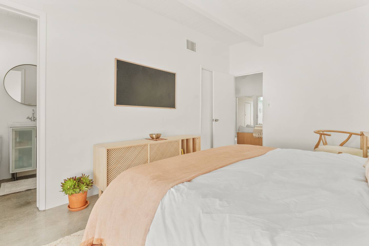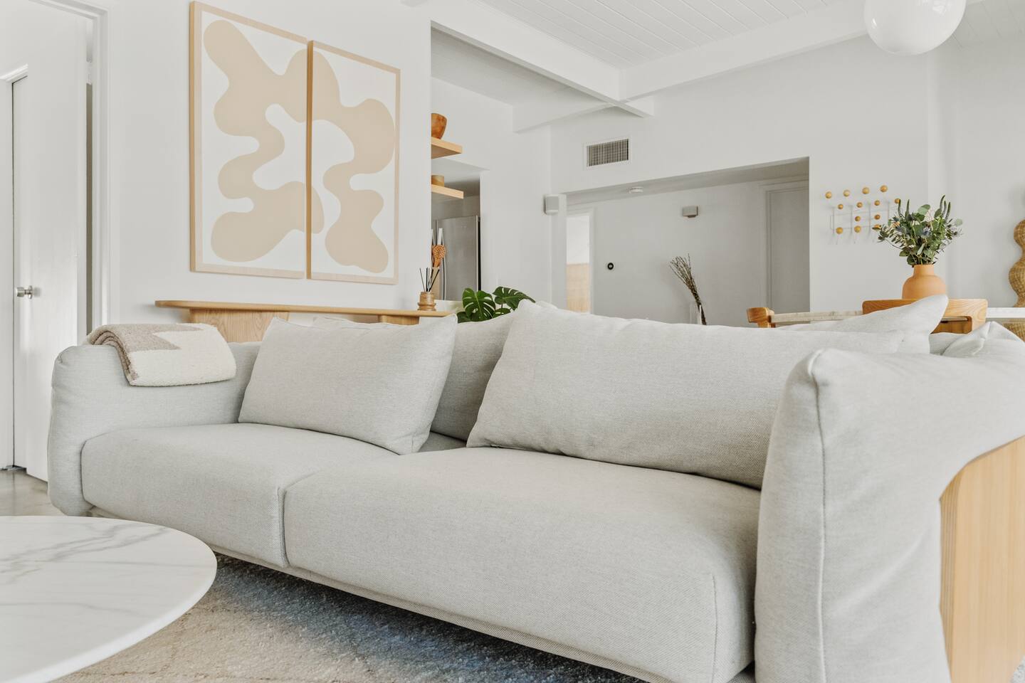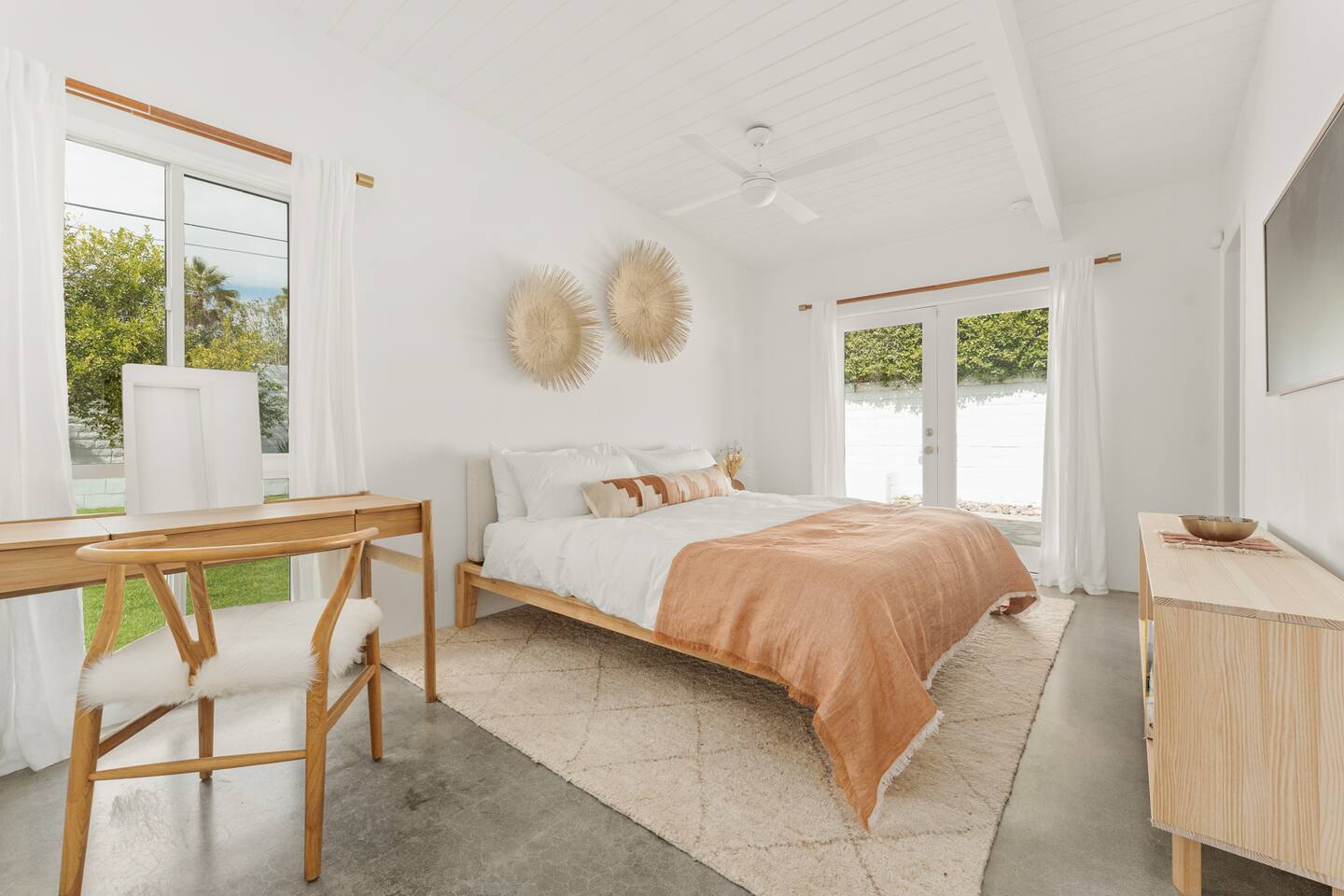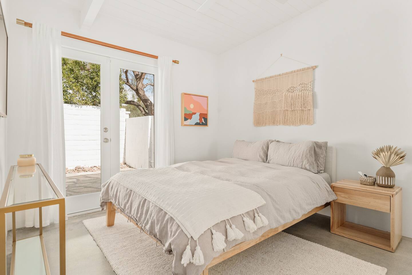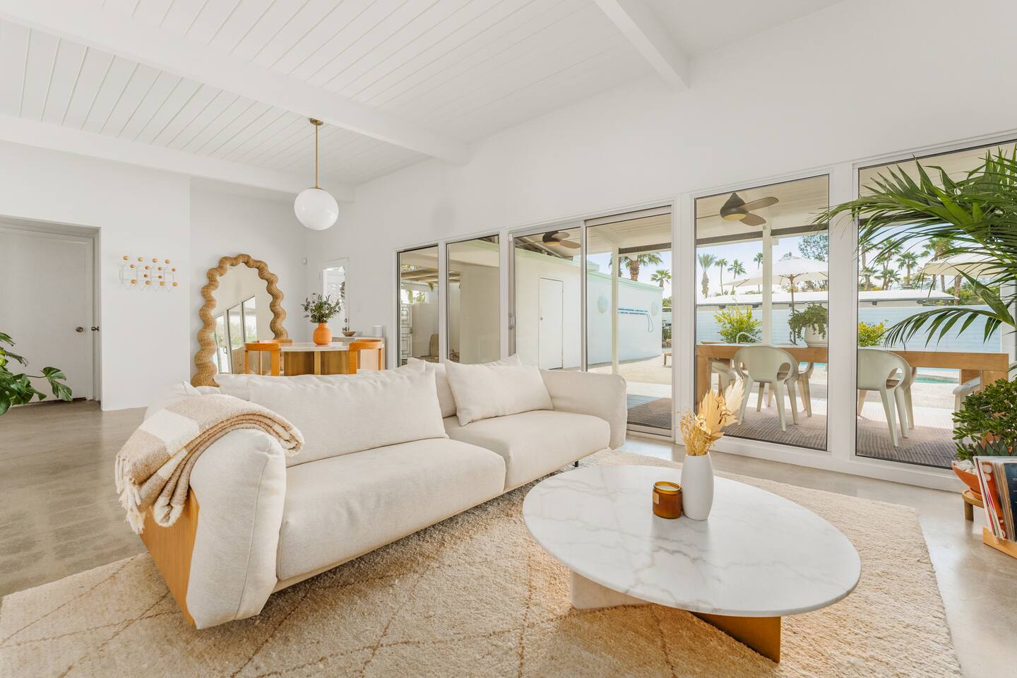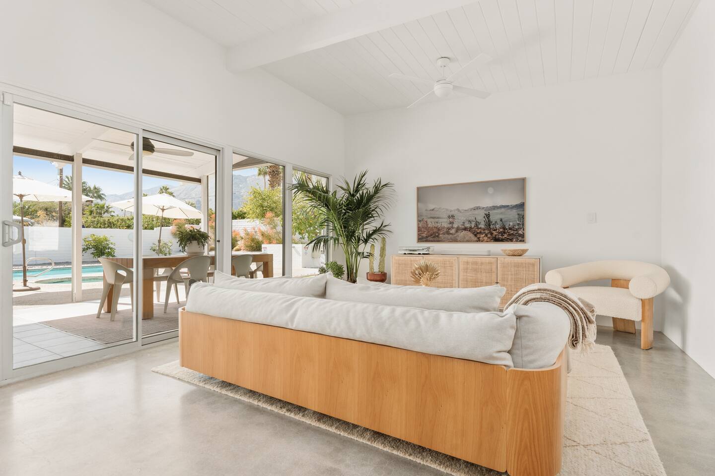 This mid-century Meiselman is on a huge lot (over 10,000 sqft) with incredible views and an expansive backyard. The home features a large, grassy yard, a kidney bean-shaped pool, and a hot tub. The yard is full of citrus trees so please help yourself to some oranges or grapefruits for your morning juice. Enjoy spectacular views of the San Jacinto Mountains from our lounge chairs or outdoor dining table. The interior is open-concept and includes a formal dining area. The kitchen is well equipped and includes up-to-date appliances (dishwasher, fridge, oven as well as all standard smaller appliances including a coffee maker, toaster, blender, etc.) We are also well stocked with pots and pans, utensils, etc. The primary bedroom has a king-size bed, ensuite bathroom, walk-in closet, vanity/desk, and flatscreen TV. The second bedroom has a queen-size bed, flat screen TV, and a spacious closet with built-in drawers. Located next door to the second bathroom which includes a shower. The office has a fully functional workspace and pull-out sofa, with a queen-size mattress. Expect a strong wifi signal throughout and Sonos sound system to enjoy your music. Pool heat is available for an additional charge. Price varies based on season. Please inquire if interested prior to booking. Spa heat is complimentary. Please Note: We provide high-quality sheets (Brooklinen) and towels to ensure a comfortable and luxurious stay. We kindly ask guests to treat the home and all its furnishings with care. Excessively stained or damaged linens (including towels and bedding) may incur a replacement fee. We appreciate your understanding and respect for keeping the space clean and welcoming for everyone.