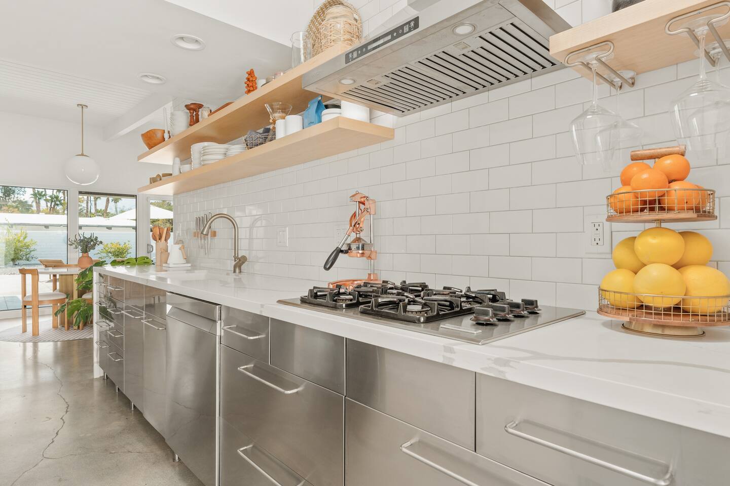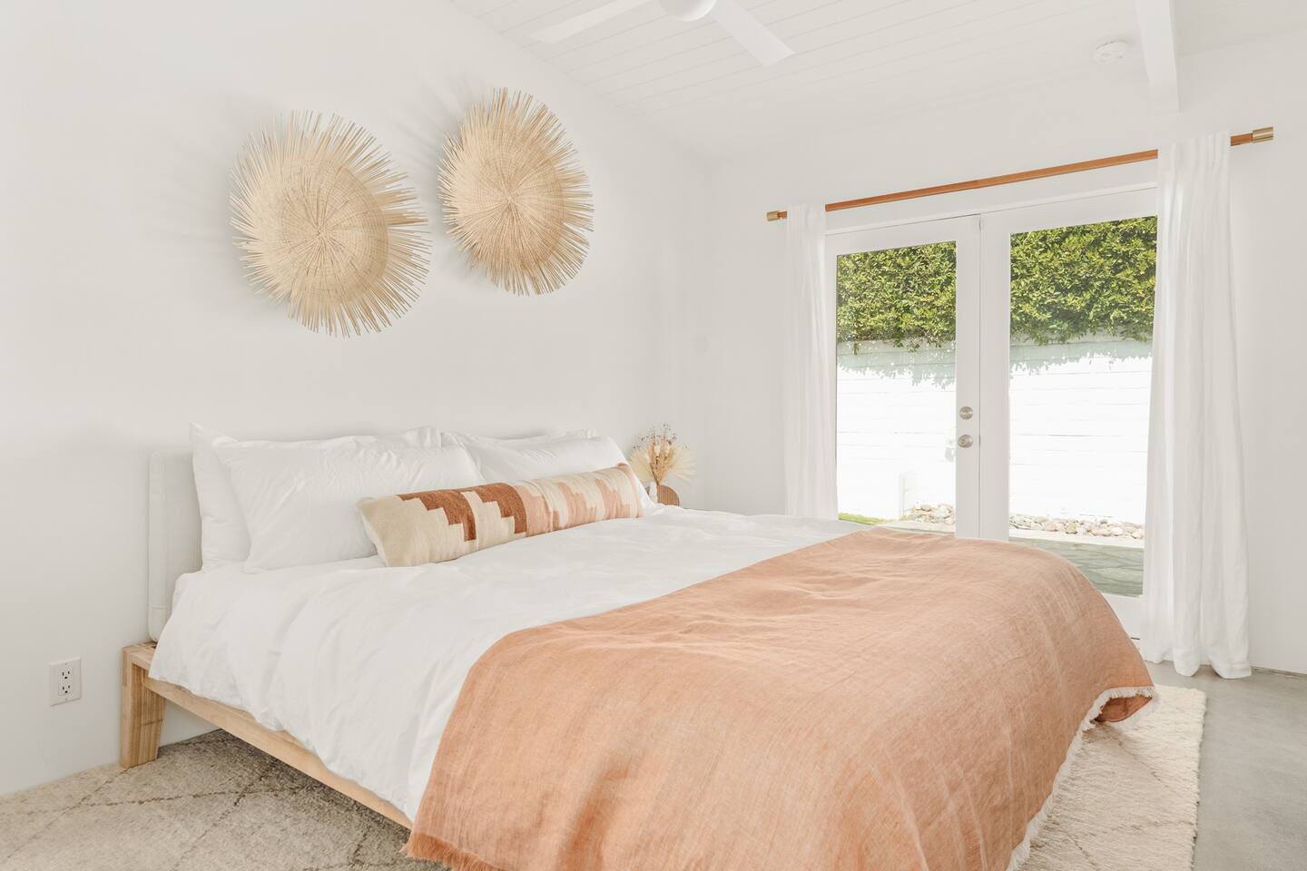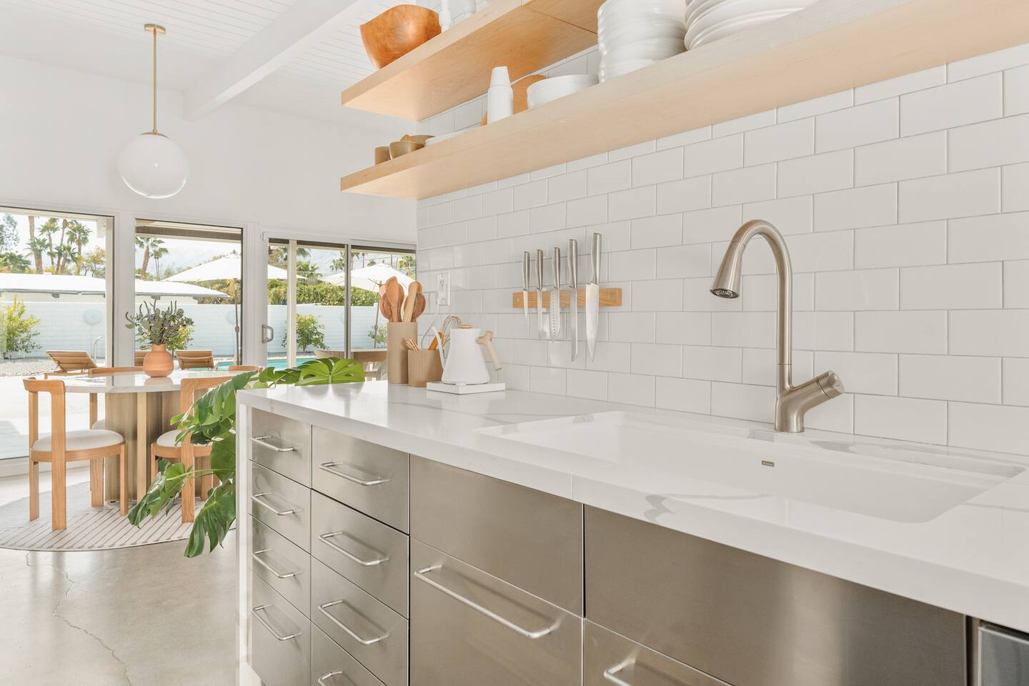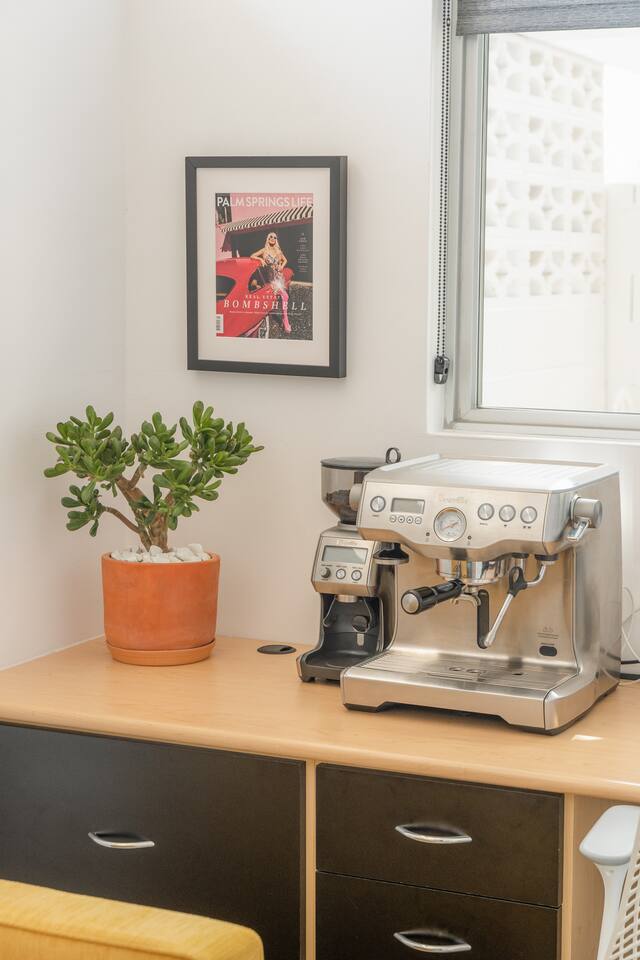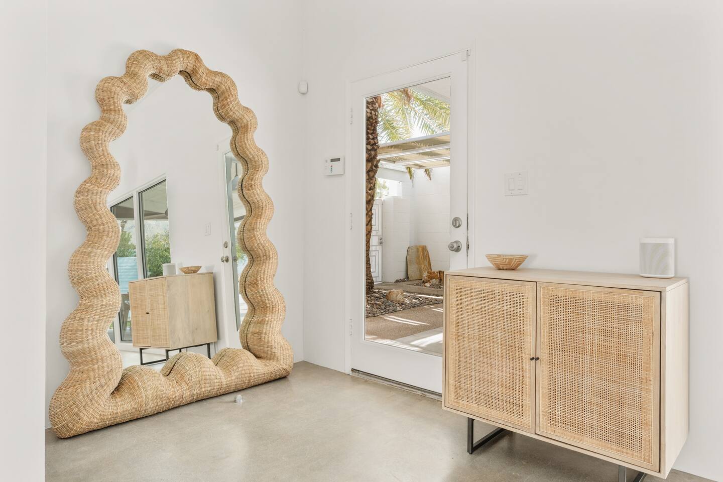 This mid-century Meiselman is on a huge lot (over 10,000 sqft) with incredible views and an expansive backyard. The home features a large, grassy yard, a kidney bean-shaped pool, and a hot tub. The yard is full of citrus trees so please help yourself to some oranges or grapefruits for your morning juice. Enjoy spectacular views of the San Jacinto Mountains from our lounge chairs or outdoor dining table. The interior is open-concept and includes a formal dining area. The kitchen is well equipped and includes up-to-date appliances (dishwasher, fridge, oven as well as all standard smaller appliances including a coffee maker, toaster, blender, etc.) We are also well stocked with pots and pans, utensils, etc. The primary bedroom has a king-size bed, ensuite bathroom, walk-in closet, vanity/desk, and flatscreen TV. The second bedroom has a queen-size bed, flat screen TV, and a spacious closet with built-in drawers. Located next door to the second bathroom which includes a shower. The office has a fully functional workspace and pull-out sofa, with a queen-size mattress. Expect a strong wifi signal throughout and Sonos sound system to enjoy your music. Pool heat is available for an additional charge. Price varies based on season. Please inquire if interested prior to booking. Spa heat is complimentary. Please Note: We provide high-quality sheets (Brooklinen) and towels to ensure a comfortable and luxurious stay. We kindly ask guests to treat the home and all its furnishings with care. Excessively stained or damaged linens (including towels and bedding) may incur a replacement fee. We appreciate your understanding and respect for keeping the space clean and welcoming for everyone.