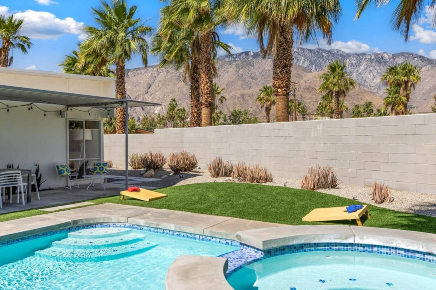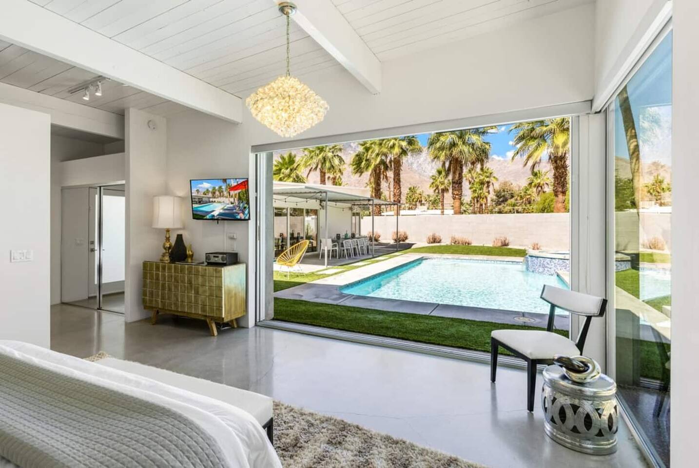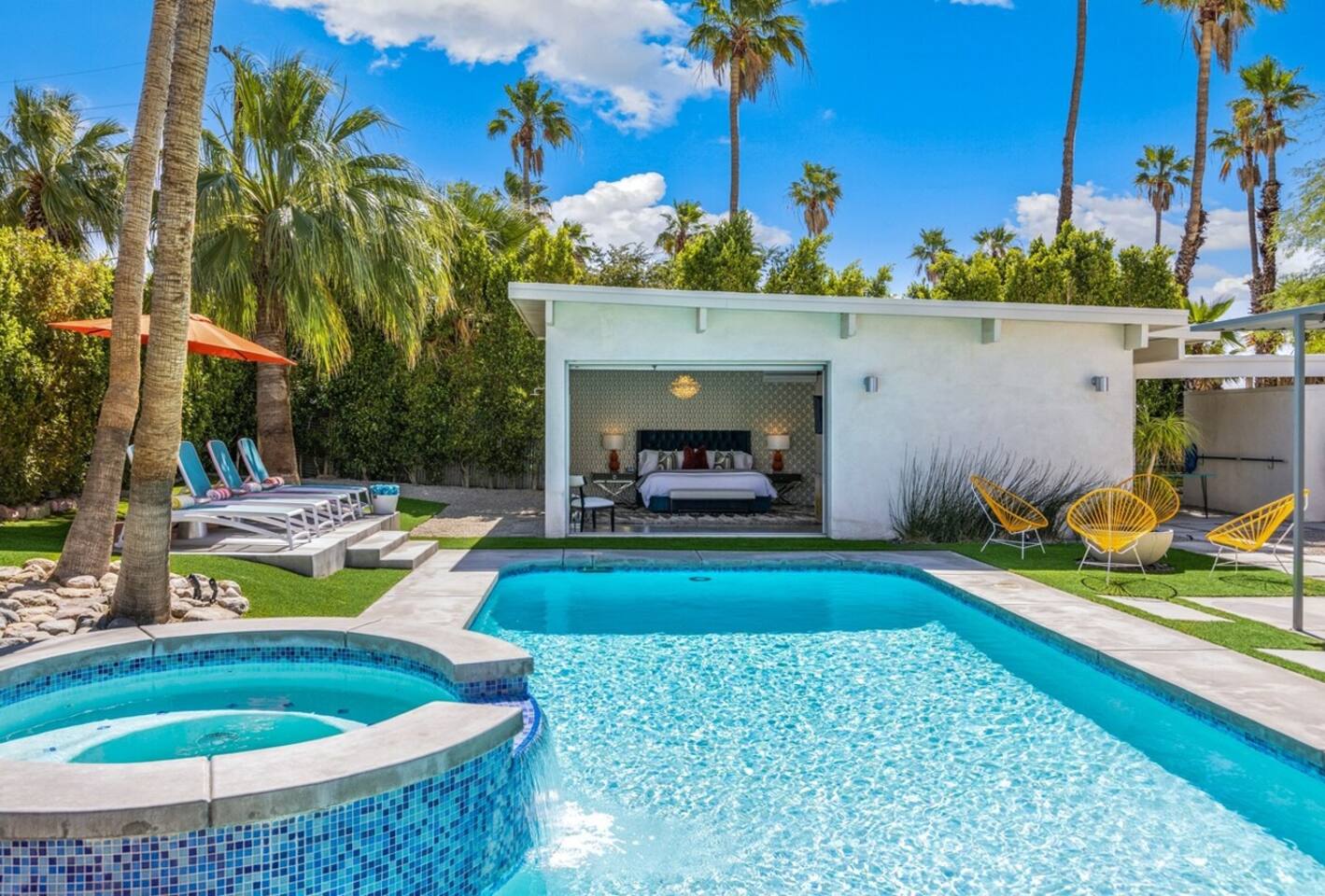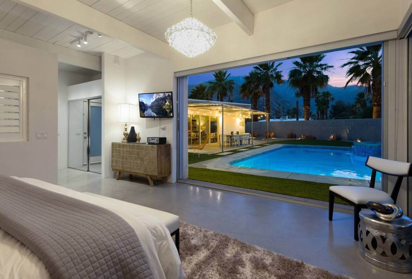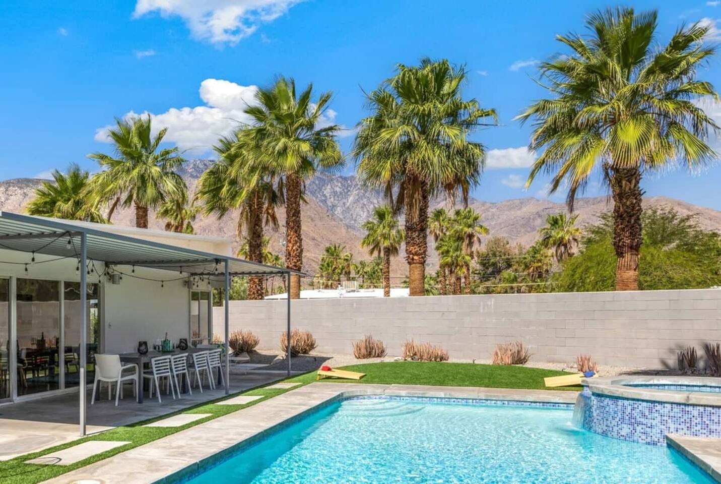 The main house has a modern kitchen with a Jennair range, island and stainless steel appliances. The primary bedroom has a king size bed with mountain view, smart tv and en suite bathroom. Guest bedroom 2 has a king bed, smart tv and workspace area. Guest bedroom 3 has a queen size bed and smart tv. A recently added poolside detached casita offers a deluxe his and hers bathroom and king size bed, with an oversize glass wall that opens on to the pool. Relax in the salt water pool, and enjoy the amazing views of palm trees and the San Jacinto Mountain. The very private back yard offers a resort style experience , including a spa , fire pit , ping pong table, corn hole, dining table and Weber grille.