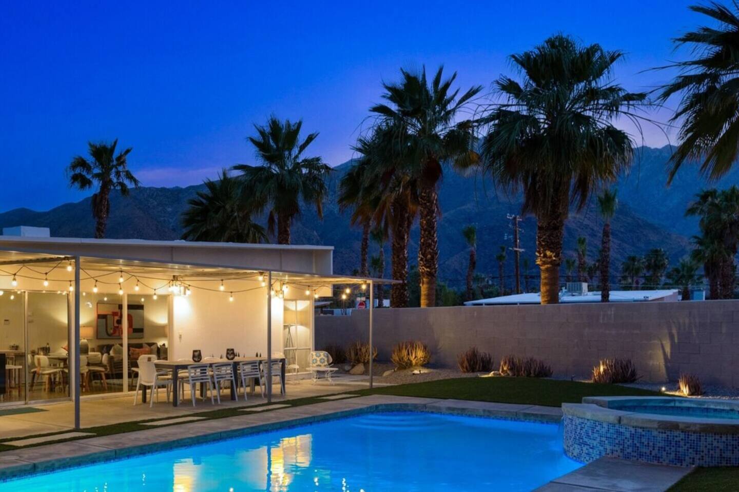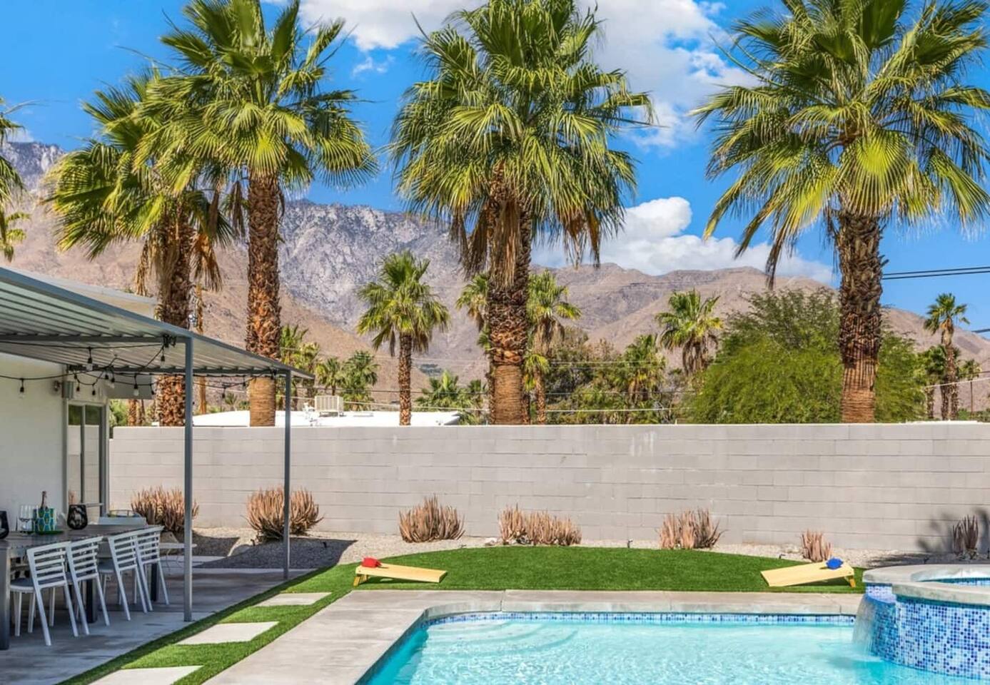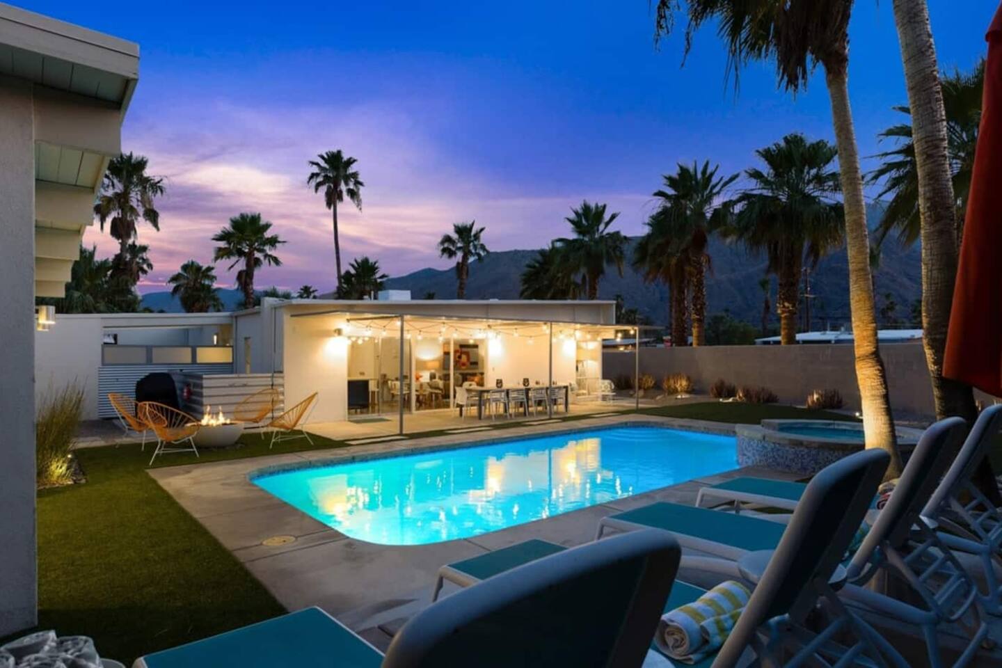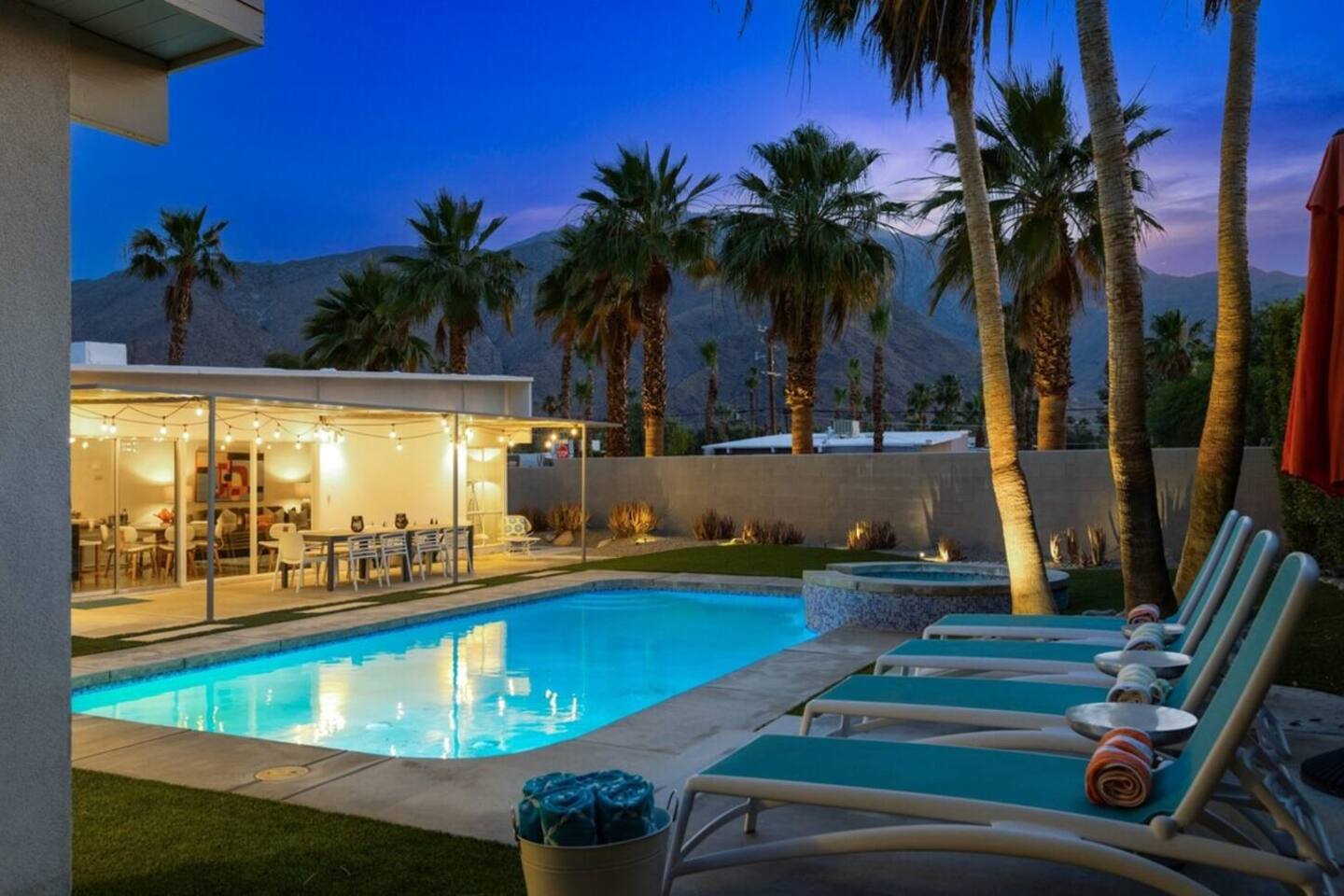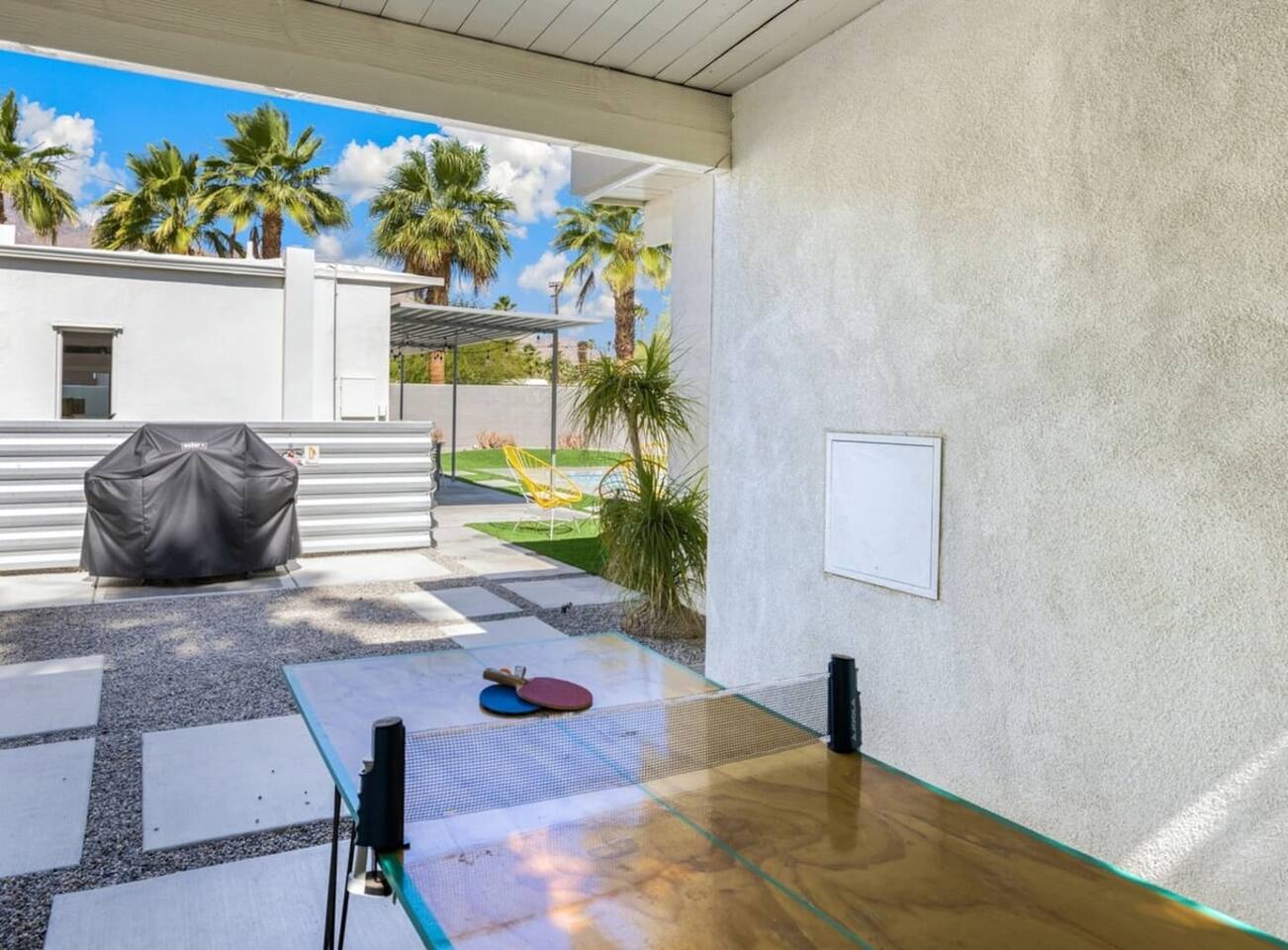 The main house has a modern kitchen with a Jennair range, island and stainless steel appliances. The primary bedroom has a king size bed with mountain view, smart tv and en suite bathroom. Guest bedroom 2 has a king bed, smart tv and workspace area. Guest bedroom 3 has a queen size bed and smart tv. A recently added poolside detached casita offers a deluxe his and hers bathroom and king size bed, with an oversize glass wall that opens on to the pool. Relax in the salt water pool, and enjoy the amazing views of palm trees and the San Jacinto Mountain. The very private back yard offers a resort style experience , including a spa , fire pit , ping pong table, corn hole, dining table and Weber grille.
