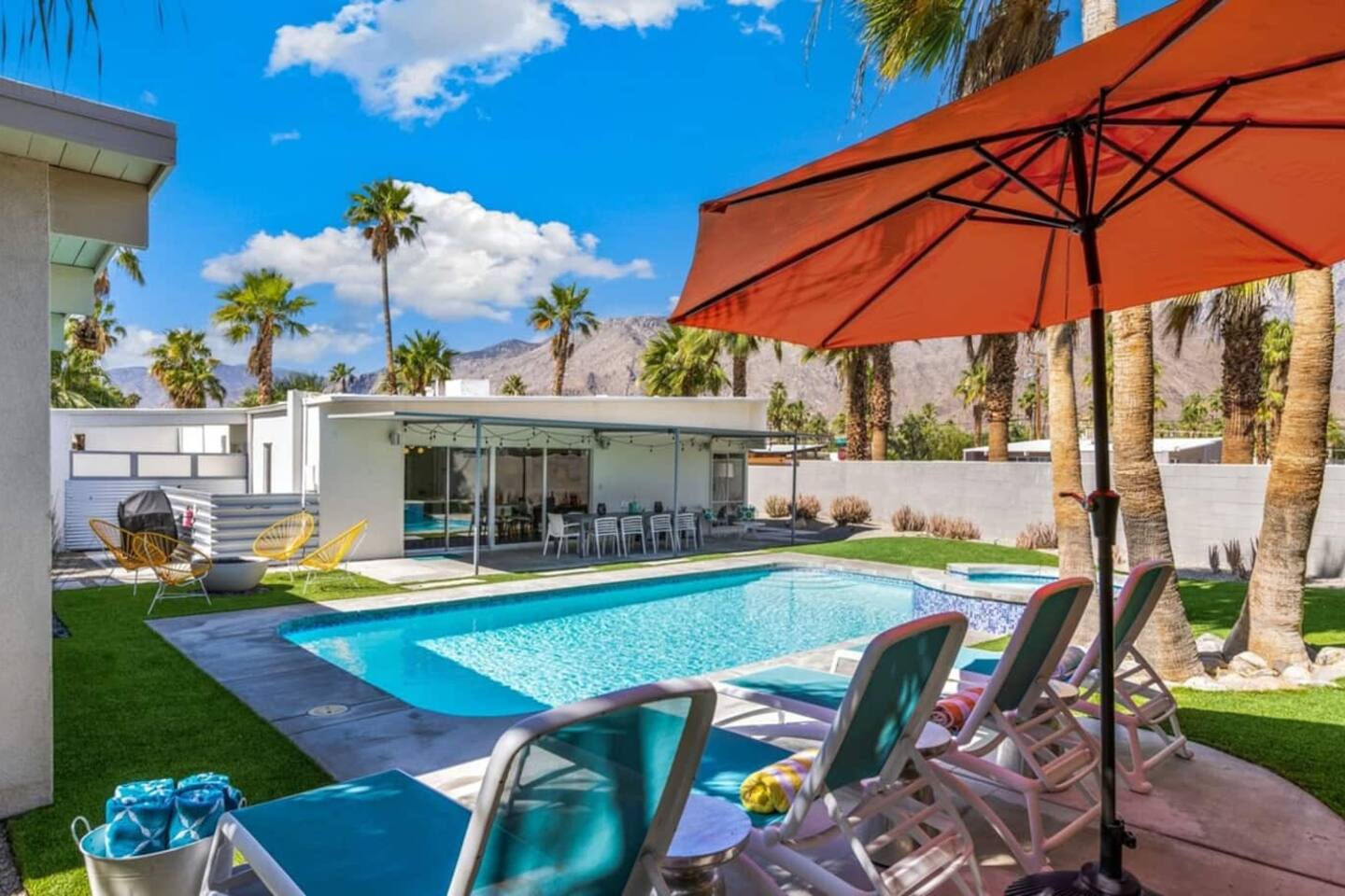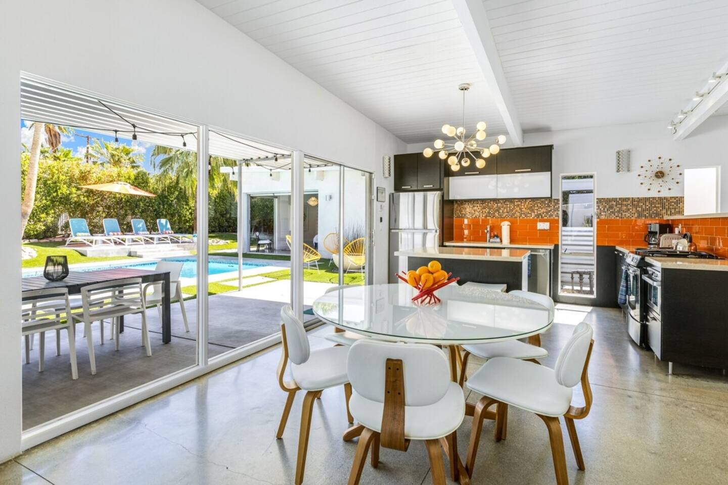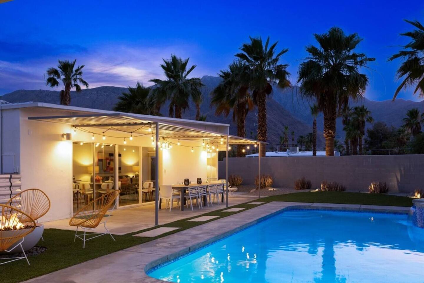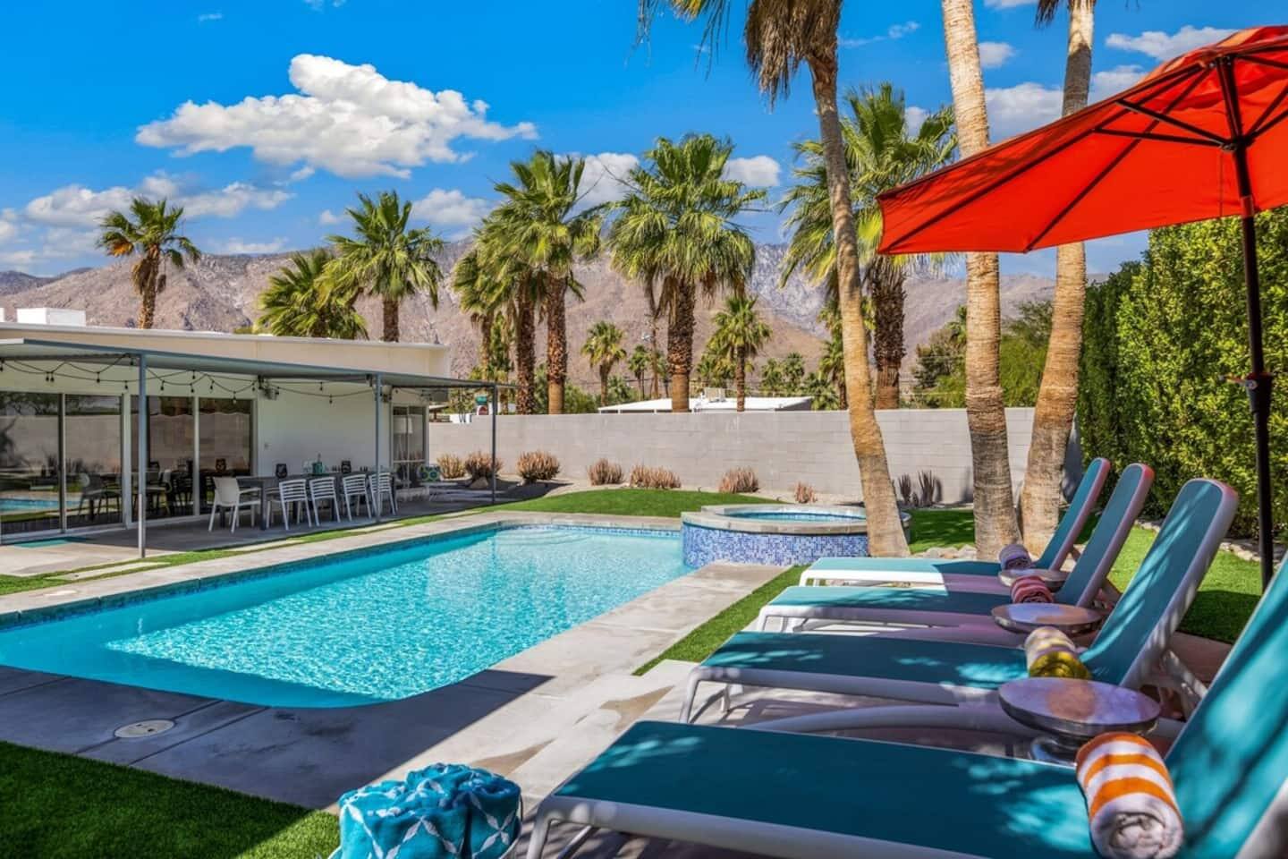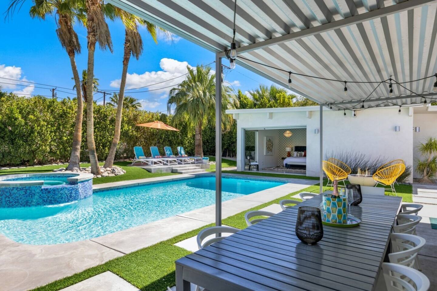 The main house has a modern kitchen with a Jennair range, island and stainless steel appliances. The primary bedroom has a king size bed with mountain view, smart tv and en suite bathroom. Guest bedroom 2 has a king bed, smart tv and workspace area. Guest bedroom 3 has a queen size bed and smart tv. A recently added poolside detached casita offers a deluxe his and hers bathroom and king size bed, with an oversize glass wall that opens on to the pool. Relax in the salt water pool, and enjoy the amazing views of palm trees and the San Jacinto Mountain. The very private back yard offers a resort style experience , including a spa , fire pit , ping pong table, corn hole, dining table and Weber grille.
