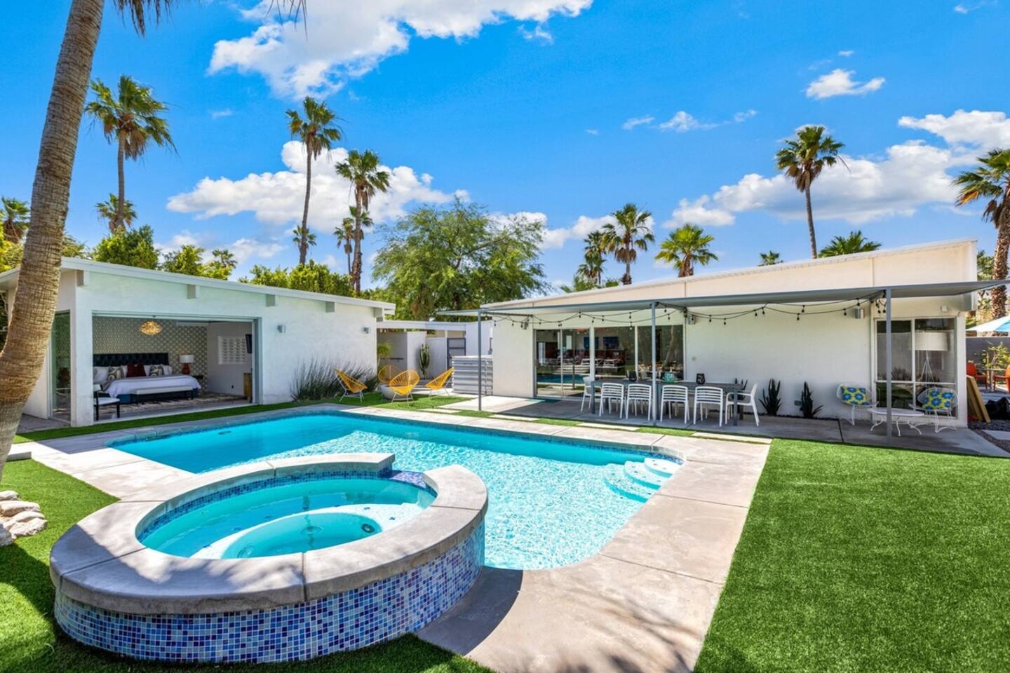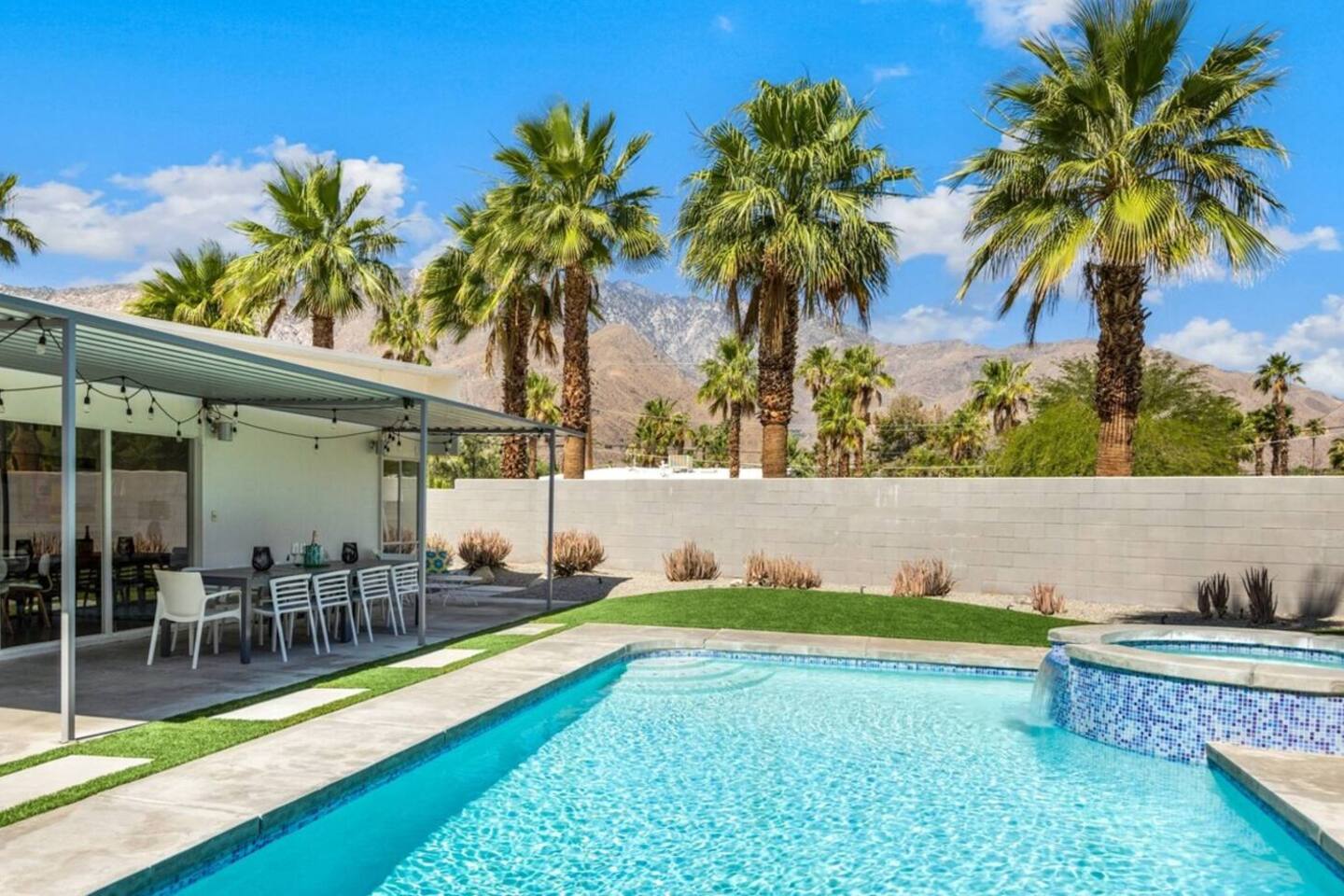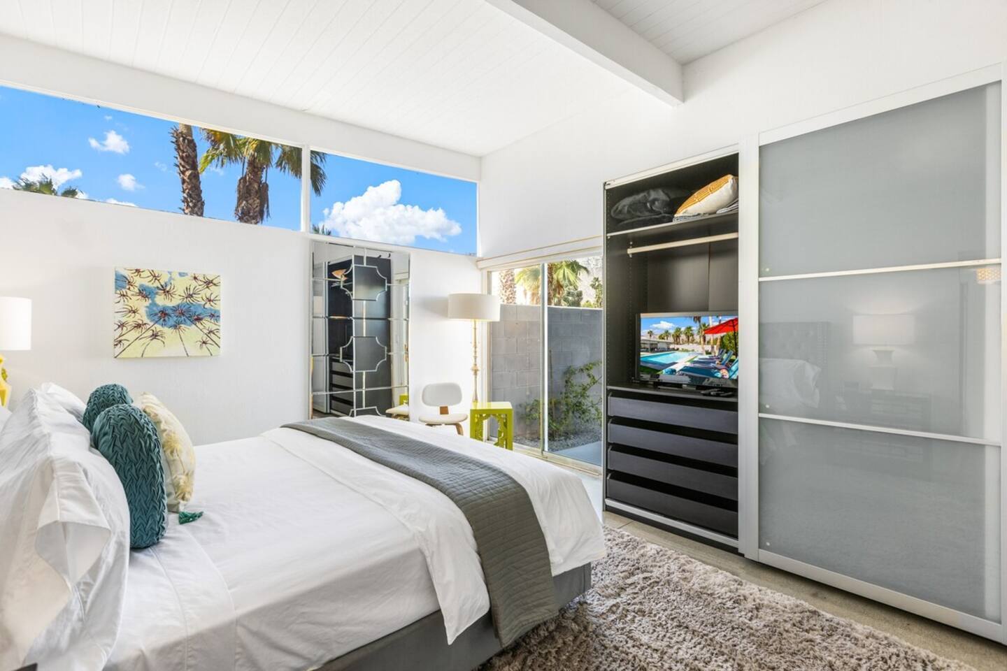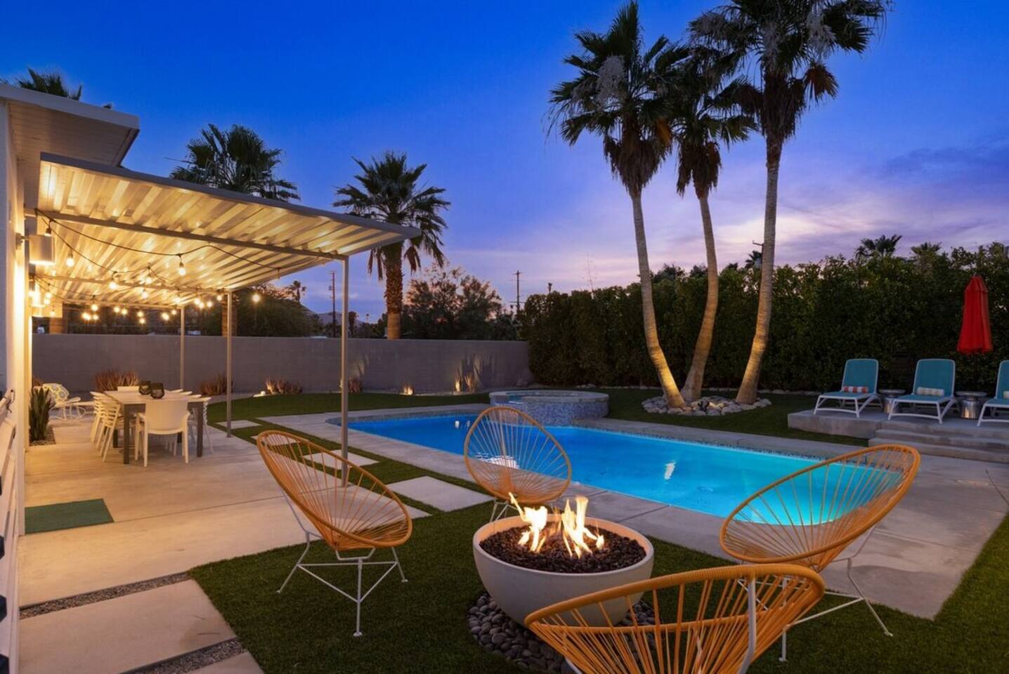 The main house has a modern kitchen with a Jennair range, island and stainless steel appliances. The primary bedroom has a king size bed with mountain view, smart tv and en suite bathroom. Guest bedroom 2 has a king bed, smart tv and workspace area. Guest bedroom 3 has a queen size bed and smart tv. A recently added poolside detached casita offers a deluxe his and hers bathroom and king size bed, with an oversize glass wall that opens on to the pool. Relax in the salt water pool, and enjoy the amazing views of palm trees and the San Jacinto Mountain. The very private back yard offers a resort style experience , including a spa , fire pit , ping pong table, corn hole, dining table and Weber grille.