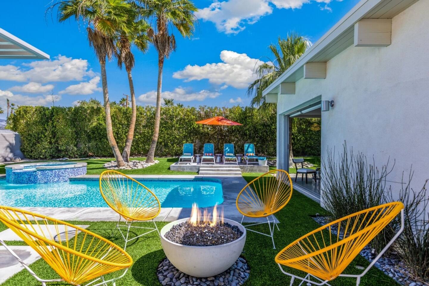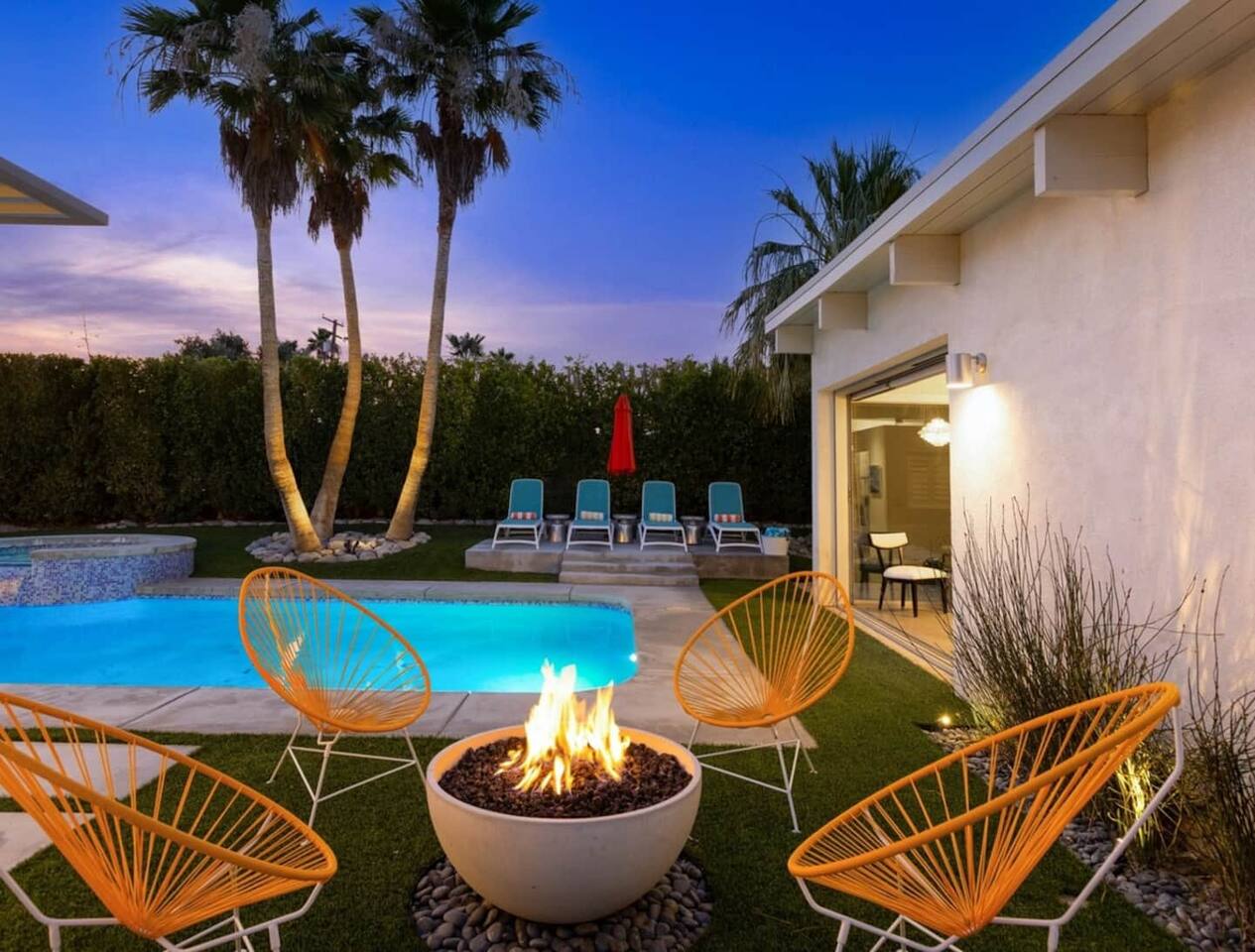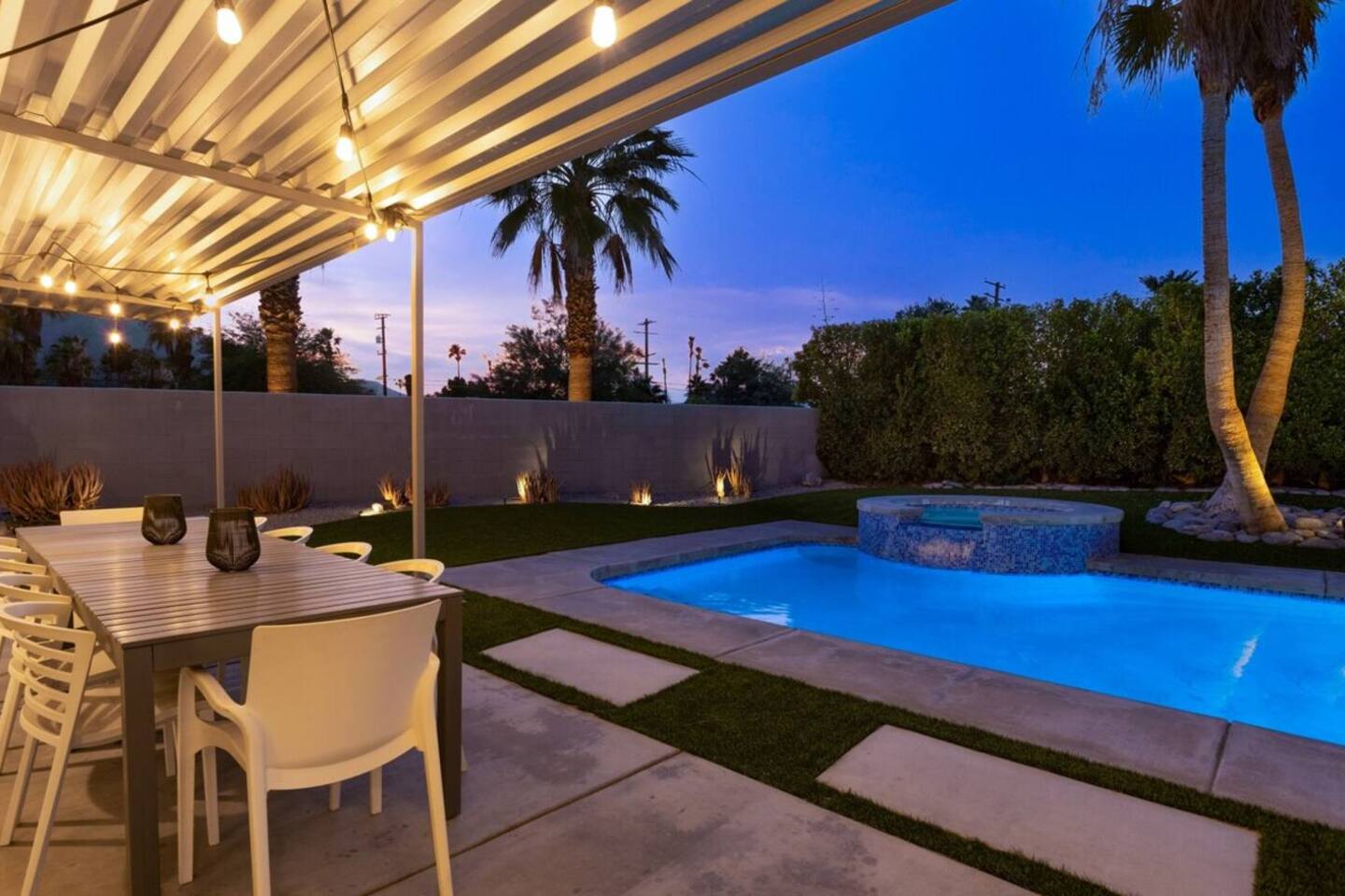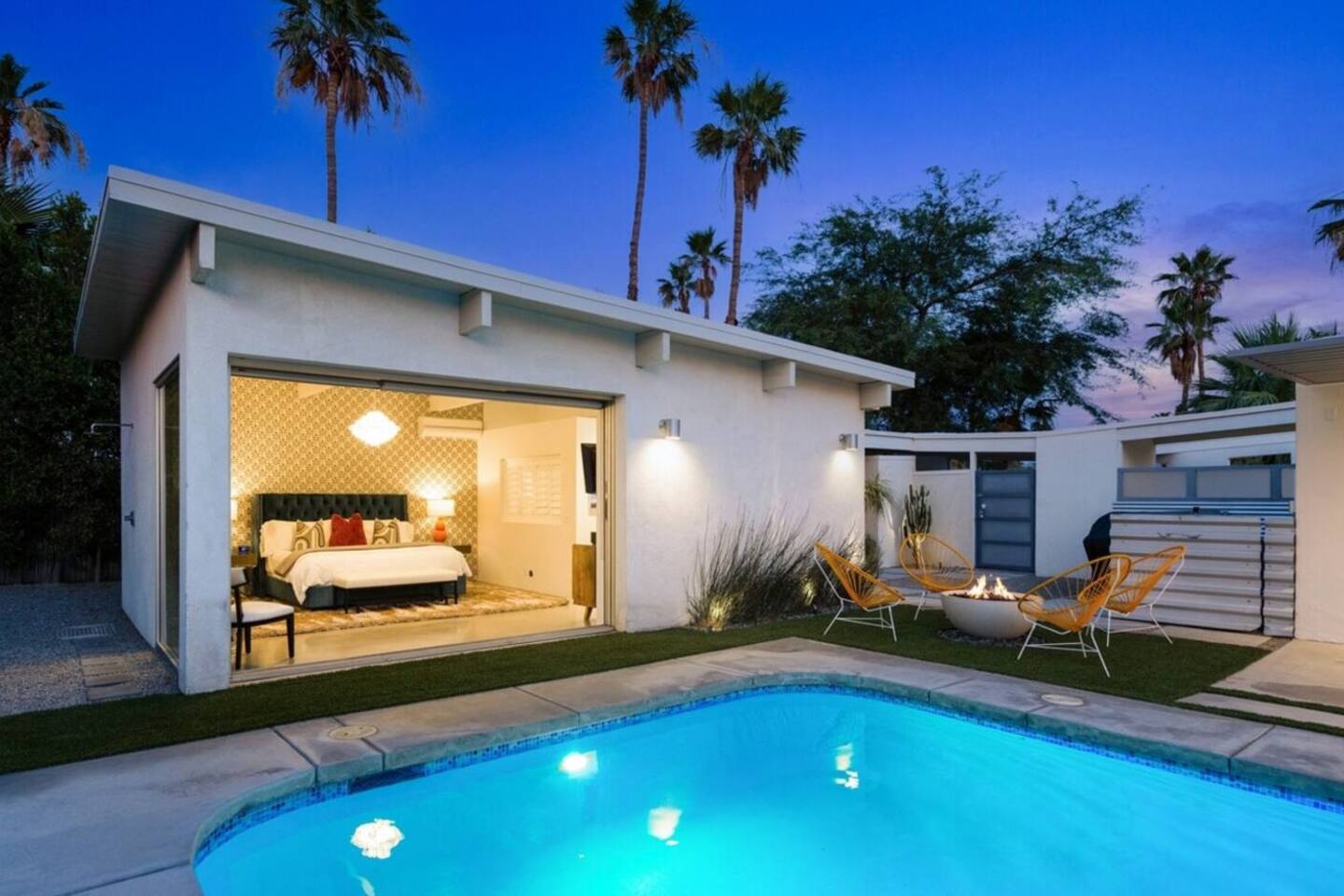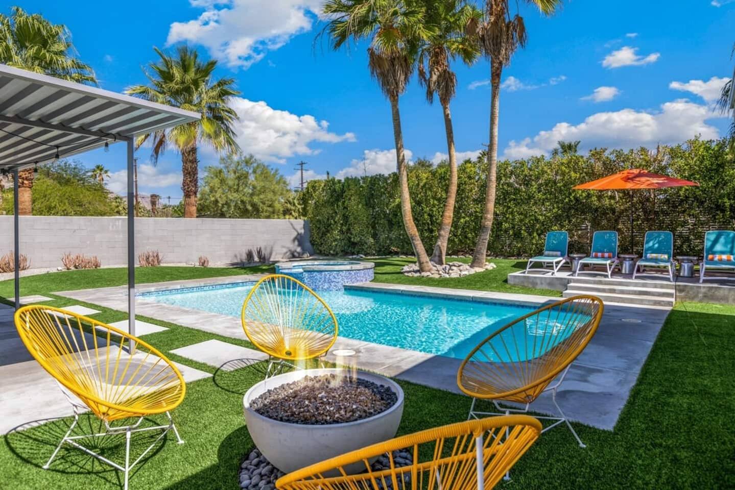 The main house has a modern kitchen with a Jennair range, island and stainless steel appliances. The primary bedroom has a king size bed with mountain view, smart tv and en suite bathroom. Guest bedroom 2 has a king bed, smart tv and workspace area. Guest bedroom 3 has a queen size bed and smart tv. A recently added poolside detached casita offers a deluxe his and hers bathroom and king size bed, with an oversize glass wall that opens on to the pool. Relax in the salt water pool, and enjoy the amazing views of palm trees and the San Jacinto Mountain. The very private back yard offers a resort style experience , including a spa , fire pit , ping pong table, corn hole, dining table and Weber grille.