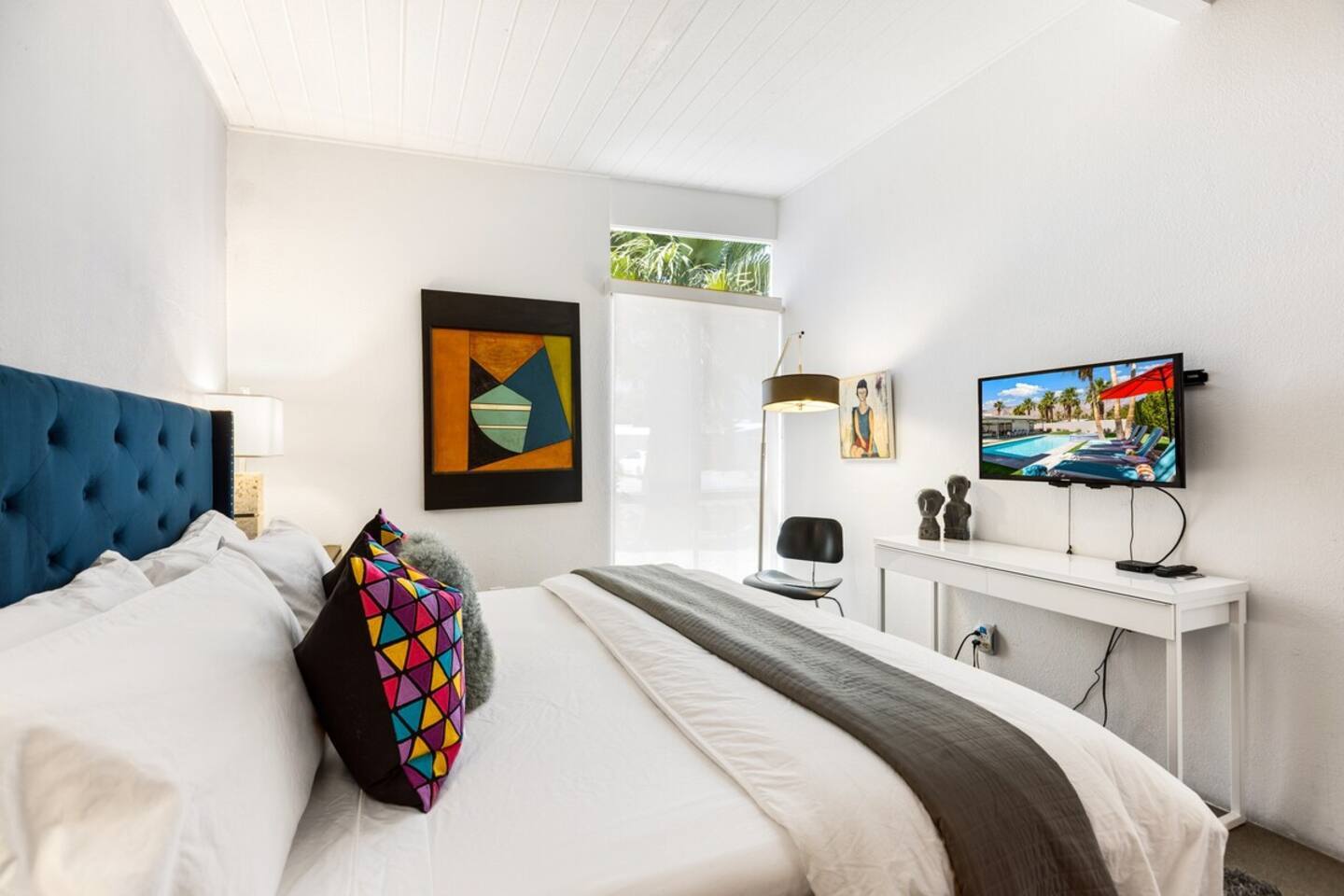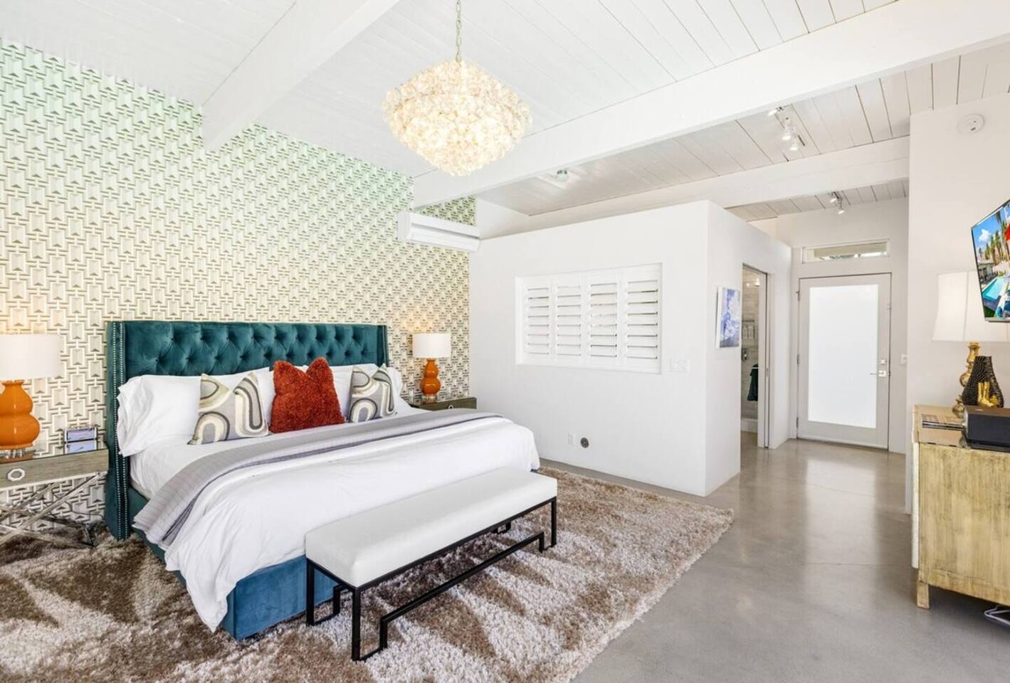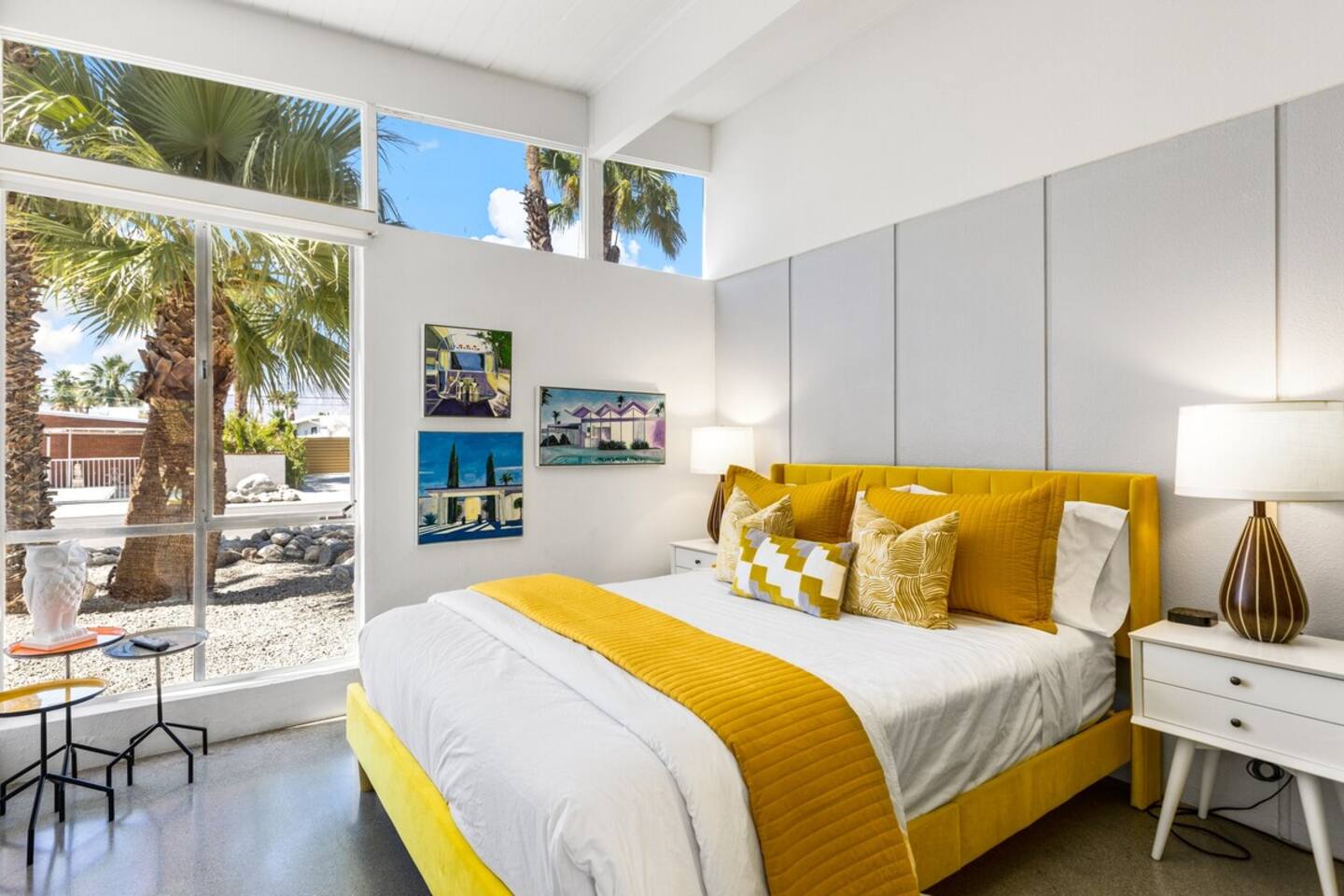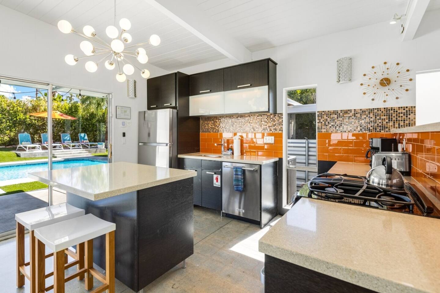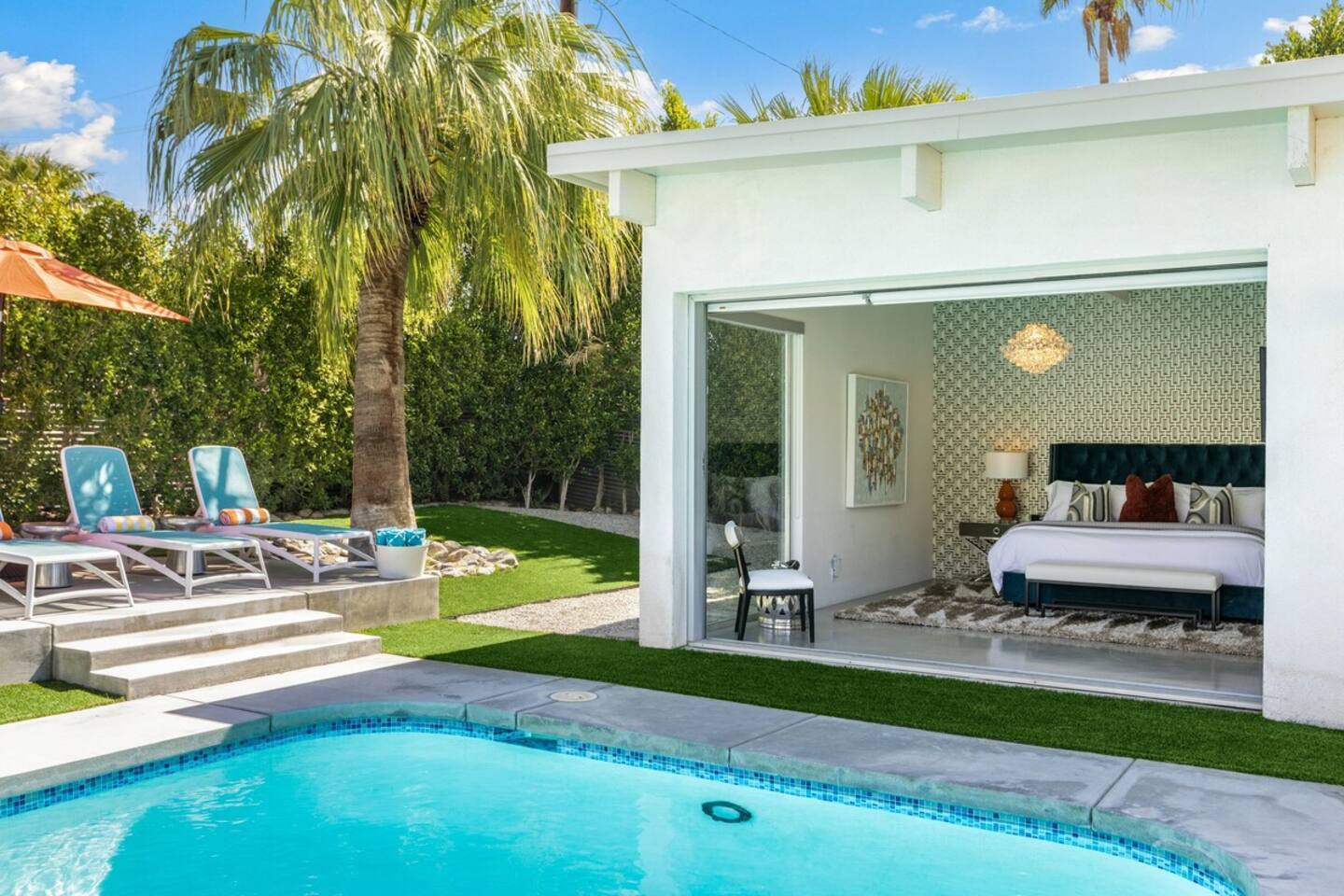 The main house has a modern kitchen with a Jennair range, island and stainless steel appliances. The primary bedroom has a king size bed with mountain view, smart tv and en suite bathroom. Guest bedroom 2 has a king bed, smart tv and workspace area. Guest bedroom 3 has a queen size bed and smart tv. A recently added poolside detached casita offers a deluxe his and hers bathroom and king size bed, with an oversize glass wall that opens on to the pool. Relax in the salt water pool, and enjoy the amazing views of palm trees and the San Jacinto Mountain. The very private back yard offers a resort style experience , including a spa , fire pit , ping pong table, corn hole, dining table and Weber grille.