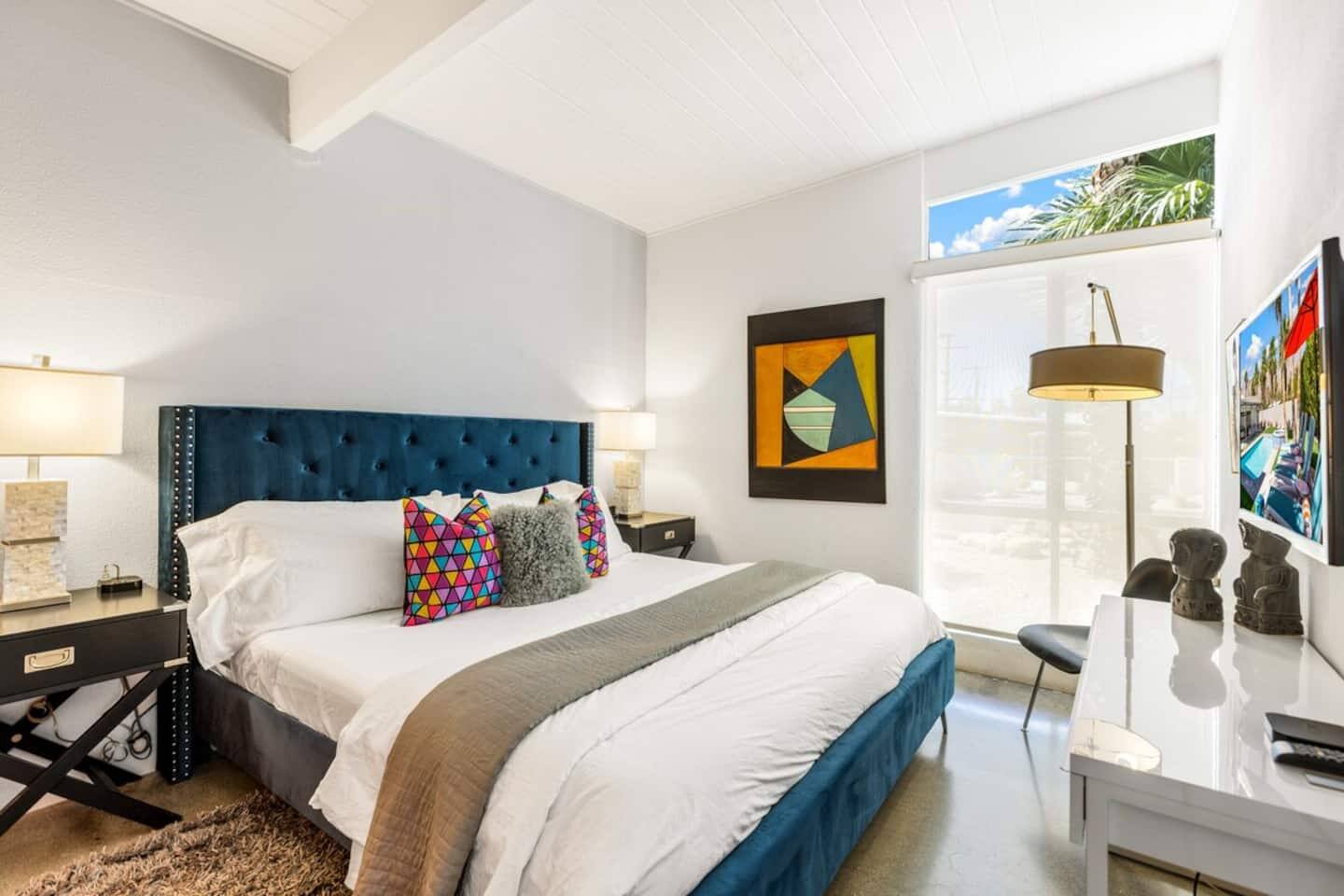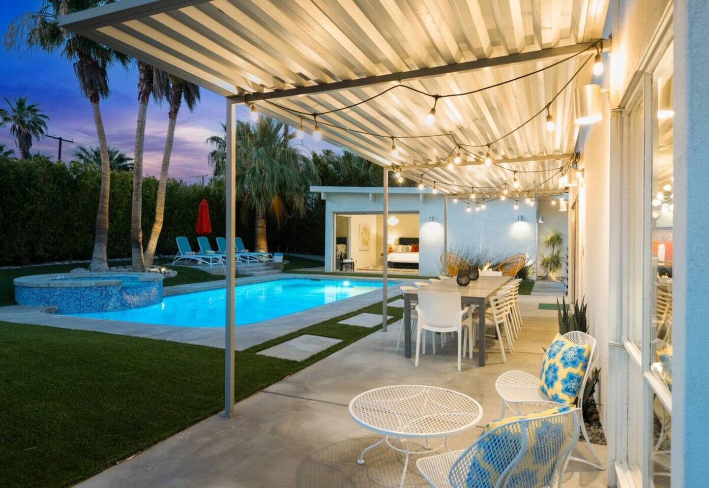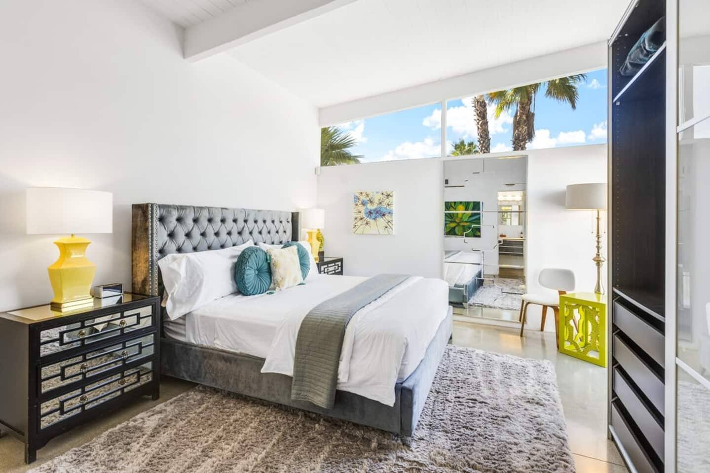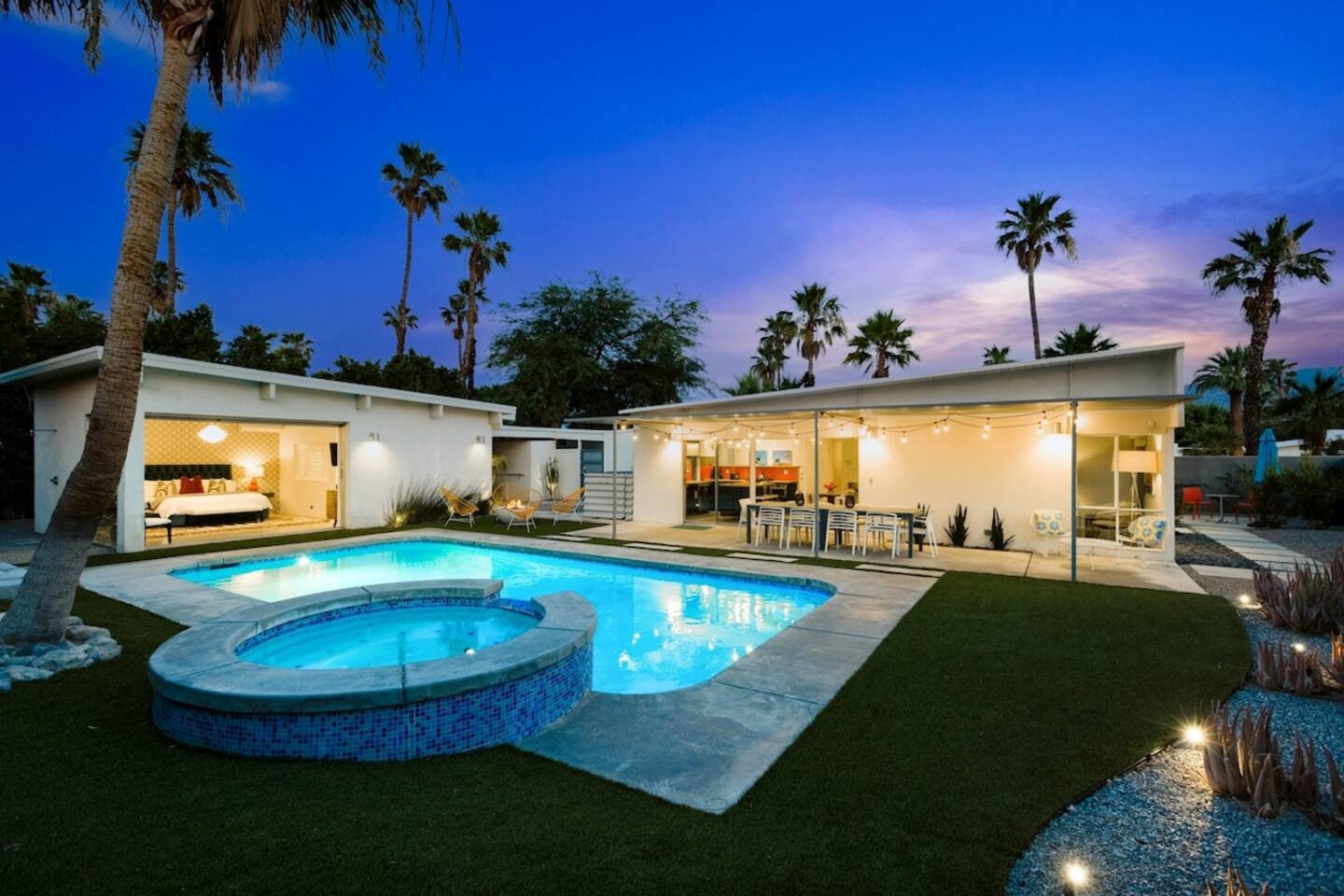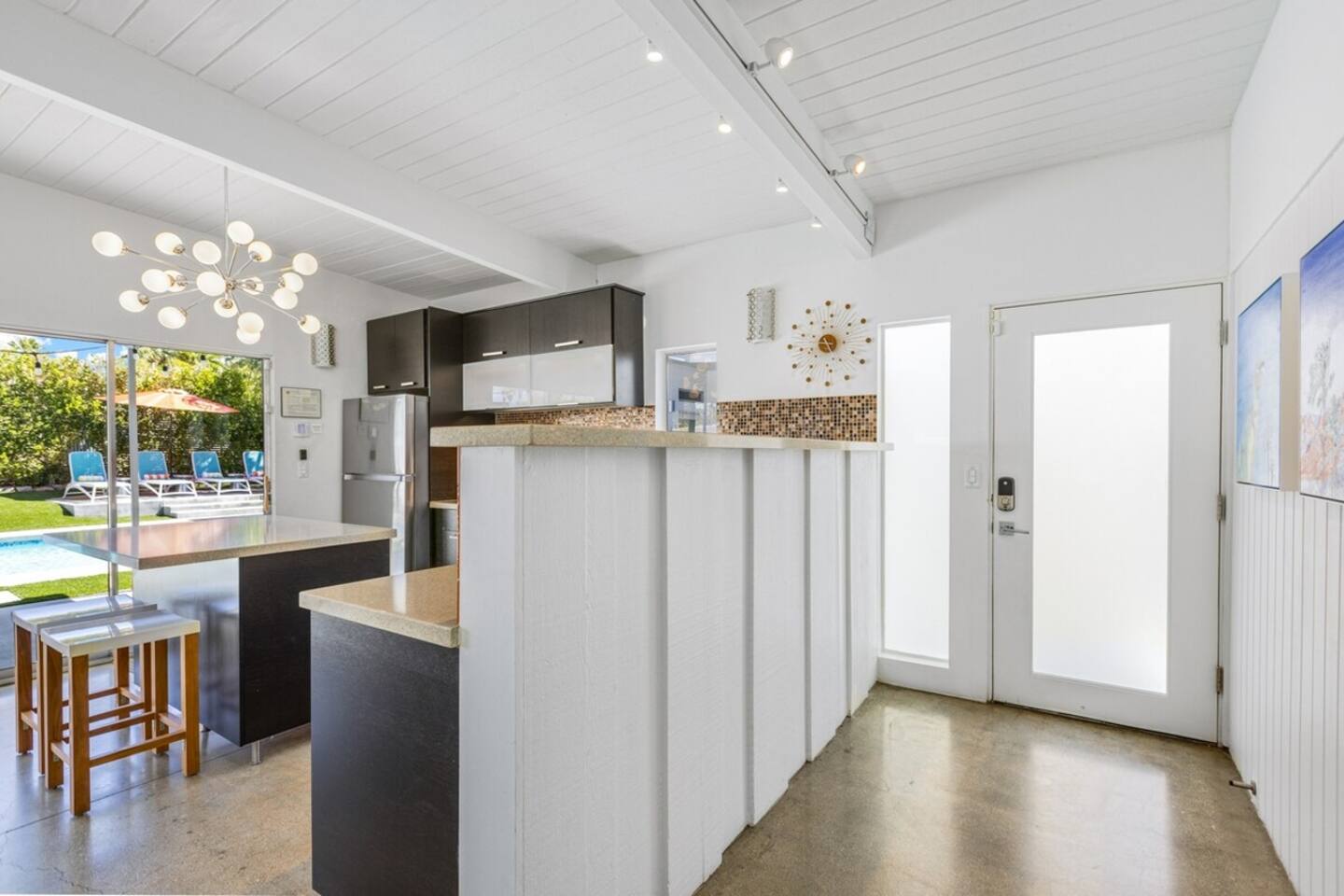 The main house has a modern kitchen with a Jennair range, island and stainless steel appliances. The primary bedroom has a king size bed with mountain view, smart tv and en suite bathroom. Guest bedroom 2 has a king bed, smart tv and workspace area. Guest bedroom 3 has a queen size bed and smart tv. A recently added poolside detached casita offers a deluxe his and hers bathroom and king size bed, with an oversize glass wall that opens on to the pool. Relax in the salt water pool, and enjoy the amazing views of palm trees and the San Jacinto Mountain. The very private back yard offers a resort style experience , including a spa , fire pit , ping pong table, corn hole, dining table and Weber grille.
