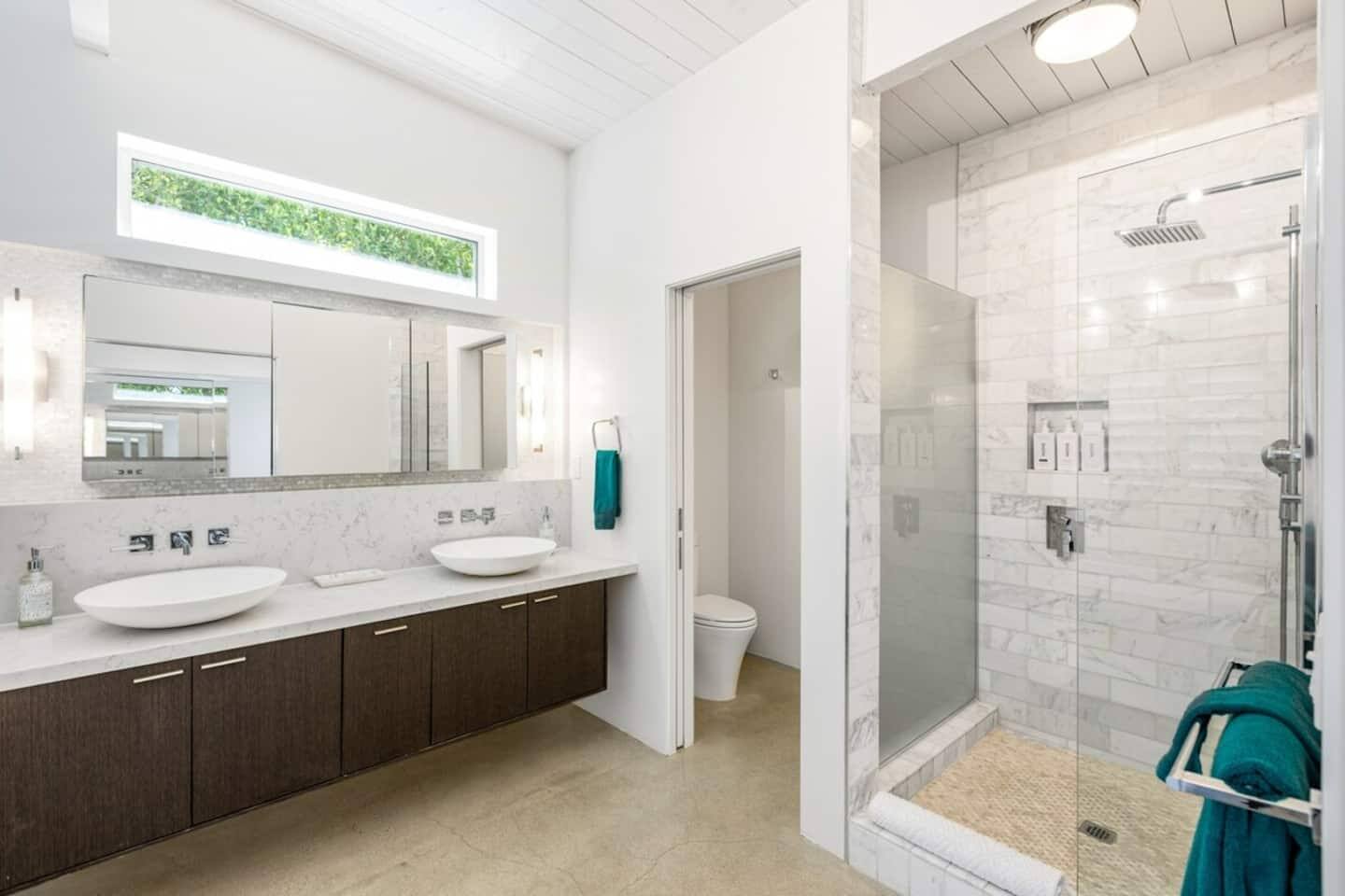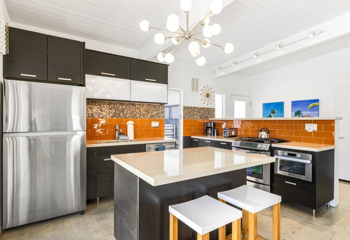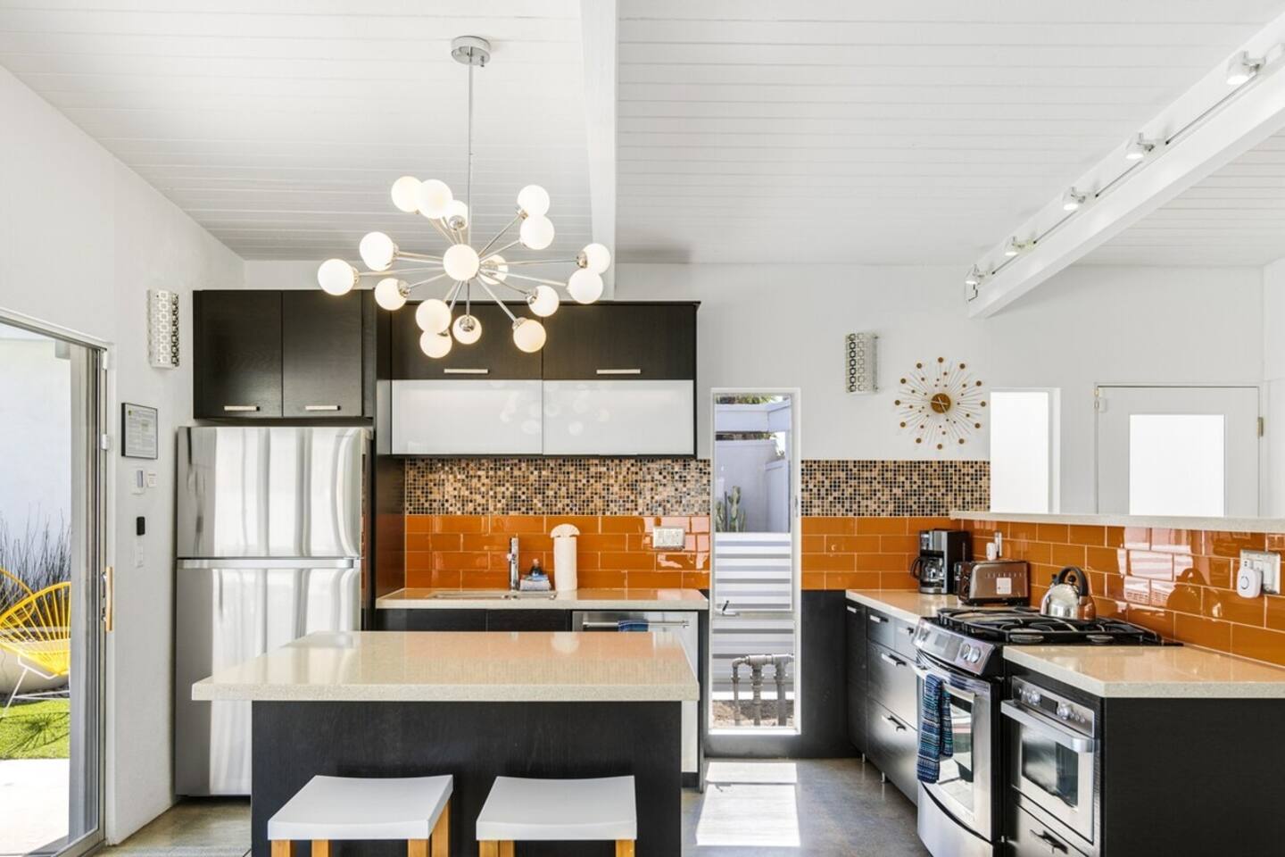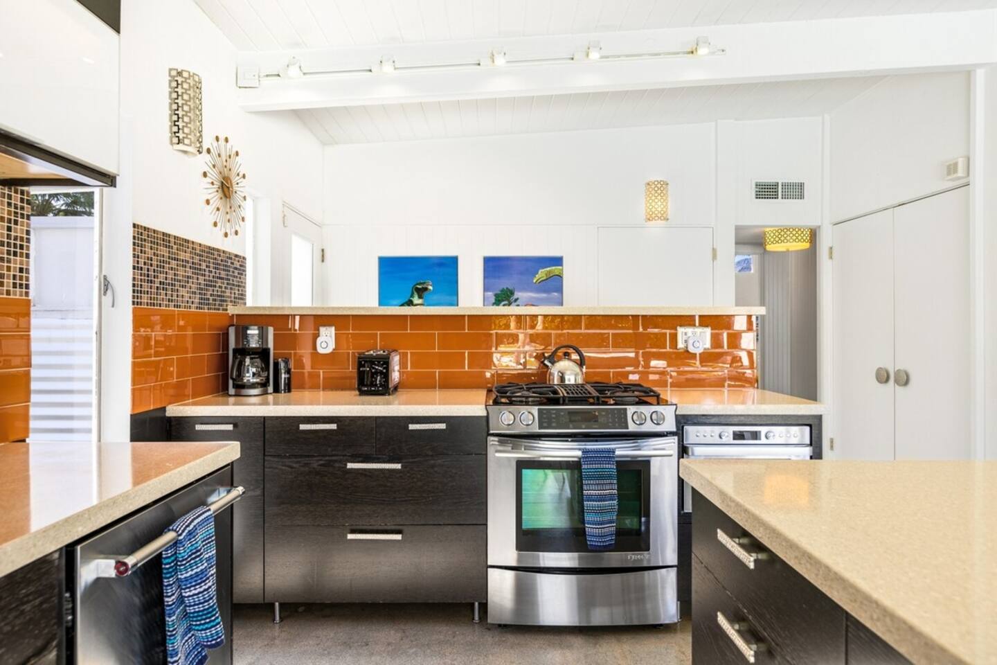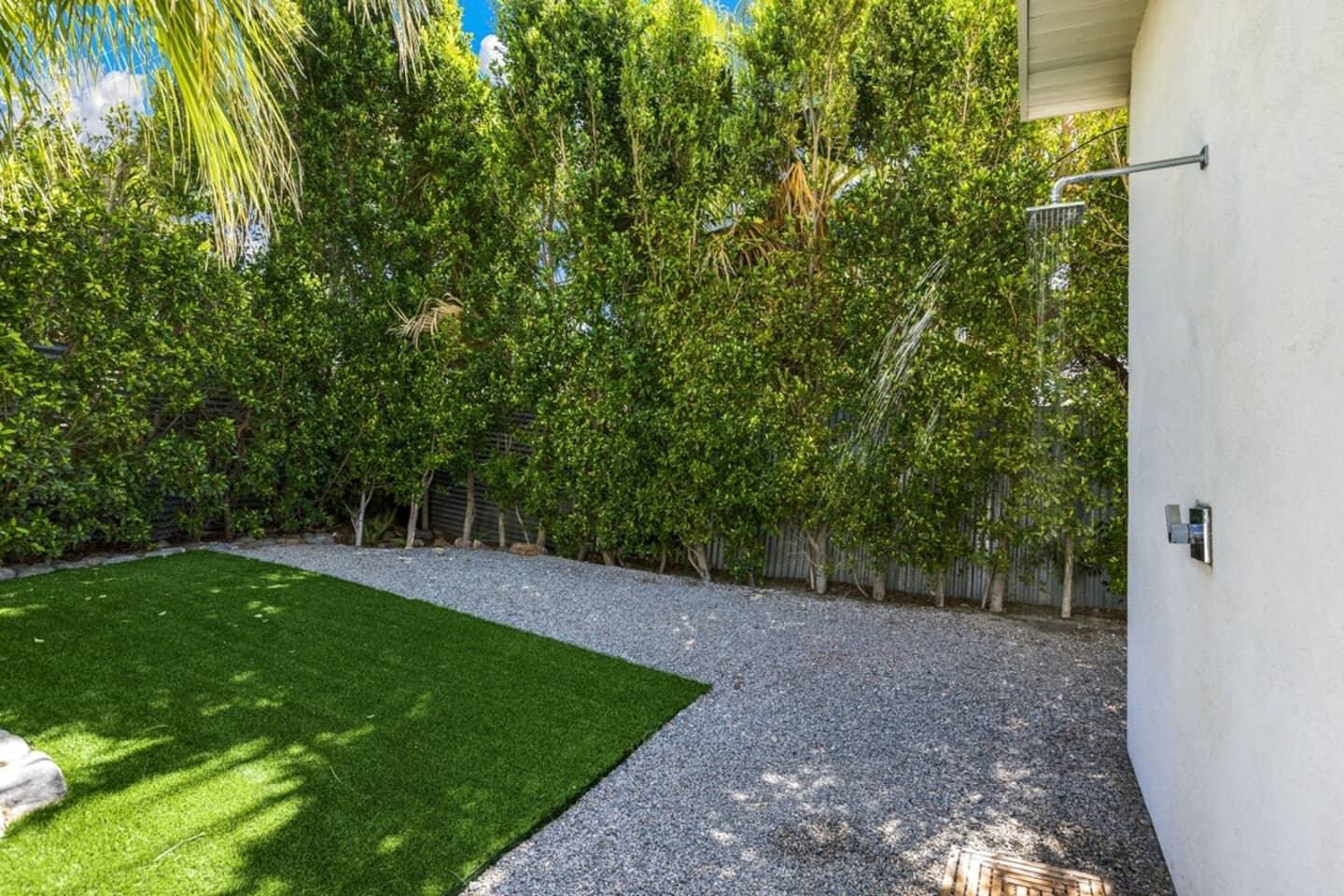 The main house has a modern kitchen with a Jennair range, island and stainless steel appliances. The primary bedroom has a king size bed with mountain view, smart tv and en suite bathroom. Guest bedroom 2 has a king bed, smart tv and workspace area. Guest bedroom 3 has a queen size bed and smart tv. A recently added poolside detached casita offers a deluxe his and hers bathroom and king size bed, with an oversize glass wall that opens on to the pool. Relax in the salt water pool, and enjoy the amazing views of palm trees and the San Jacinto Mountain. The very private back yard offers a resort style experience , including a spa , fire pit , ping pong table, corn hole, dining table and Weber grille.
